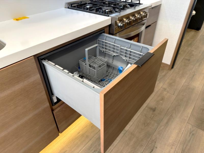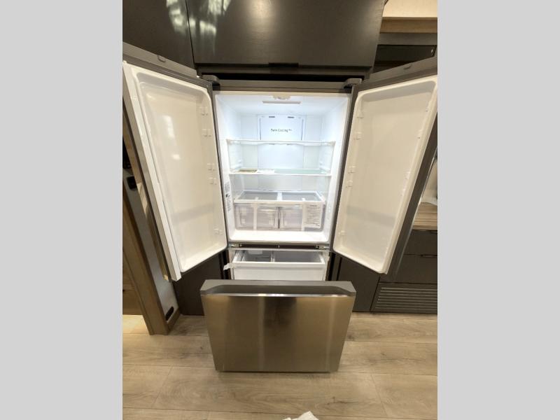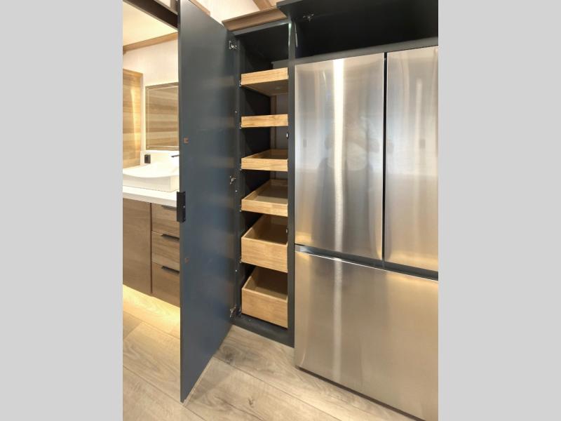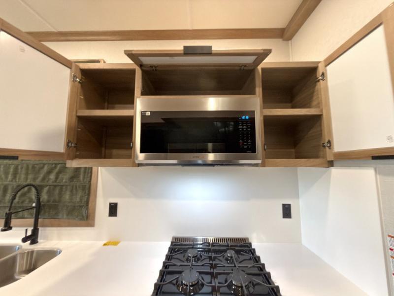 For those who appreciate a destination trailer easier to maintain, this slide-less unit will be perfect for you! Your crew can relax comfortably in the front living area that includes an L-shaped sleeper sofa across from an entertainment center or enjoy the views out the window in front of the countertop with chairs. The full kitchen will allow you to make your best home-cooked meals, and the spacious walk-through bath is easily accessible. You're sure to love the rear bedroom that includes a queen bed with a king bed option, along with dual bedroom closets to keep everything organized!