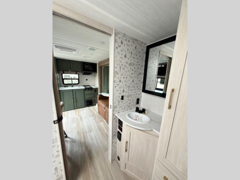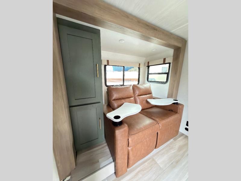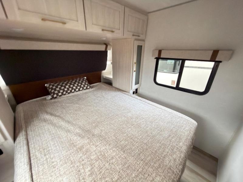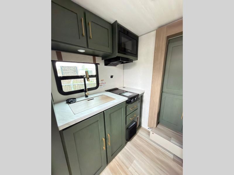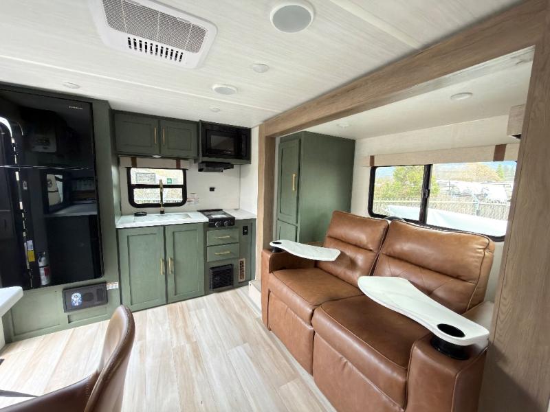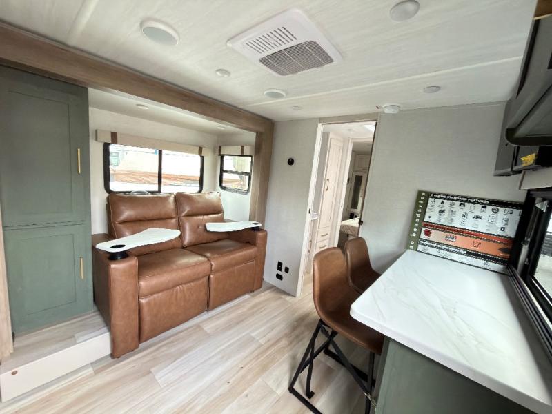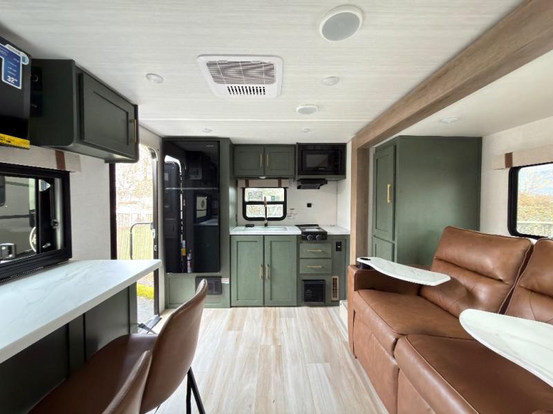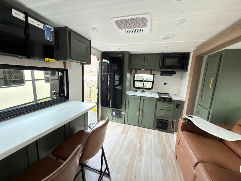 You'll love camping in this couple's trailer! There is a queen bed in the front bedroom, along with dual bedside wardrobes and overhead storage for clothes, books and more. And don't overlook the spacious walk-thru bath! Once you've made breakfast in the rear kitchen or on the outside kitchen, you can dine at the bar top with chairs and a flip-up window. There is also a Trailgate Outdoor Bar if you decide to dine outdoors!