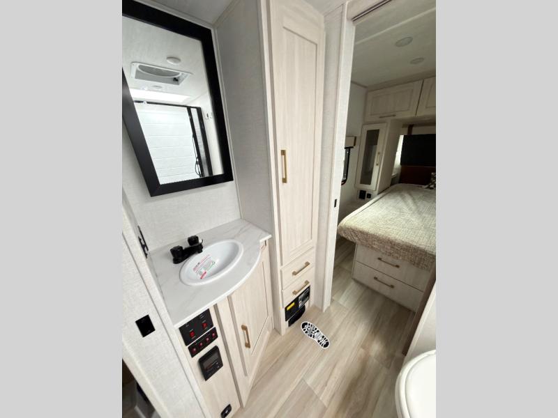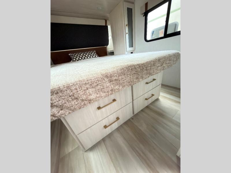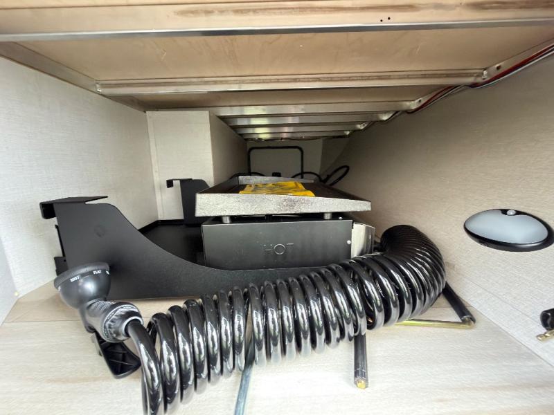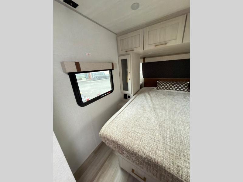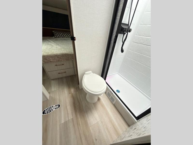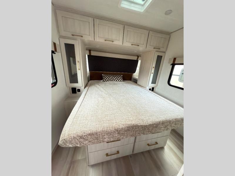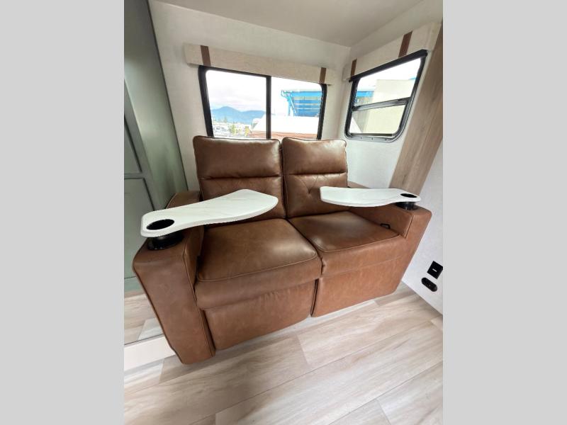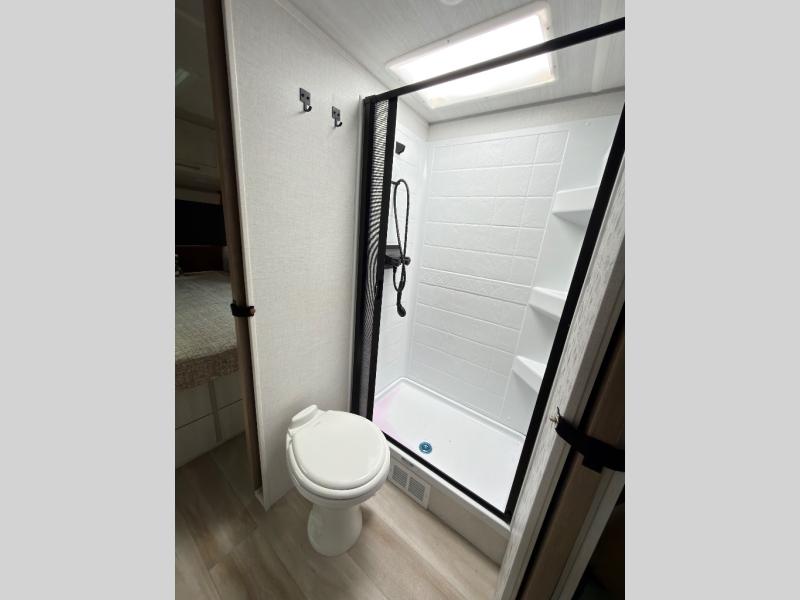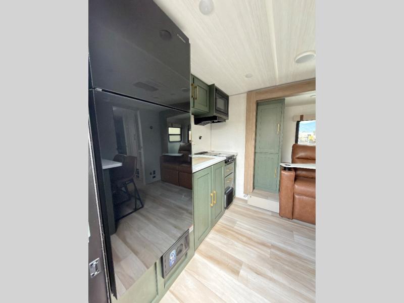 You'll love camping in this couple's trailer! There is a queen bed in the front bedroom, along with dual bedside wardrobes and overhead storage for clothes, books and more. And don't overlook the spacious walk-thru bath! Once you've made breakfast in the rear kitchen or on the outside kitchen, you can dine at the bar top with chairs and a flip-up window. There is also a Trailgate Outdoor Bar if you decide to dine outdoors!