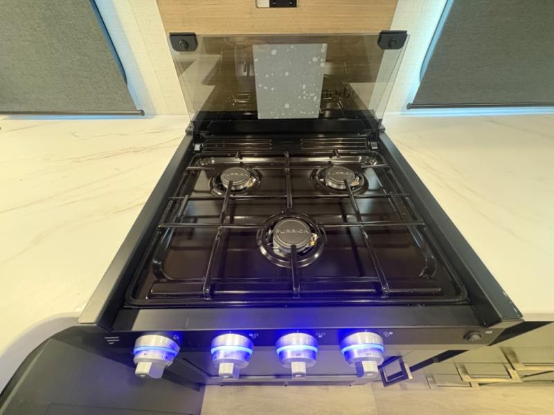 Compact yet efficient interior for sleeping, cooking, and relaxing