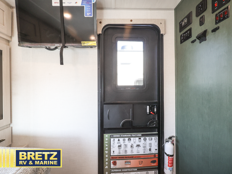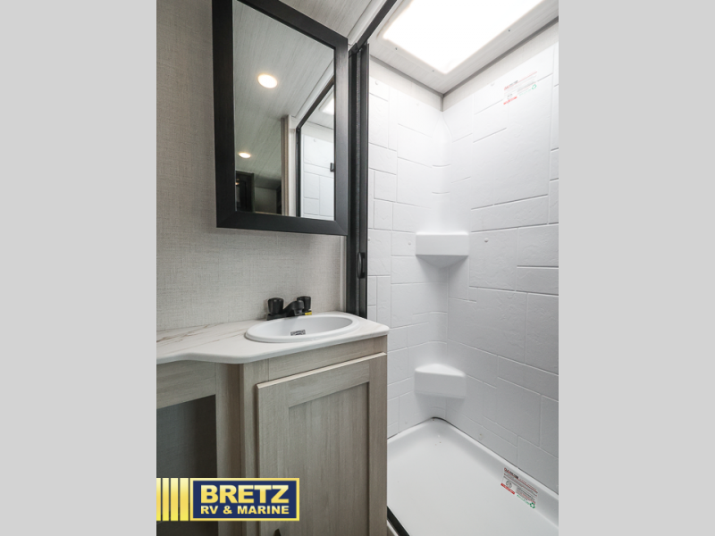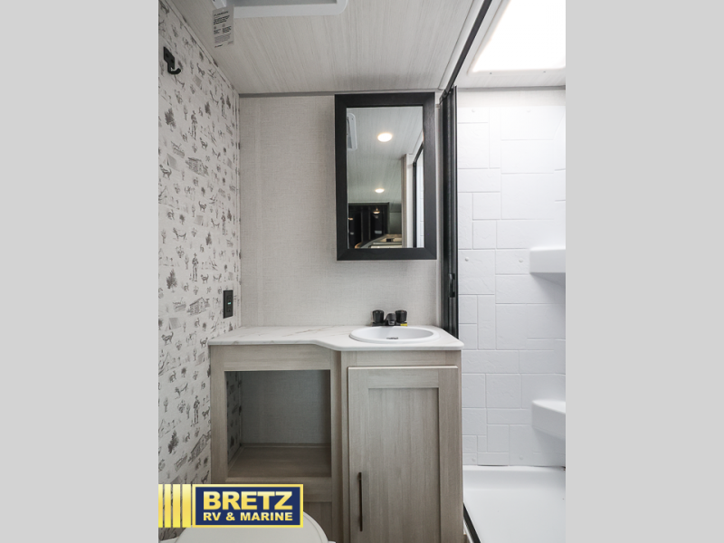 This easy to tow trailer is perfect for weekend trips to the lake! Once you're set up at camp, put out the patio awning, make lunch on the outside kitchen, and grab your camp chairs from the slam latch cargo doors with pass-thru lighting. A jackknife sofa inside will provide a place to relax in the evenings, and a full bath means you won't have to use the camp's facilities. The rear corner kitchen includes a microwave and cooktop, plus a pantry and refrigerator for food storage. When it's time to call it a night, the front queen bed is sure to bring comfort!