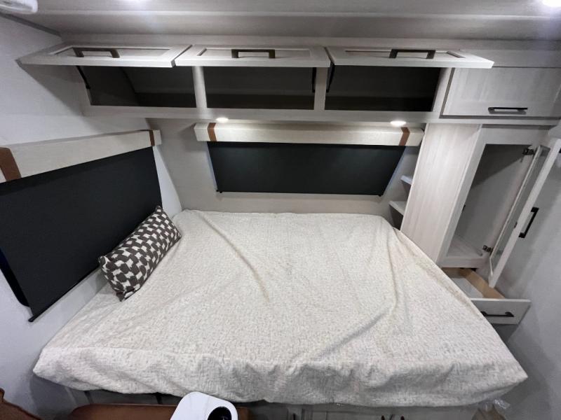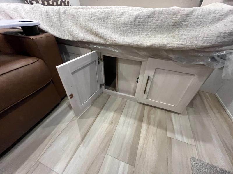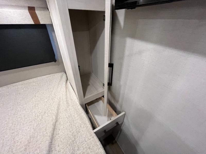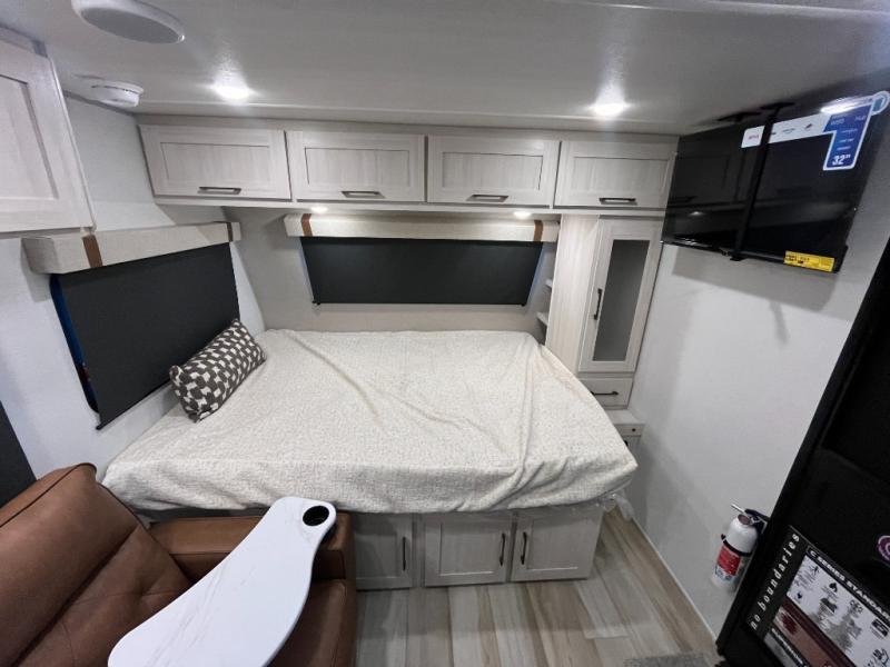 This easy to tow trailer is perfect for weekend trips to the lake! Once you're set up at camp, put out the patio awning, make lunch on the outside kitchen, and grab your camp chairs from the slam latch cargo doors with pass-thru lighting. A jackknife sofa inside will provide a place to relax in the evenings, and a full bath means you won't have to use the camp's facilities. The rear corner kitchen includes a microwave and cooktop, plus a pantry and refrigerator for food storage. When it's time to call it a night, the front queen bed is sure to bring comfort!