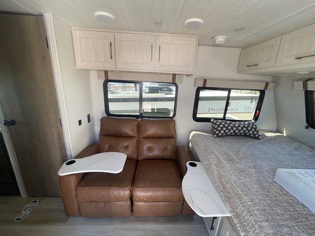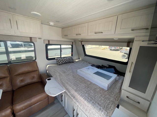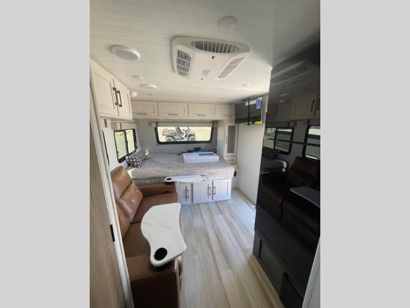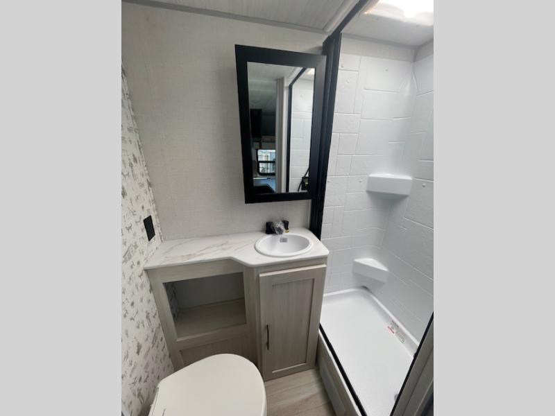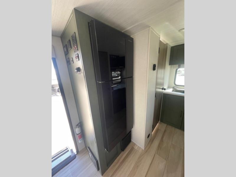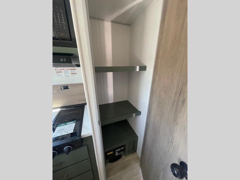 This easy to tow trailer is perfect for weekend trips to the lake! Once you're set up at camp, put out the patio awning, make lunch on the outside kitchen, and grab your camp chairs from the slam latch cargo doors with pass-thru lighting. A jackknife sofa inside will provide a place to relax in the evenings, and a full bath means you won't have to use the camp's facilities. The rear corner kitchen includes a microwave and cooktop, plus a pantry and refrigerator for food storage. When it's time to call it a night, the front queen bed is sure to bring comfort!