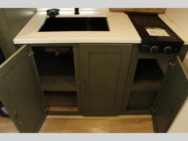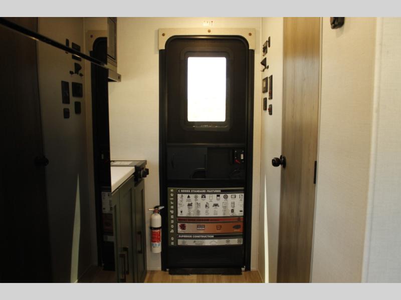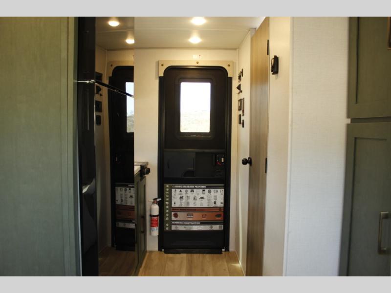 This easy to tow trailer is perfect for weekend trips to the lake! Once you're set up at camp, put out the patio awning, make lunch on the outside kitchen, and grab your camp chairs from the slam latch cargo doors with pass-thru lighting. The kitchen includes a cooktop and microwave, plus a pantry and refrigerator for food storage. When it's time to call it a night, the front queen bed with a U-shaped dinette is sure to bring comfort! When the optional Beast Mode Package on this model is chosen, you'll enjoy a 400-watt solar package, a fresh water filter, a Maxxair roof vent cover, plus a Beast Mode independent suspension for better handling.