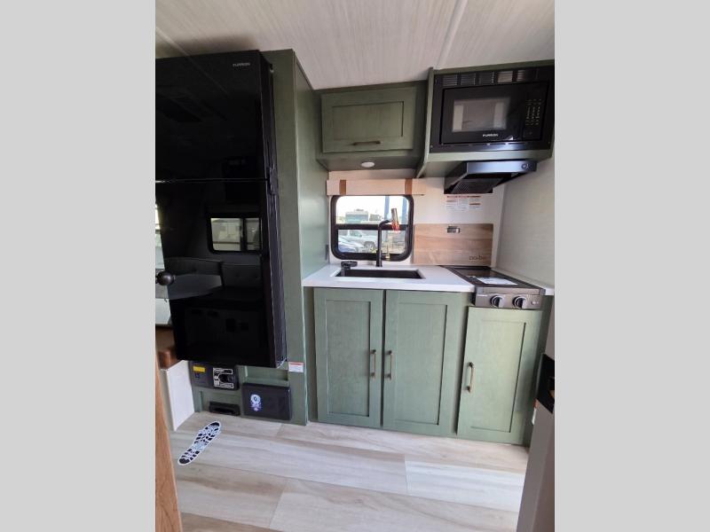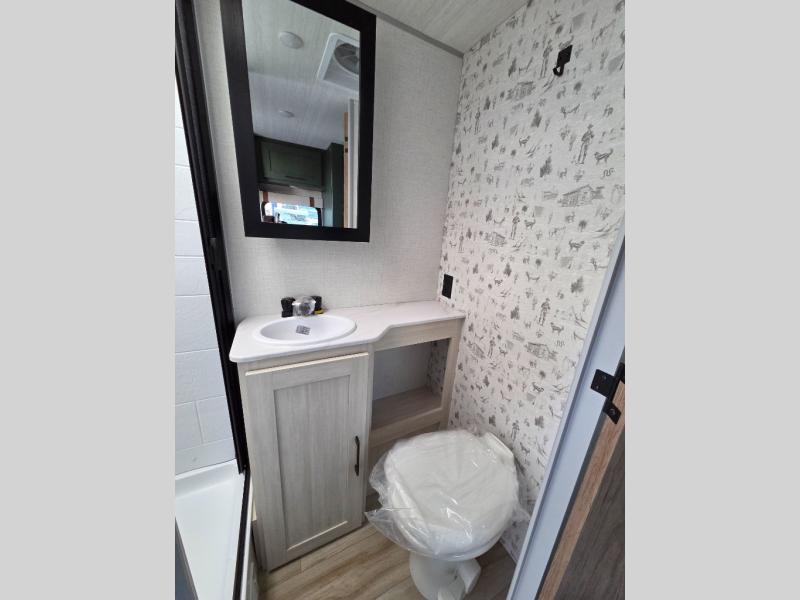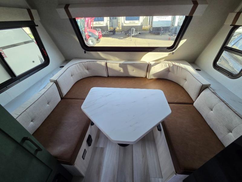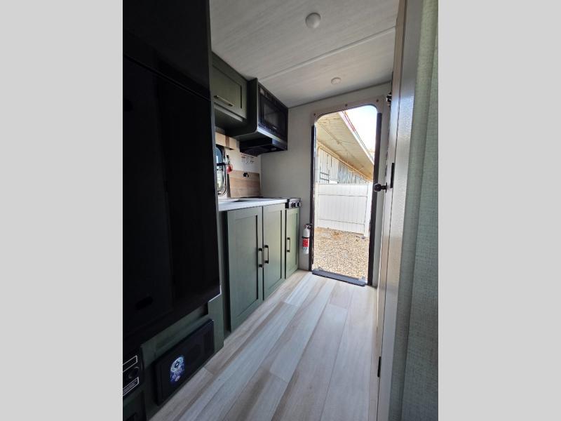 This easy to tow trailer is perfect for weekend trips to the lake! Once you're set up at camp, put out the patio awning, make lunch on the outside kitchen, and grab your camp chairs from the slam latch cargo doors with pass-thru lighting. The kitchen includes a cooktop and microwave, plus a pantry and refrigerator for food storage. When it's time to call it a night, the front queen bed with a U-shaped dinette is sure to bring comfort! When the optional Beast Mode Package on this model is chosen, you'll enjoy a 400-watt solar package, a fresh water filter, a Maxxair roof vent cover, plus a Beast Mode independent suspension for better handling.