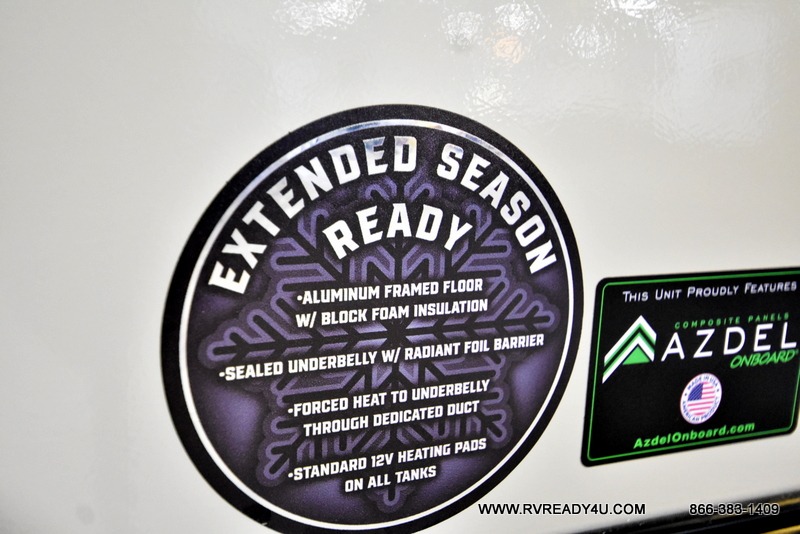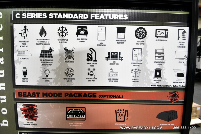This easy to tow trailer is perfect for weekend trips to the lake! Once you're set up at camp, put out the patio awning, make lunch on the outside kitchen, and grab your camp chairs from the slam latch cargo doors with pass-thru lighting. The kitchen includes a cooktop and microwave, plus a pantry and refrigerator for food storage. When it's time to call it a night, the front queen bed with a U-shaped dinette is sure to bring comfort! When the optional Beast Mode Package on this model is chosen, you'll enjoy a 400-watt solar package, a fresh water filter, a Maxxair roof vent cover, plus a Beast Mode independent suspension for better handling.