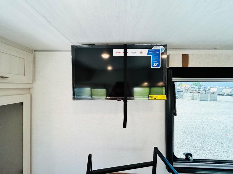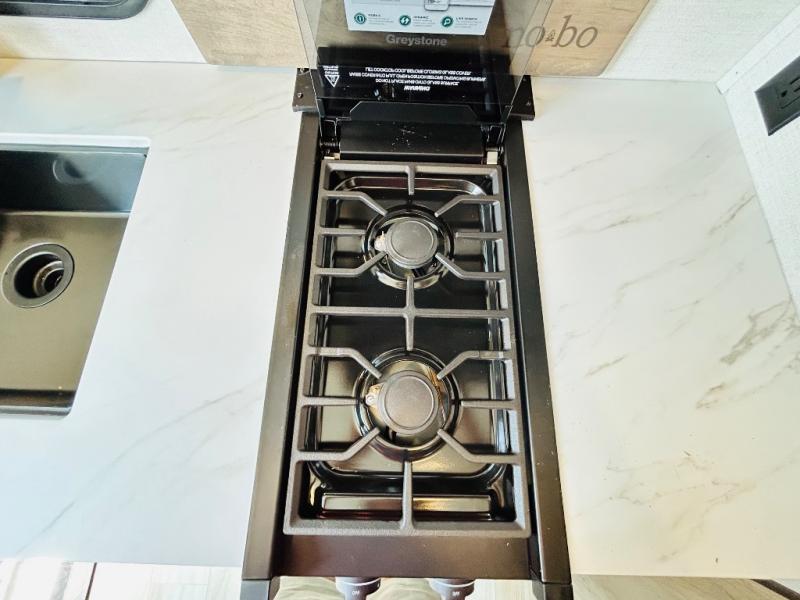 This easy to tow trailer is perfect for weekend trips to the lake! Once you're set up at camp, put out the patio awning, make lunch on the outside kitchen, and grab your camp chairs from the slam latch cargo doors with pass-thru lighting. A jackknife sofa inside will provide a place to relax in the evenings, and a full bath means you won't have to use the camp's facilities. There is also a bar top with two seats and a flip-up window where you can enjoy your morning coffee at! The rear corner kitchen includes microwave and cooktop plus a pantry and refrigerator for food storage. When it's time to call it a night, the front queen bed is sure to bring comfort!