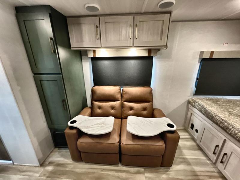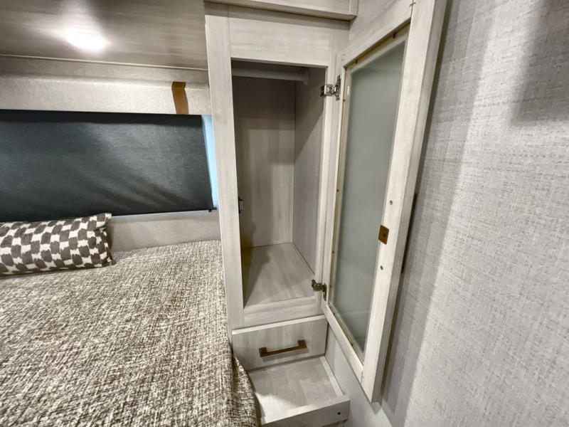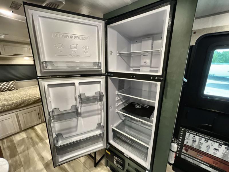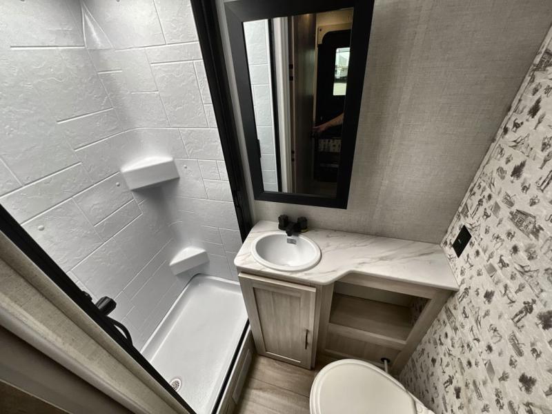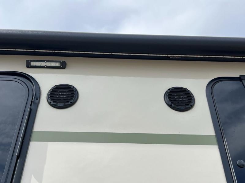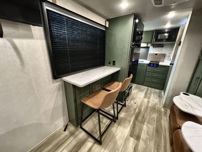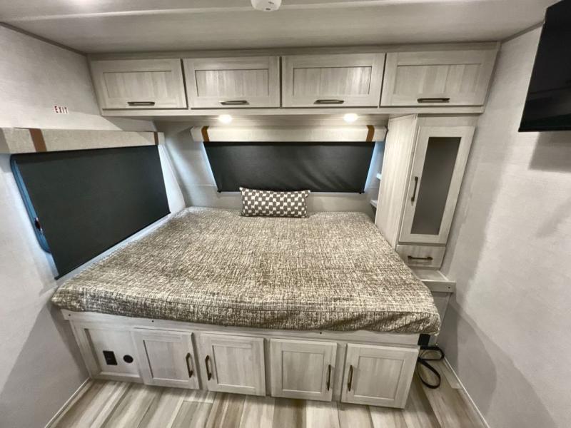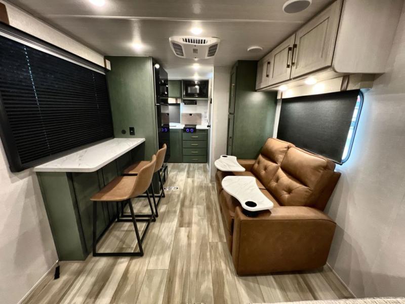 This easy to tow trailer is perfect for weekend trips to the lake! Once you're set up at camp, put out the patio awning, make lunch on the outside kitchen, and grab your camp chairs from the slam latch cargo doors with pass-thru lighting. A jackknife sofa inside will provide a place to relax in the evenings, and a full bath means you won't have to use the camp's facilities. There is also a bar top with two seats and a flip-up window where you can enjoy your morning coffee at! The rear corner kitchen includes microwave and cooktop plus a pantry and refrigerator for food storage. When it's time to call it a night, the front queen bed is sure to bring comfort!