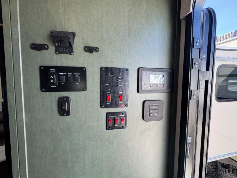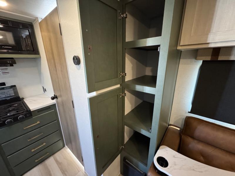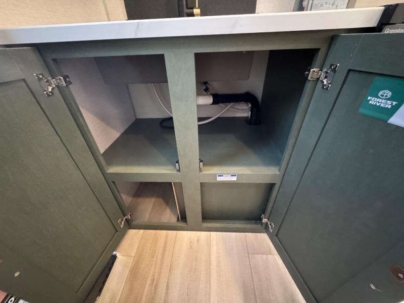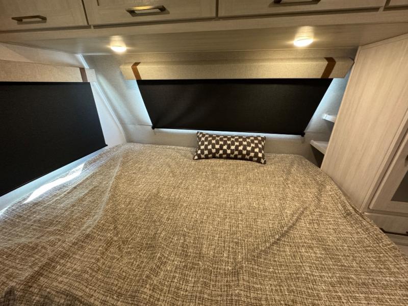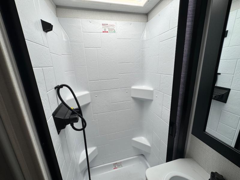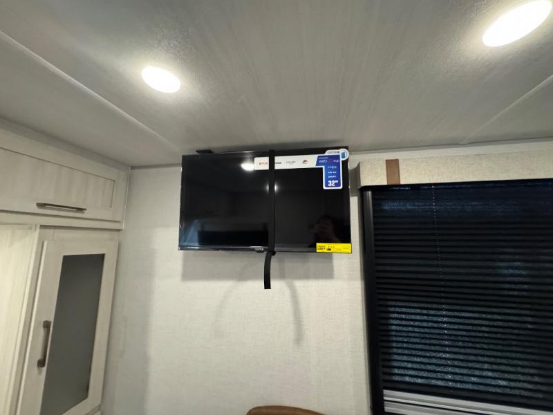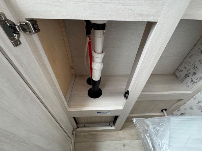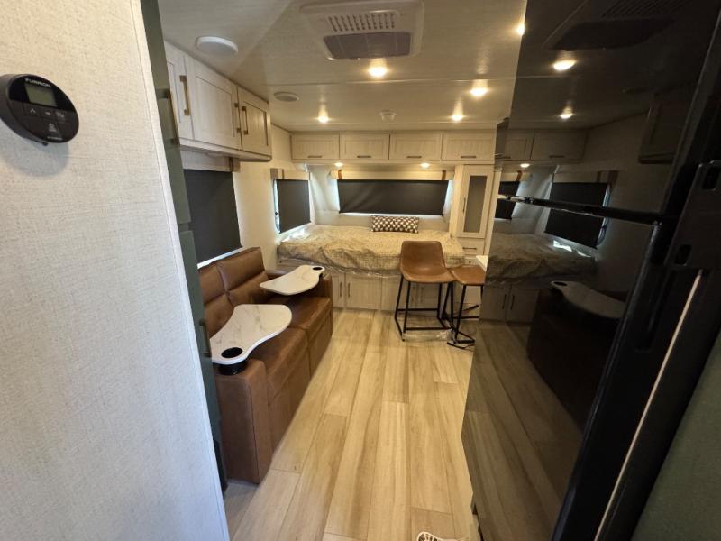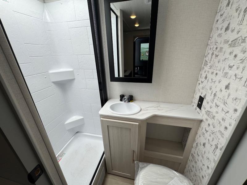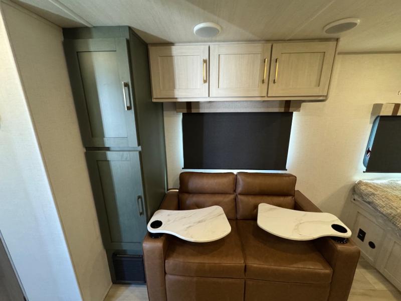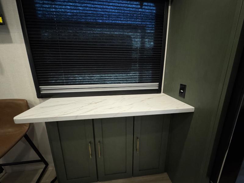 This easy to tow trailer is perfect for weekend trips to the lake! Once you're set up at camp, put out the patio awning, make lunch on the outside kitchen, and grab your camp chairs from the slam latch cargo doors with pass-thru lighting. A jackknife sofa inside will provide a place to relax in the evenings, and a full bath means you won't have to use the camp's facilities. There is also a bar top with two seats and a flip-up window where you can enjoy your morning coffee at! The rear corner kitchen includes microwave and cooktop plus a pantry and refrigerator for food storage. When it's time to call it a night, the front queen bed is sure to bring comfort!