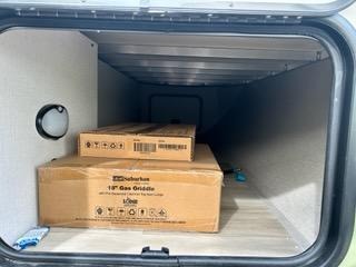 This easy to tow trailer is perfect for weekend trips to the lake! Once you're set up at camp, put out the patio awning, make lunch on the outside kitchen, and grab your camp chairs from the slam latch cargo doors with pass-thru lighting. A jackknife sofa inside will provide a place to relax in the evenings, and a full bath means you won't have to use the camp's facilities. There is also a bar top with two seats and a flip-up window where you can enjoy your morning coffee at! The rear corner kitchen includes microwave and cooktop plus a pantry and refrigerator for food storage. When it's time to call it a night, the front queen bed is sure to bring comfort!