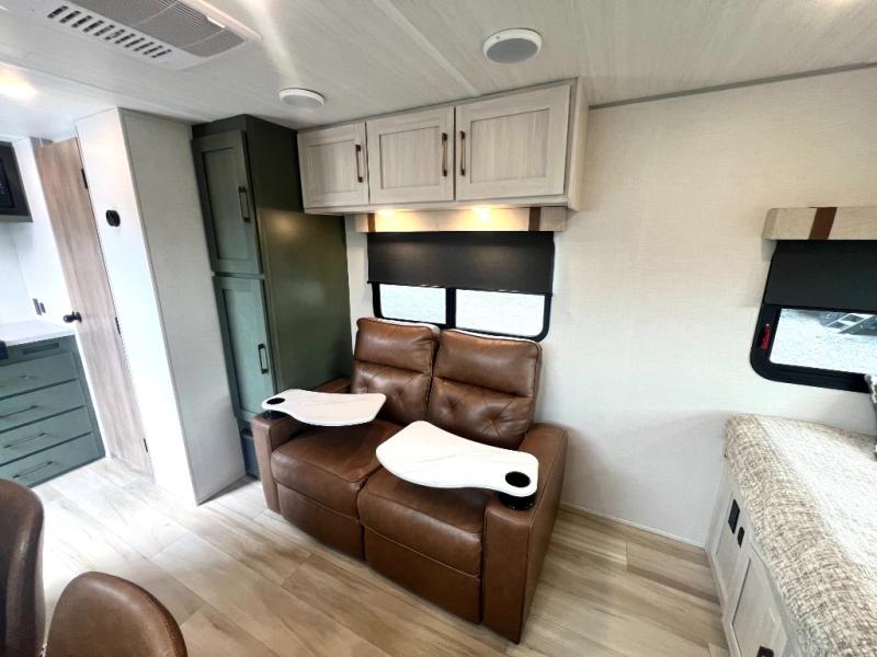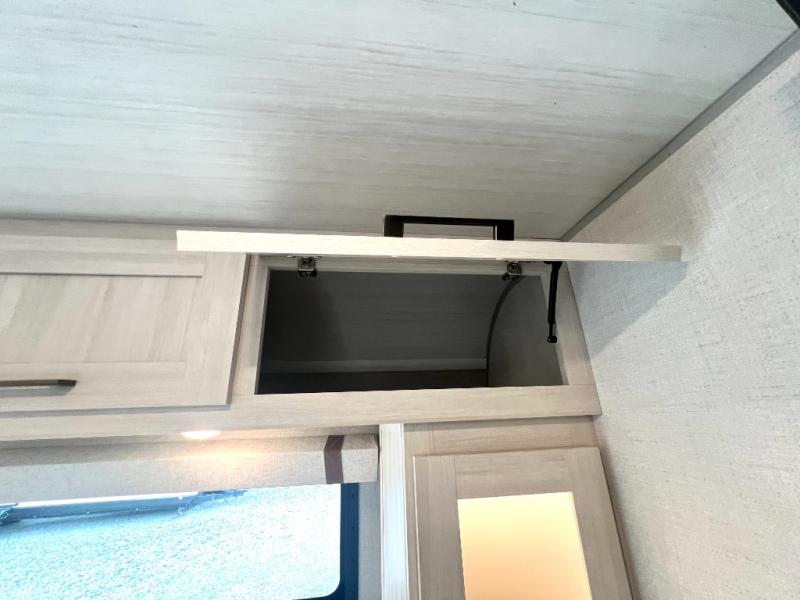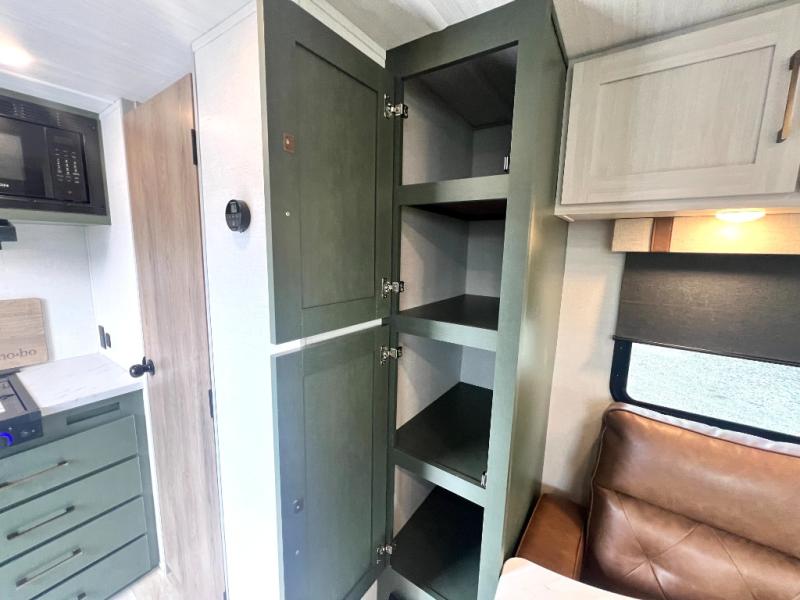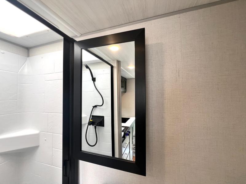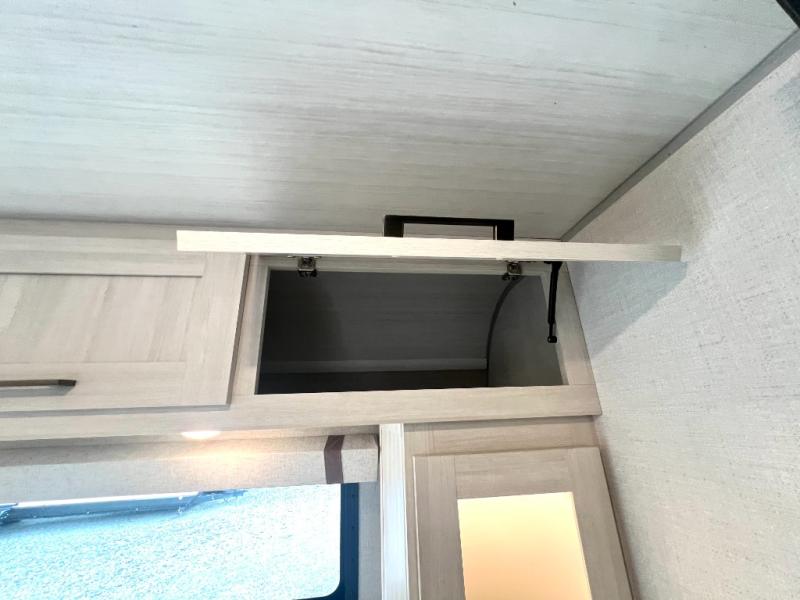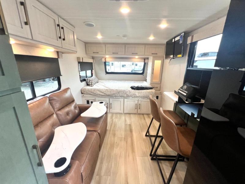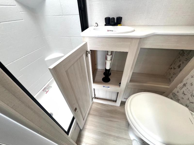 This easy to tow trailer is perfect for weekend trips to the lake! Once you're set up at camp, put out the patio awning, make lunch on the outside kitchen, and grab your camp chairs from the slam latch cargo doors with pass-thru lighting. A jackknife sofa inside will provide a place to relax in the evenings, and a full bath means you won't have to use the camp's facilities. There is also a bar top with two seats and a flip-up window where you can enjoy your morning coffee at! The rear corner kitchen includes microwave and cooktop plus a pantry and refrigerator for food storage. When it's time to call it a night, the front queen bed is sure to bring comfort!