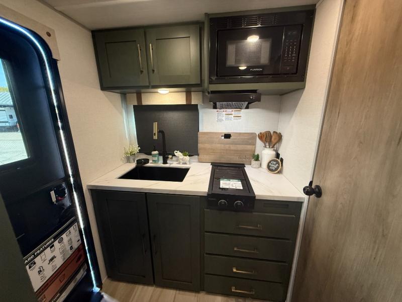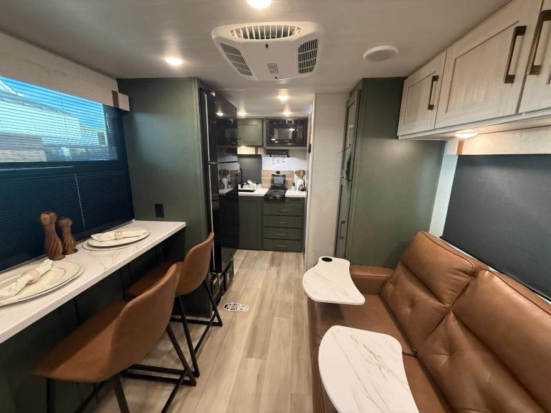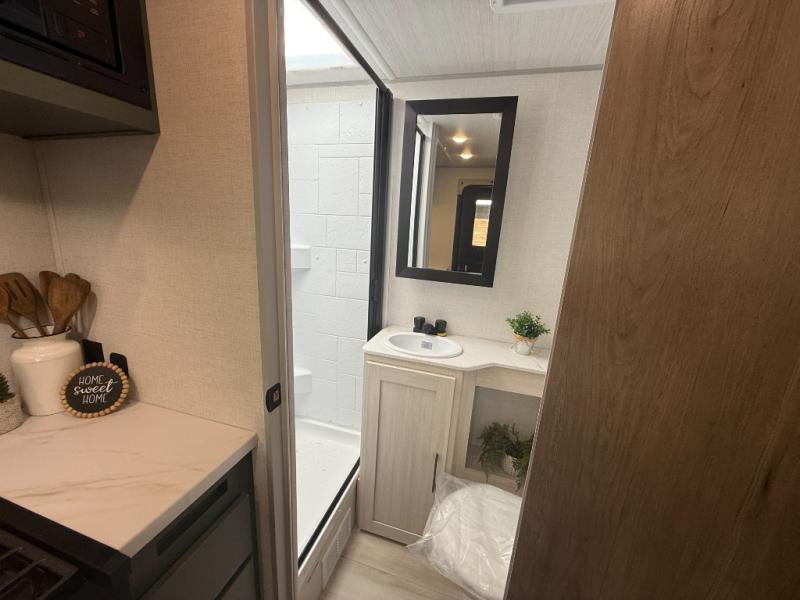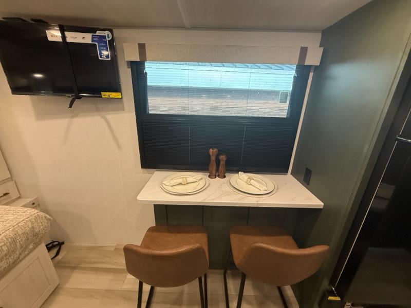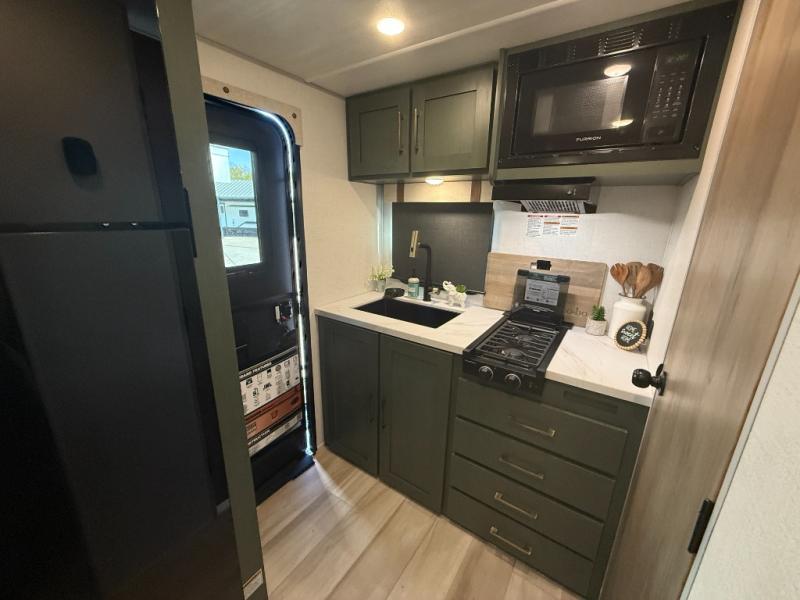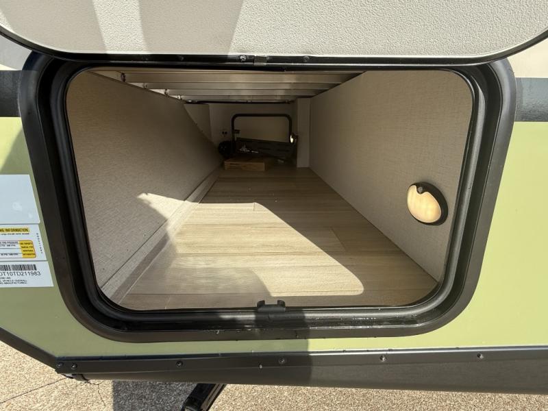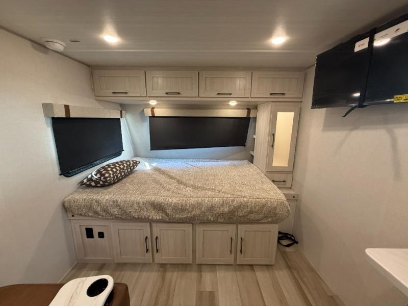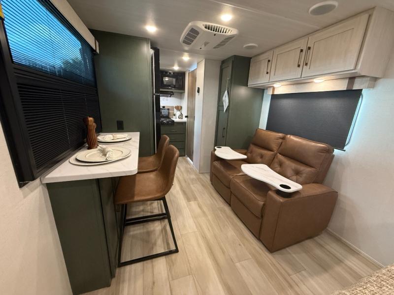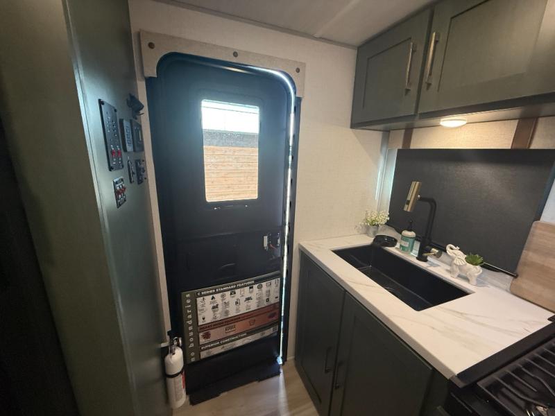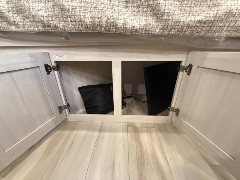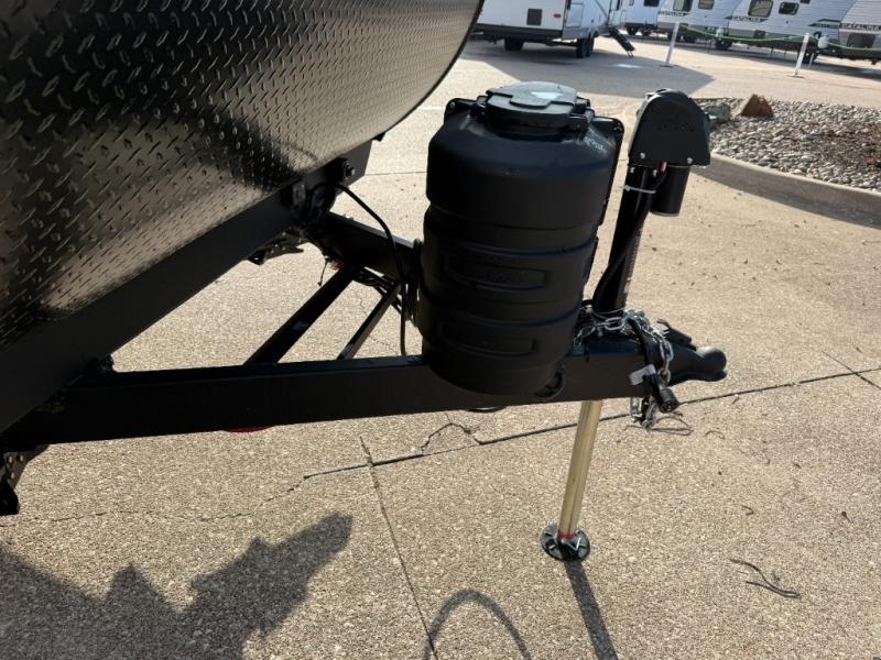 This easy to tow trailer is perfect for weekend trips to the lake! Once you're set up at camp, put out the patio awning, make lunch on the outside kitchen, and grab your camp chairs from the slam latch cargo doors with pass-thru lighting. A jackknife sofa inside will provide a place to relax in the evenings, and a full bath means you won't have to use the camp's facilities. There is also a bar top with two seats and a flip-up window where you can enjoy your morning coffee at! The rear corner kitchen includes microwave and cooktop plus a pantry and refrigerator for food storage. When it's time to call it a night, the front queen bed is sure to bring comfort! When the optional Beast Mode Package on this model is chosen, you'll enjoy a 400-watt solar package, a fresh water filter, a Maxxair roof vent cover, plus a Beast Mode independent suspension for better handling.