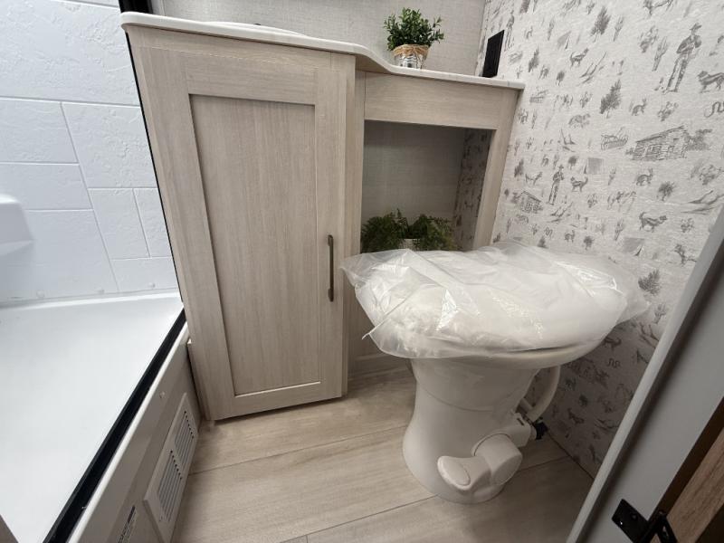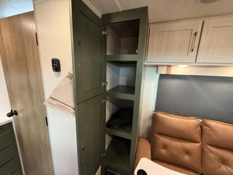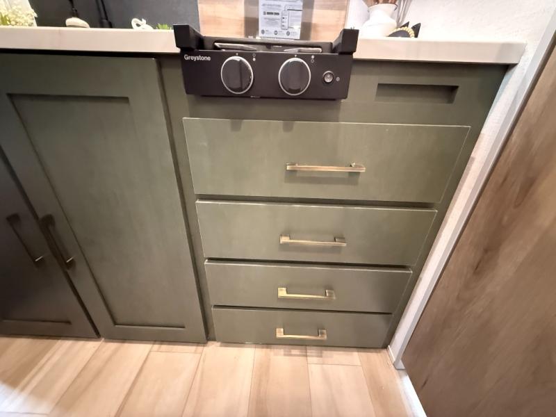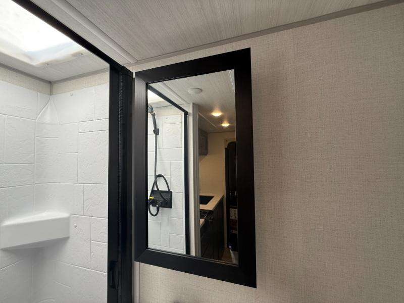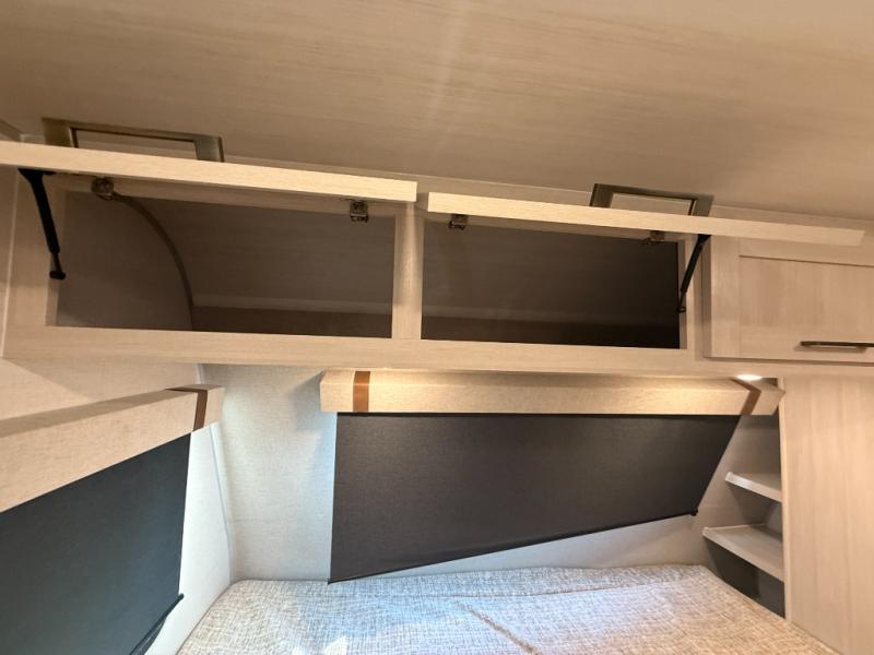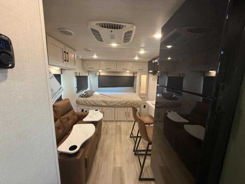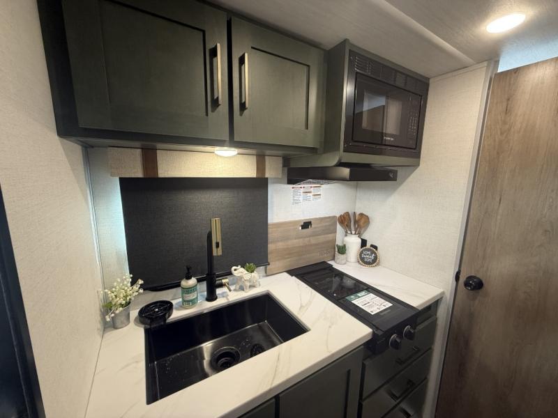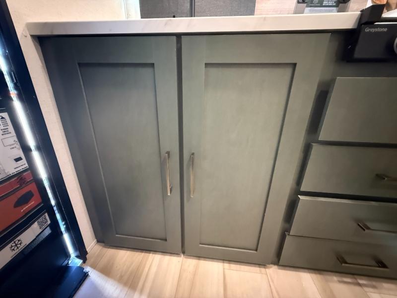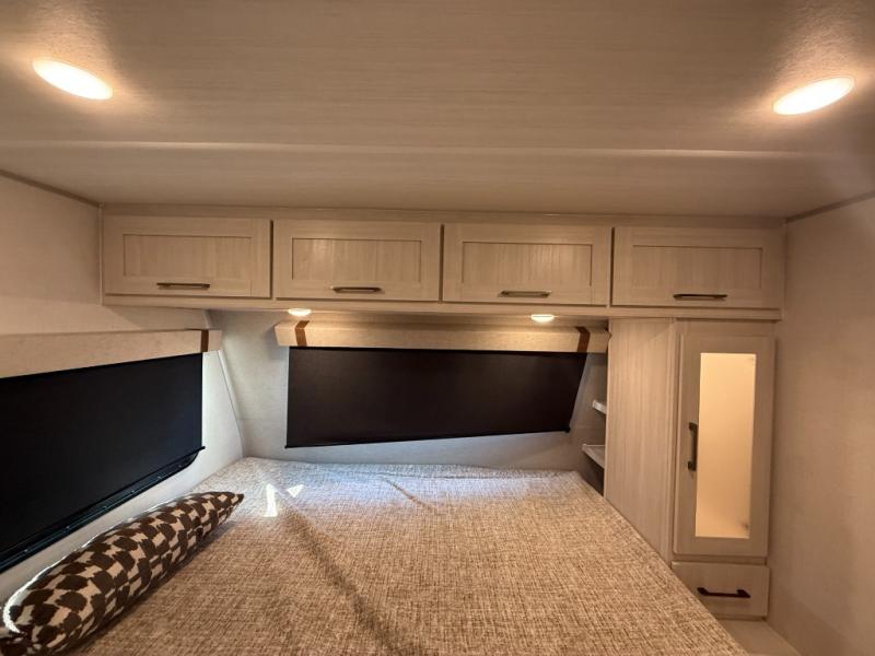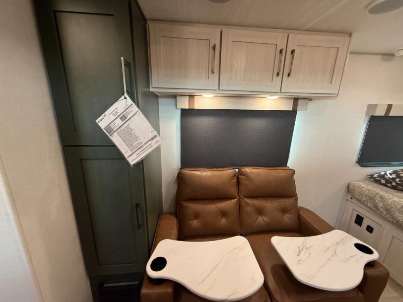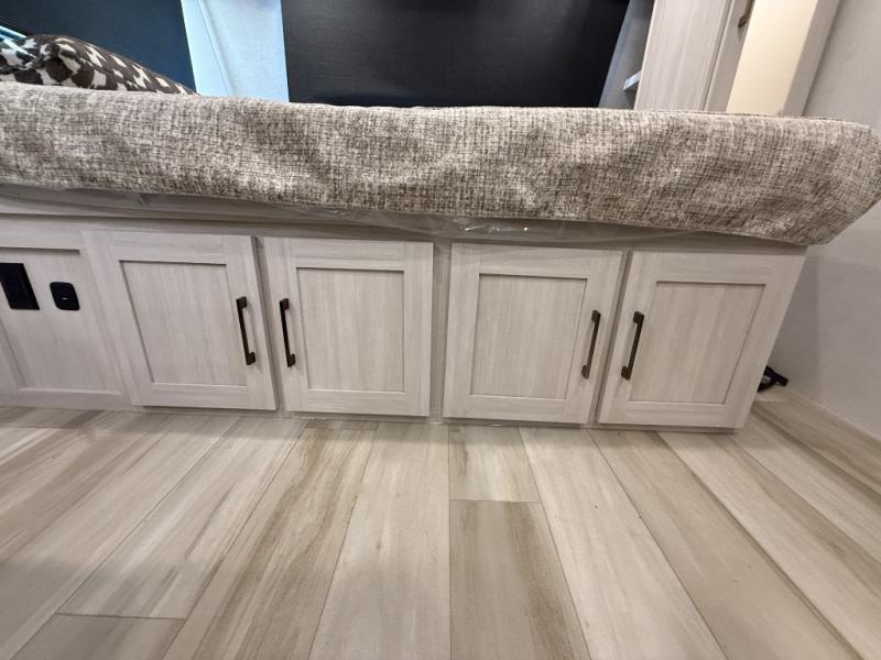This easy to tow trailer is perfect for weekend trips to the lake! Once you're set up at camp, put out the patio awning, make lunch on the outside kitchen, and grab your camp chairs from the slam latch cargo doors with pass-thru lighting. A jackknife sofa inside will provide a place to relax in the evenings, and a full bath means you won't have to use the camp's facilities. There is also a bar top with two seats and a flip-up window where you can enjoy your morning coffee at! The rear corner kitchen includes microwave and cooktop plus a pantry and refrigerator for food storage. When it's time to call it a night, the front queen bed is sure to bring comfort! When the optional Beast Mode Package on this model is chosen, you'll enjoy a 400-watt solar package, a fresh water filter, a Maxxair roof vent cover, plus a Beast Mode independent suspension for better handling.