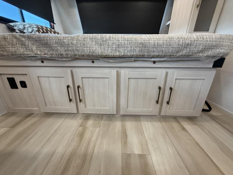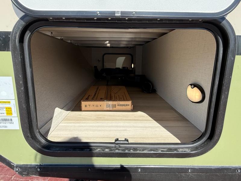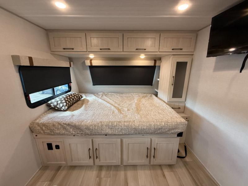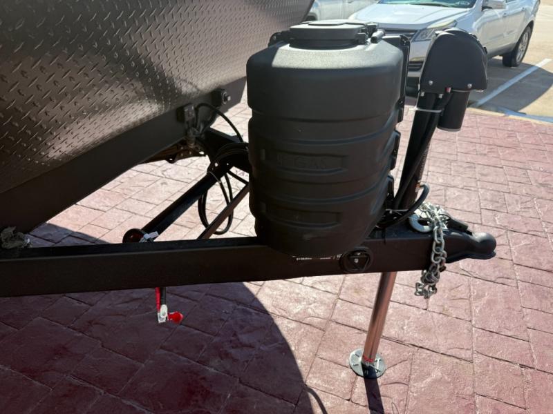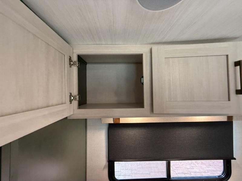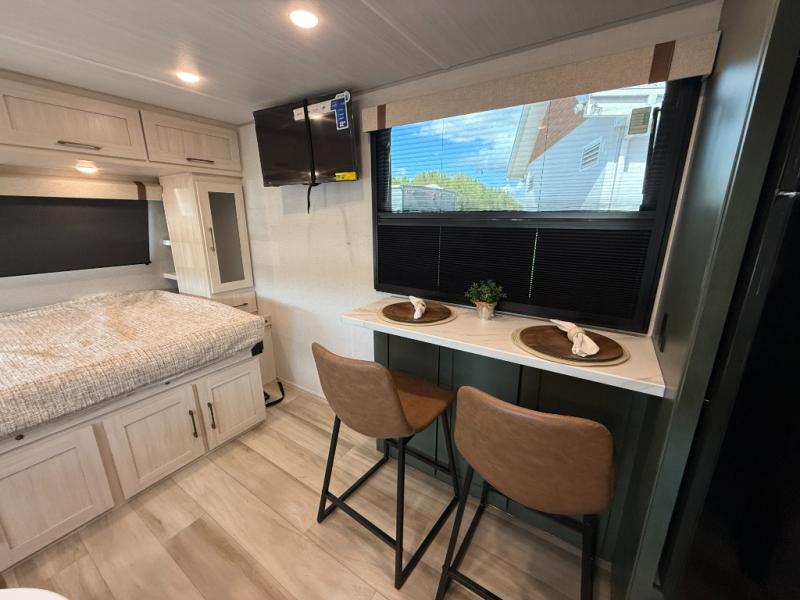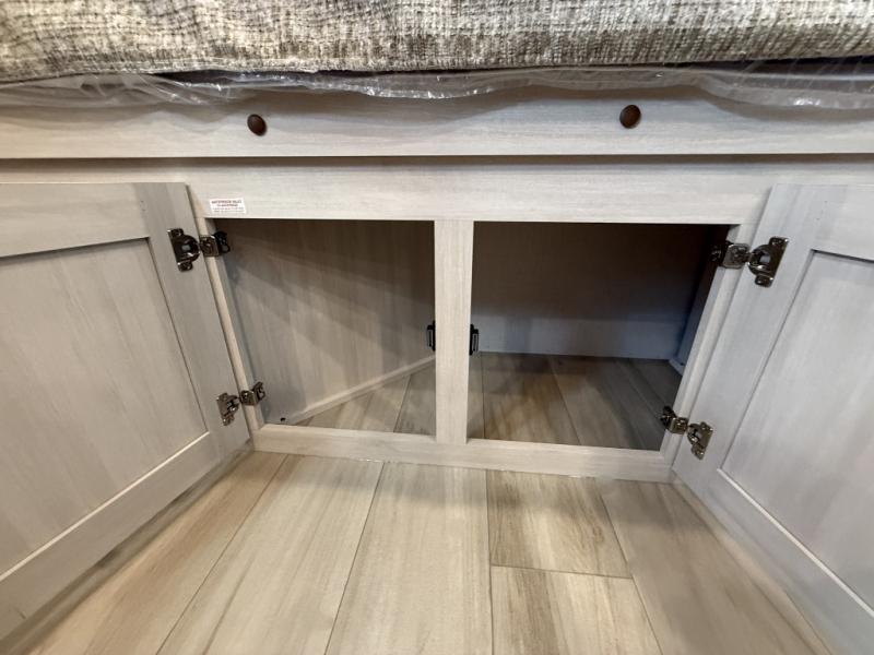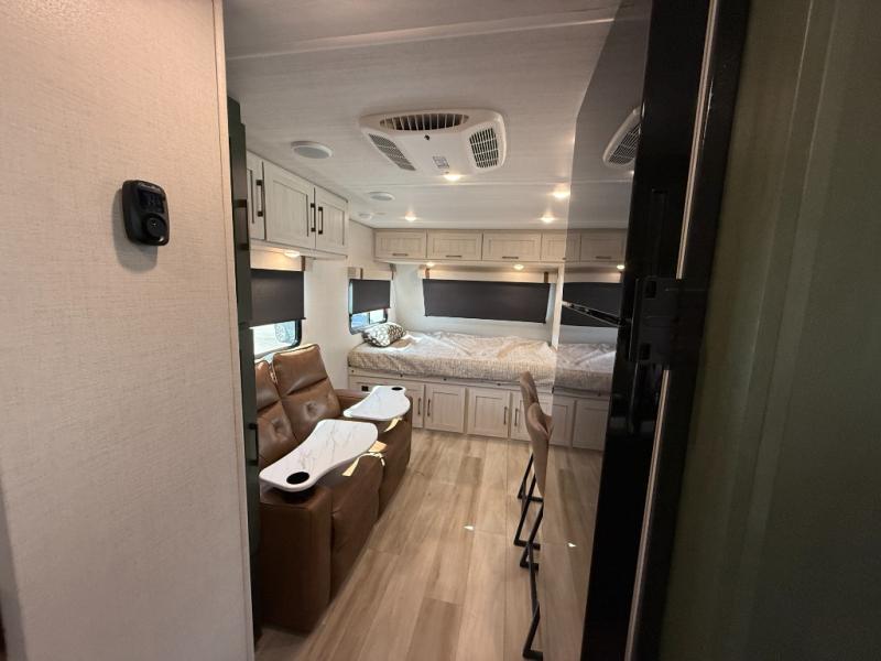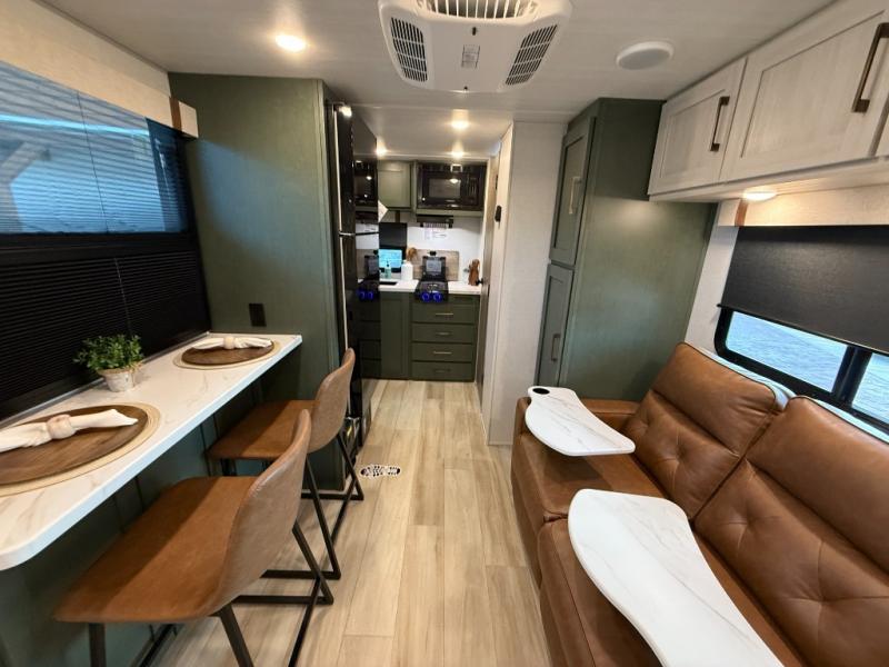 This easy to tow trailer is perfect for weekend trips to the lake! Once you're set up at camp, put out the patio awning, make lunch on the outside kitchen, and grab your camp chairs from the slam latch cargo doors with pass-thru lighting. A jackknife sofa inside will provide a place to relax in the evenings, and a full bath means you won't have to use the camp's facilities. There is also a bar top with two seats and a flip-up window where you can enjoy your morning coffee at! The rear corner kitchen includes microwave and cooktop plus a pantry and refrigerator for food storage. When it's time to call it a night, the front queen bed is sure to bring comfort! When the optional Beast Mode Package on this model is chosen, you'll enjoy a 400-watt solar package, a fresh water filter, a Maxxair roof vent cover, plus a Beast Mode independent suspension for better handling.