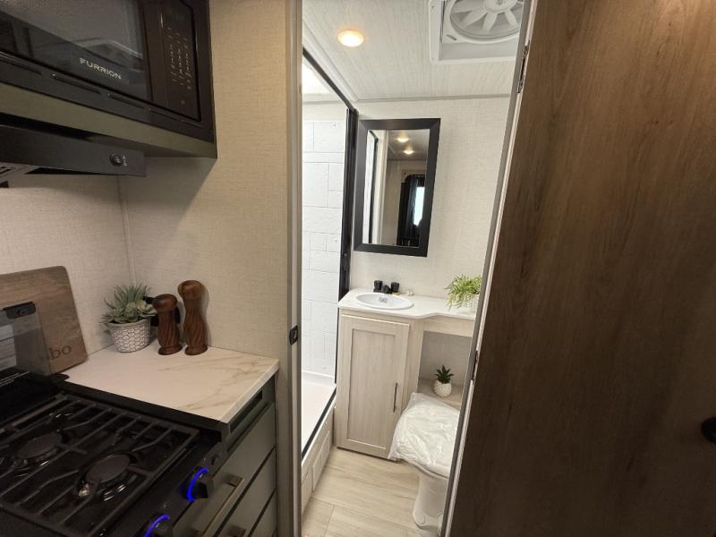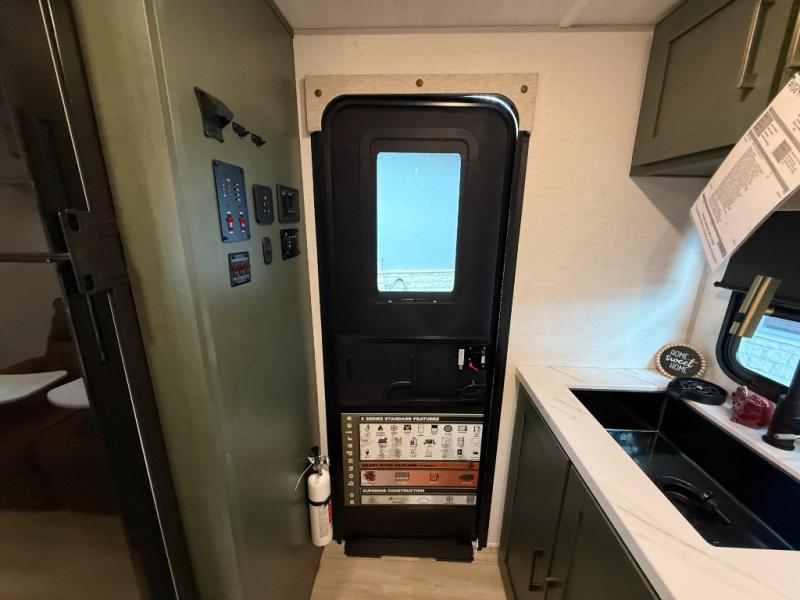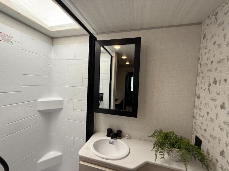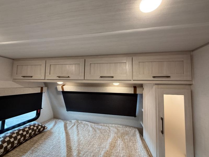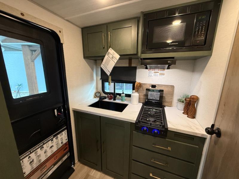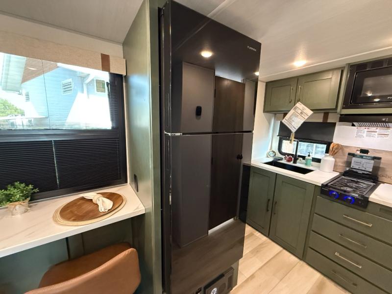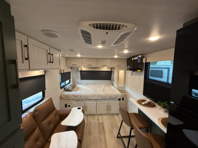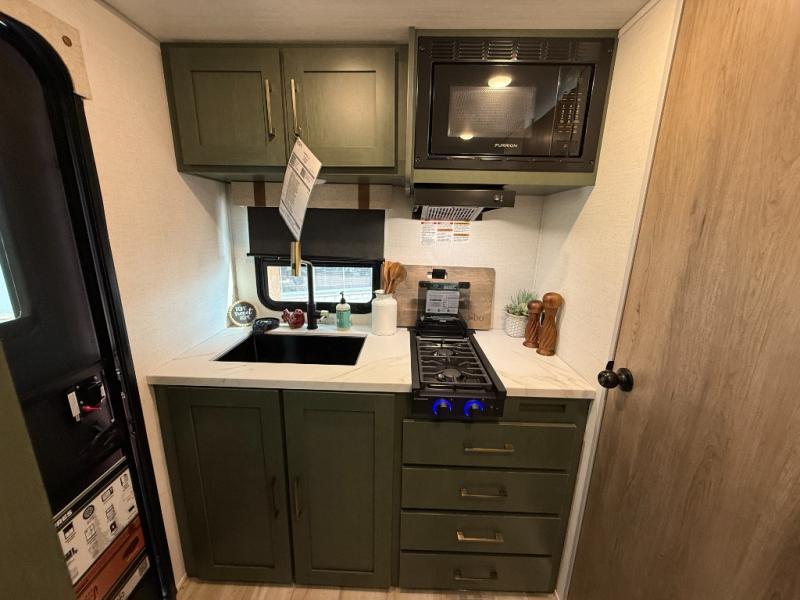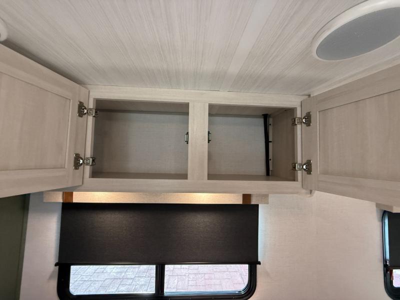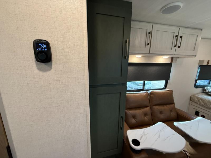 This easy to tow trailer is perfect for weekend trips to the lake! Once you're set up at camp, put out the patio awning, make lunch on the outside kitchen, and grab your camp chairs from the slam latch cargo doors with pass-thru lighting. A jackknife sofa inside will provide a place to relax in the evenings, and a full bath means you won't have to use the camp's facilities. There is also a bar top with two seats and a flip-up window where you can enjoy your morning coffee at! The rear corner kitchen includes microwave and cooktop plus a pantry and refrigerator for food storage. When it's time to call it a night, the front queen bed is sure to bring comfort! When the optional Beast Mode Package on this model is chosen, you'll enjoy a 400-watt solar package, a fresh water filter, a Maxxair roof vent cover, plus a Beast Mode independent suspension for better handling.