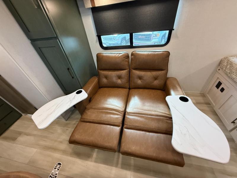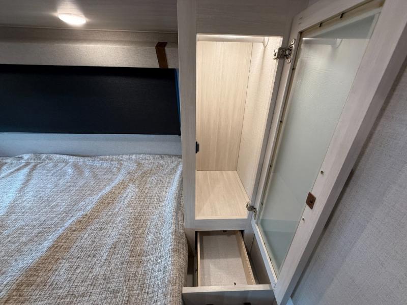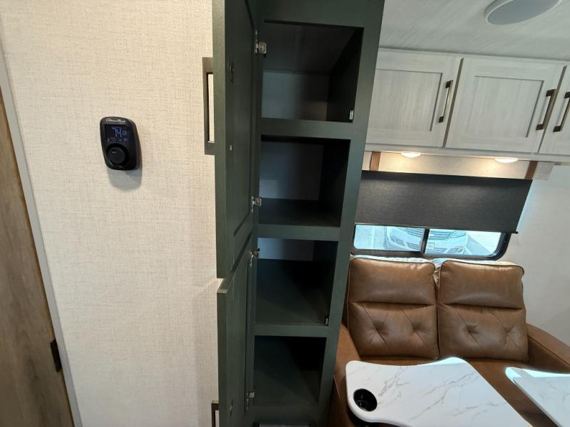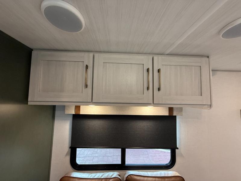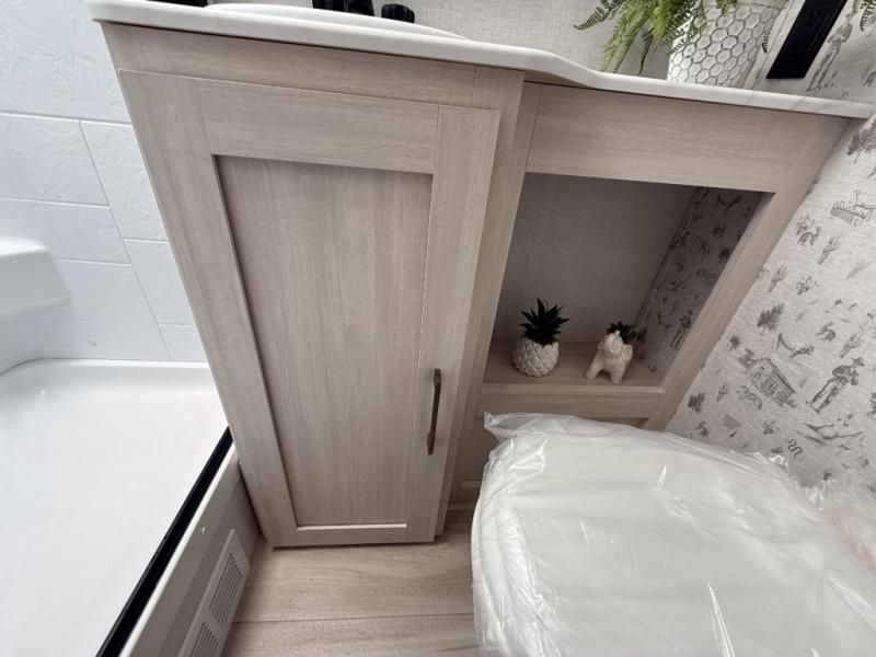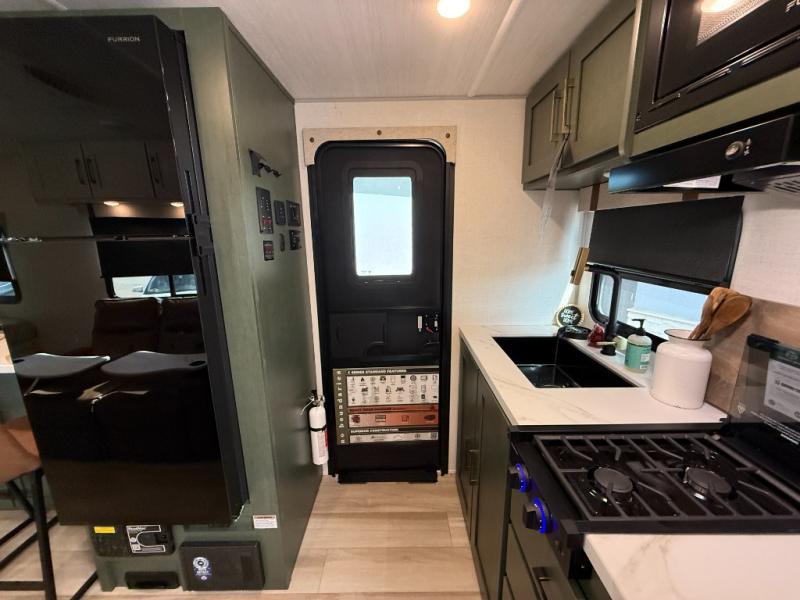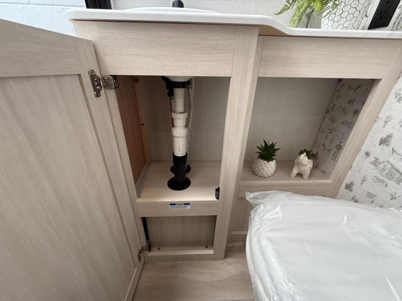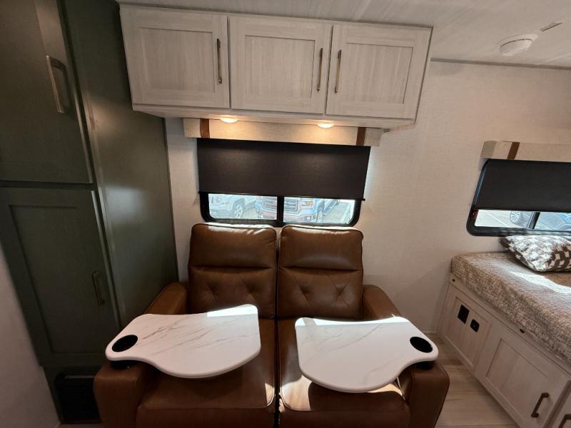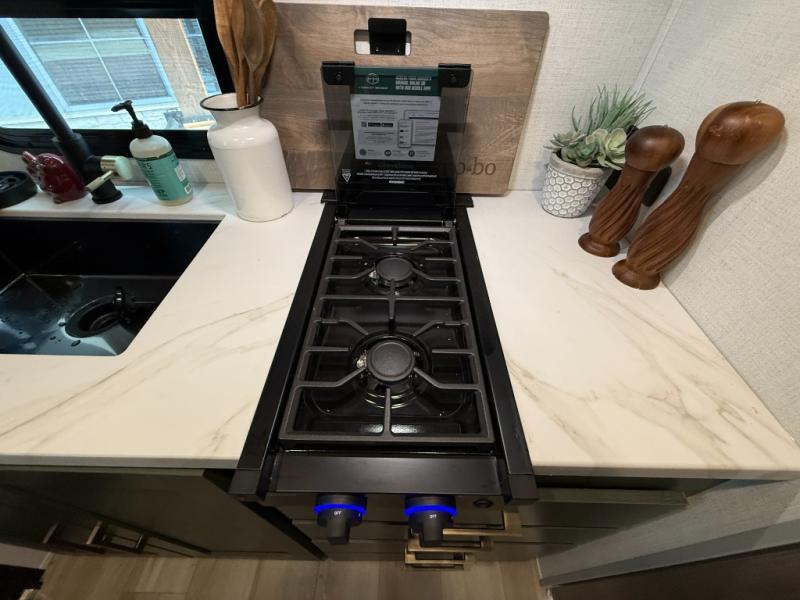 This easy to tow trailer is perfect for weekend trips to the lake! Once you're set up at camp, put out the patio awning, make lunch on the outside kitchen, and grab your camp chairs from the slam latch cargo doors with pass-thru lighting. A jackknife sofa inside will provide a place to relax in the evenings, and a full bath means you won't have to use the camp's facilities. There is also a bar top with two seats and a flip-up window where you can enjoy your morning coffee at! The rear corner kitchen includes microwave and cooktop plus a pantry and refrigerator for food storage. When it's time to call it a night, the front queen bed is sure to bring comfort! When the optional Beast Mode Package on this model is chosen, you'll enjoy a 400-watt solar package, a fresh water filter, a Maxxair roof vent cover, plus a Beast Mode independent suspension for better handling.