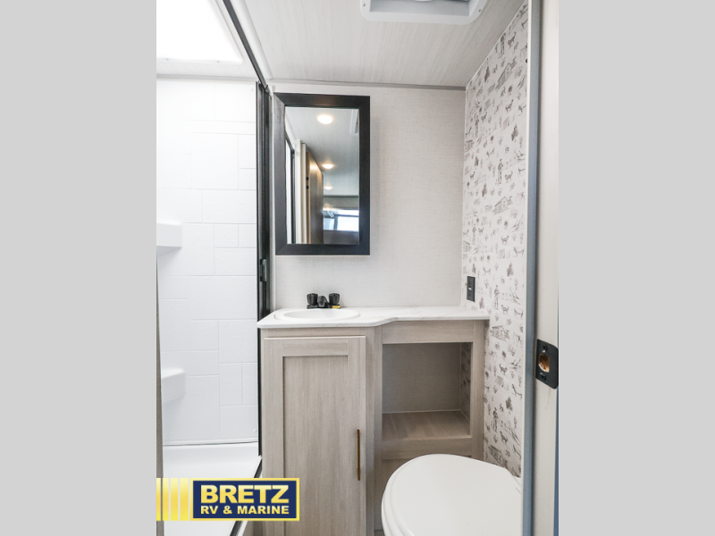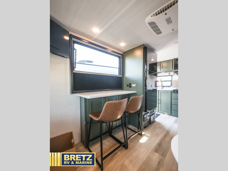 This easy to tow trailer is perfect for weekend trips to the lake! Once you're set up at camp, put out the patio awning, make lunch on the outside kitchen, and grab your camp chairs from the slam latch cargo doors with pass-thru lighting. A jackknife sofa inside will provide a place to relax in the evenings, and a full bath means you won't have to use the camp's facilities. There is also a bar top with two seats and a flip-up window where you can enjoy your morning coffee at! The rear corner kitchen includes microwave and cooktop plus a pantry and refrigerator for food storage. When it's time to call it a night, the front queen bed is sure to bring comfort!