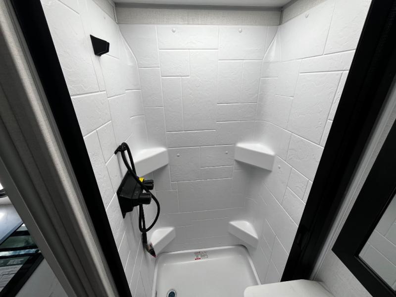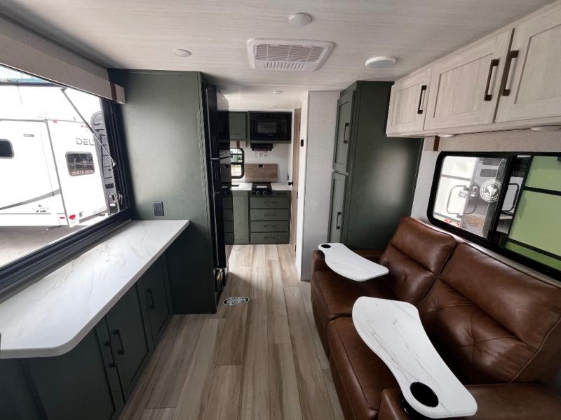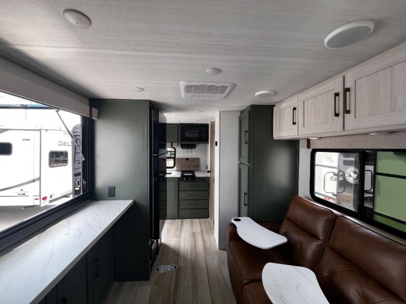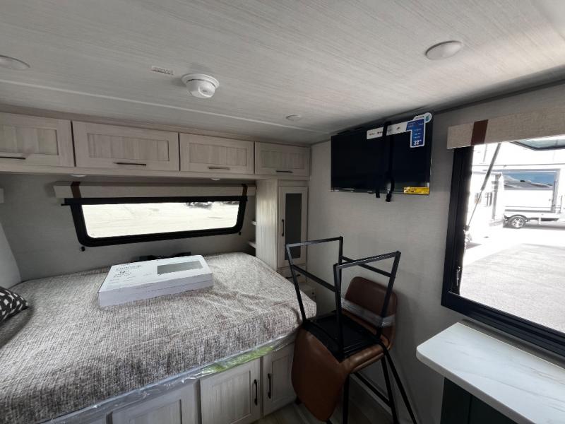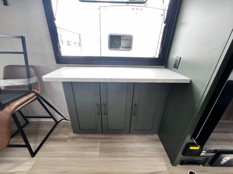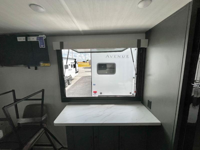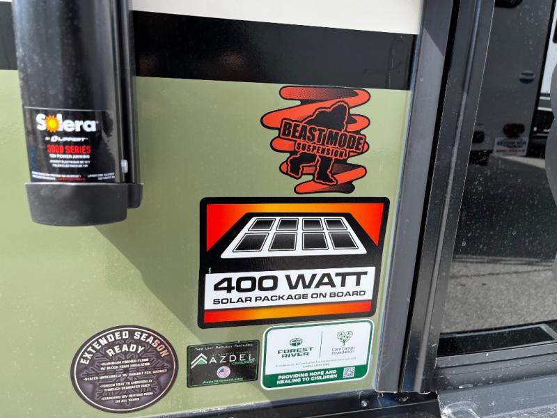 This easy to tow trailer is perfect for weekend trips to the lake! Once you're set up at camp, put out the patio awning, make lunch on the outside kitchen, and grab your camp chairs from the slam latch cargo doors with pass-thru lighting. A jackknife sofa inside will provide a place to relax in the evenings, and a full bath means you won't have to use the camp's facilities. There is also a bar top with two seats and a flip-up window where you can enjoy your morning coffee at! The rear corner kitchen includes microwave and cooktop plus a pantry and refrigerator for food storage. When it's time to call it a night, the front queen bed is sure to bring comfort! When the optional Beast Mode Package on this model is chosen, you'll enjoy a 400-watt solar package, a fresh water filter, a Maxxair roof vent cover, plus a Beast Mode independent suspension for better handling.