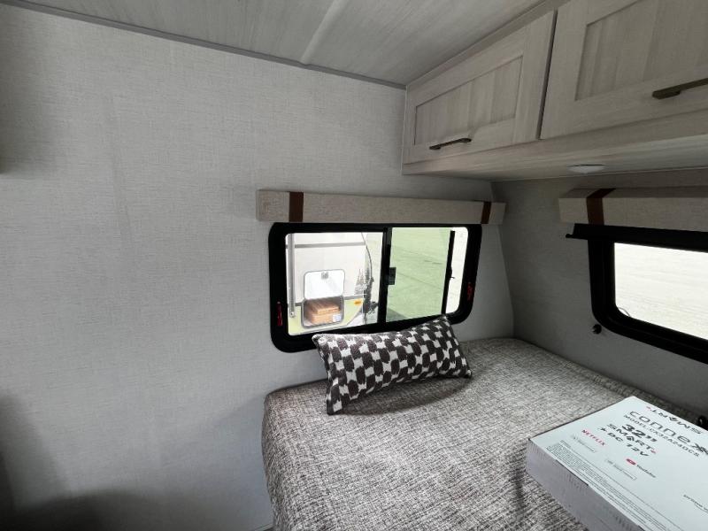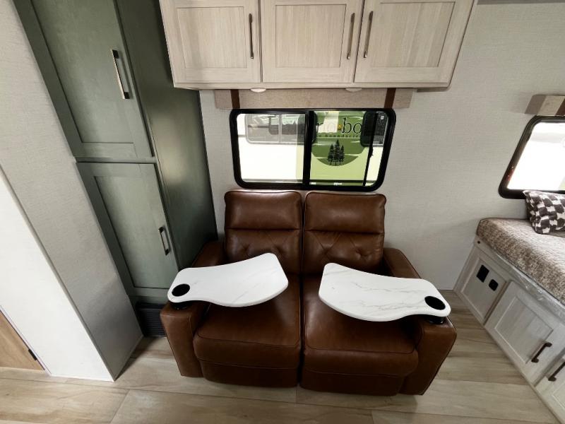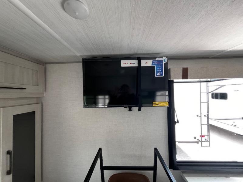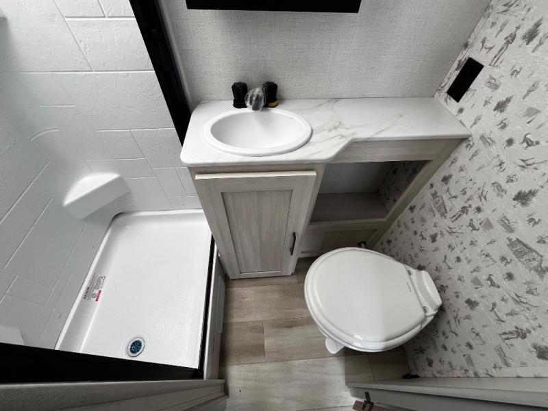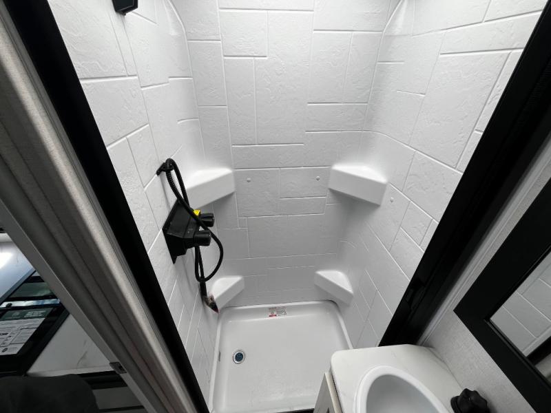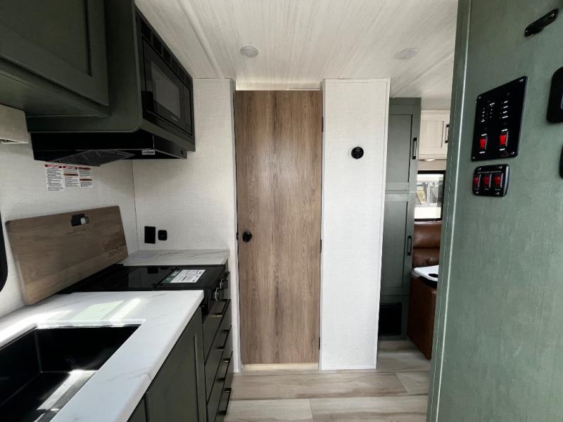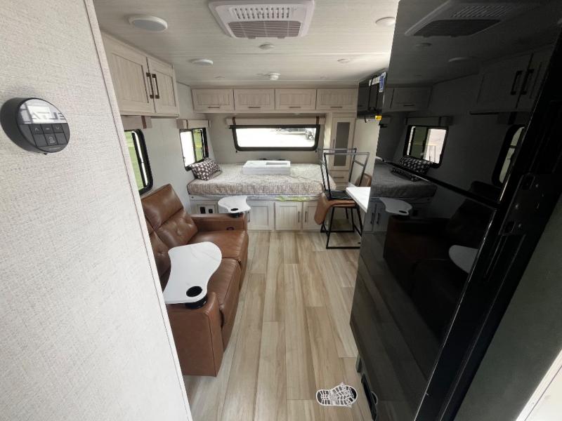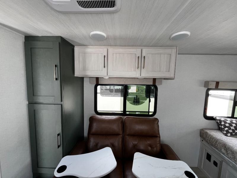 This easy to tow trailer is perfect for weekend trips to the lake! Once you're set up at camp, put out the patio awning, make lunch on the outside kitchen, and grab your camp chairs from the slam latch cargo doors with pass-thru lighting. A jackknife sofa inside will provide a place to relax in the evenings, and a full bath means you won't have to use the camp's facilities. There is also a bar top with two seats and a flip-up window where you can enjoy your morning coffee at! The rear corner kitchen includes microwave and cooktop plus a pantry and refrigerator for food storage. When it's time to call it a night, the front queen bed is sure to bring comfort! When the optional Beast Mode Package on this model is chosen, you'll enjoy a 400-watt solar package, a fresh water filter, a Maxxair roof vent cover, plus a Beast Mode independent suspension for better handling.