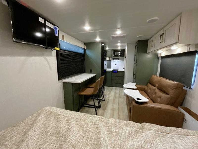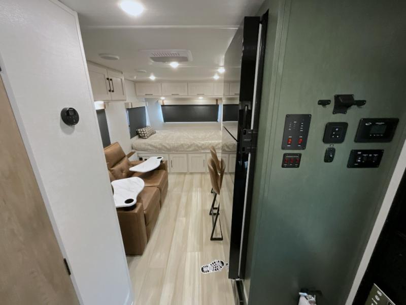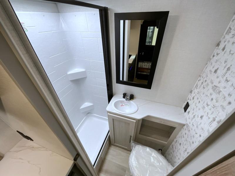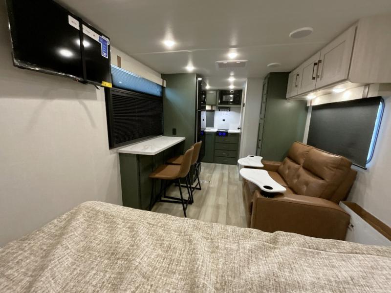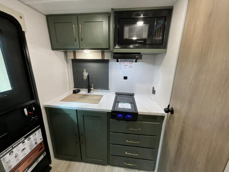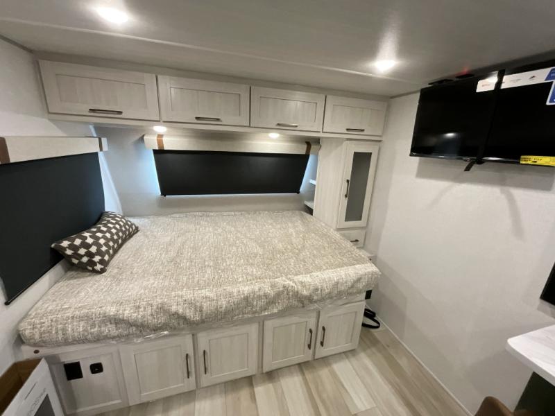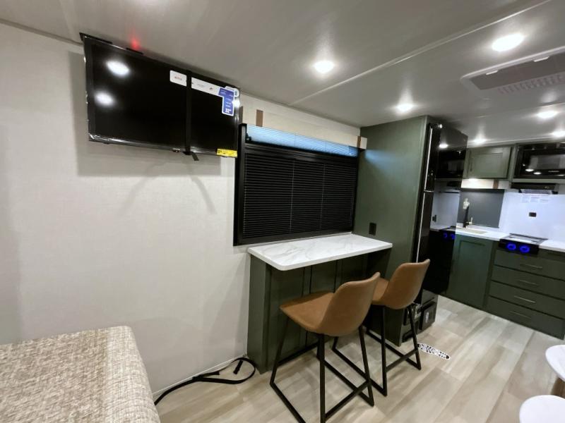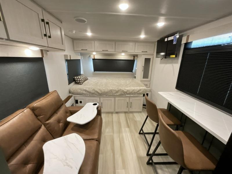 This easy to tow trailer is perfect for weekend trips to the lake! Once you're set up at camp, put out the patio awning, make lunch on the outside kitchen, and grab your camp chairs from the slam latch cargo doors with pass-thru lighting. A jackknife sofa inside will provide a place to relax in the evenings, and a full bath means you won't have to use the camp's facilities. There is also a bar top with two seats and a flip-up window where you can enjoy your morning coffee at! The rear corner kitchen includes microwave and cooktop plus a pantry and refrigerator for food storage. When it's time to call it a night, the front queen bed is sure to bring comfort!