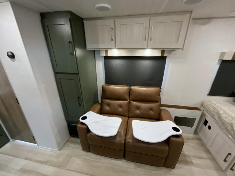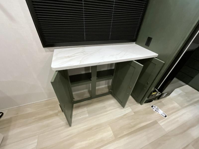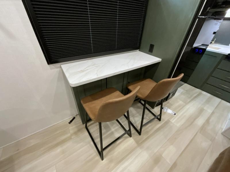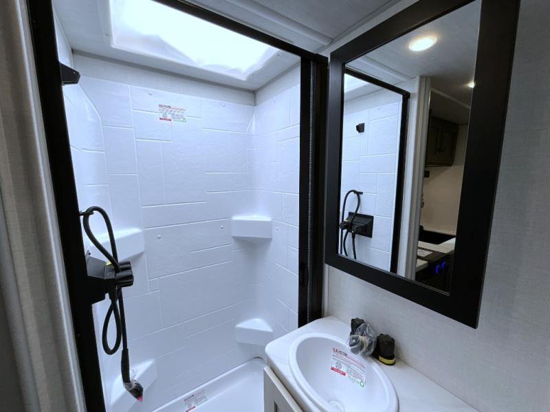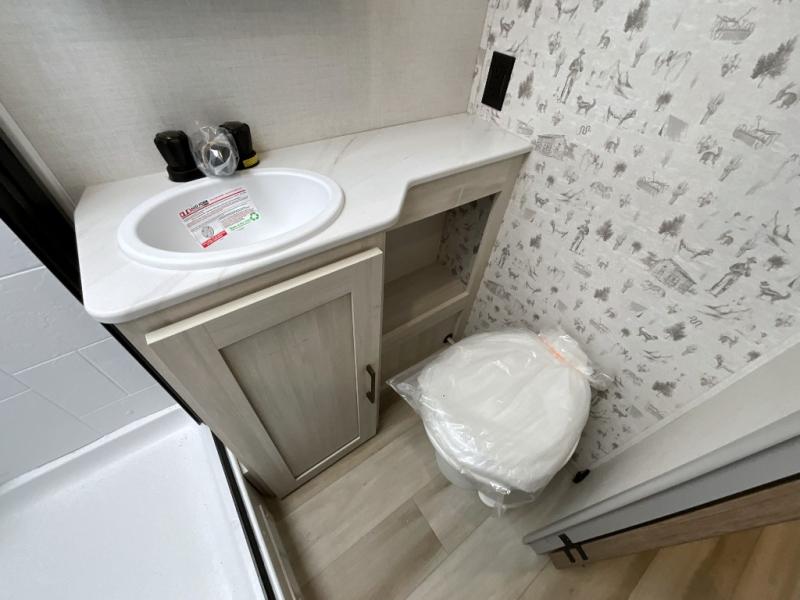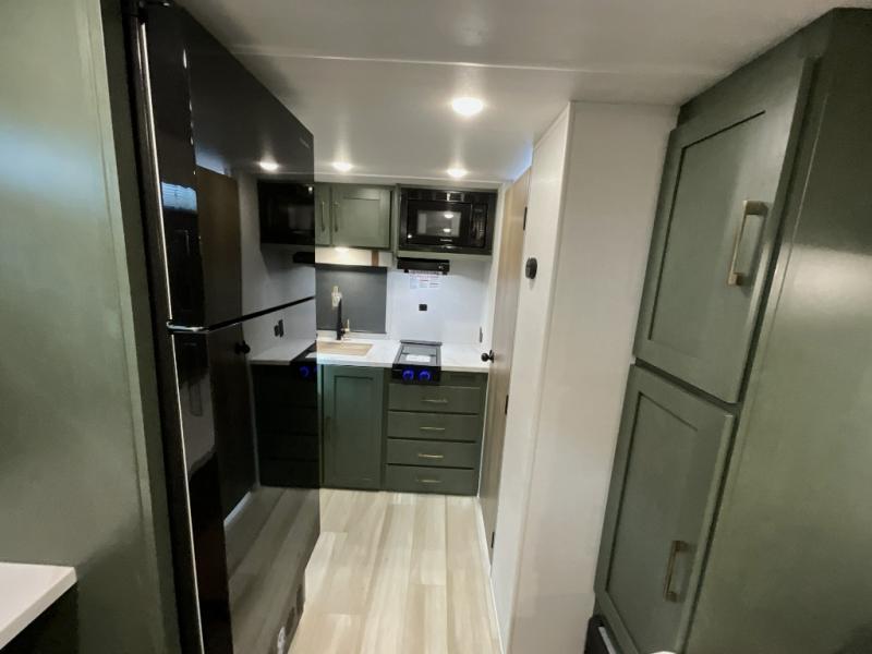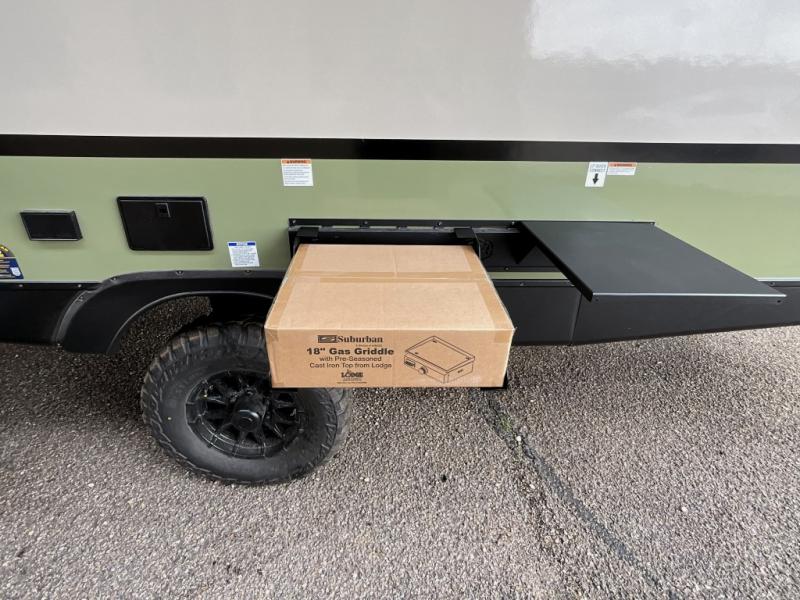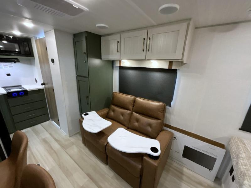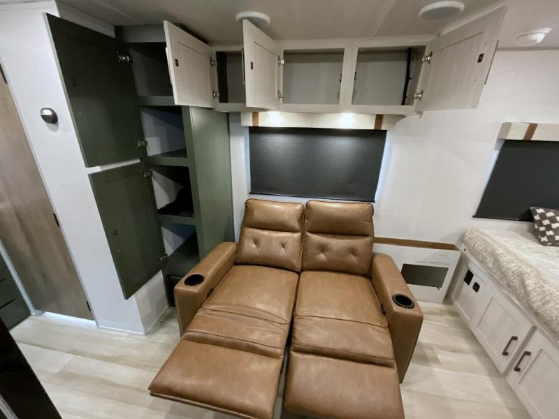 This easy to tow trailer is perfect for weekend trips to the lake! Once you're set up at camp, put out the patio awning, make lunch on the outside kitchen, and grab your camp chairs from the slam latch cargo doors with pass-thru lighting. A jackknife sofa inside will provide a place to relax in the evenings, and a full bath means you won't have to use the camp's facilities. There is also a bar top with two seats and a flip-up window where you can enjoy your morning coffee at! The rear corner kitchen includes microwave and cooktop plus a pantry and refrigerator for food storage. When it's time to call it a night, the front queen bed is sure to bring comfort!