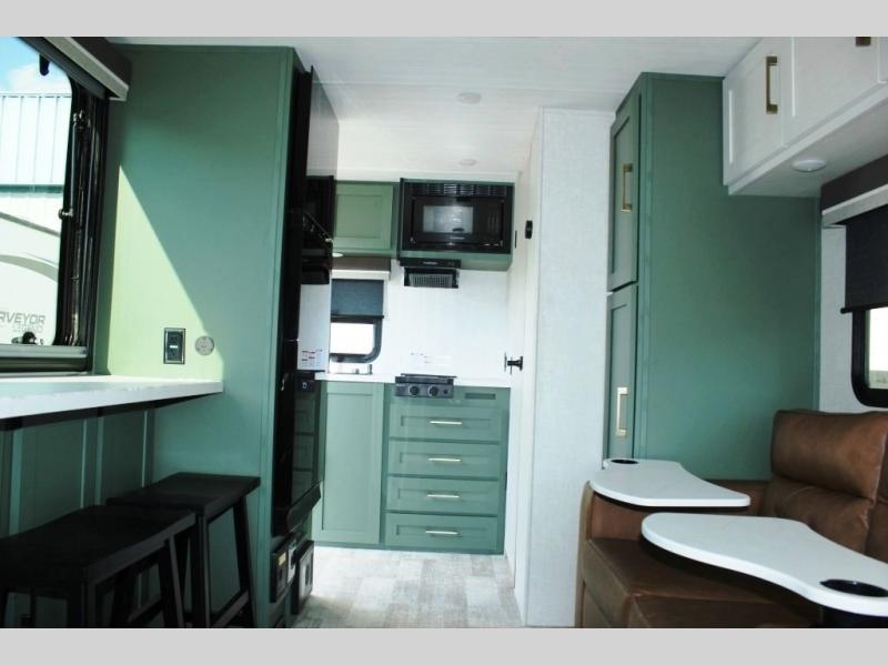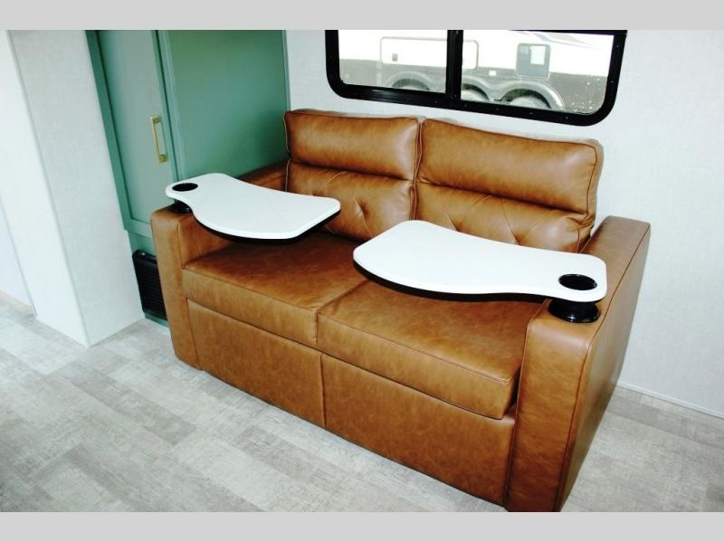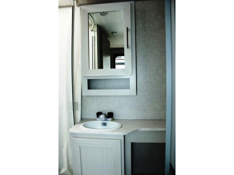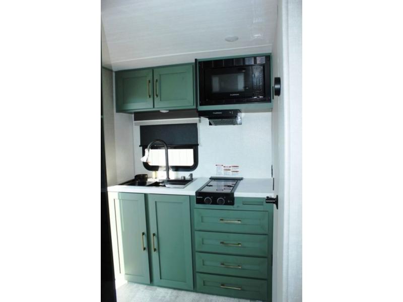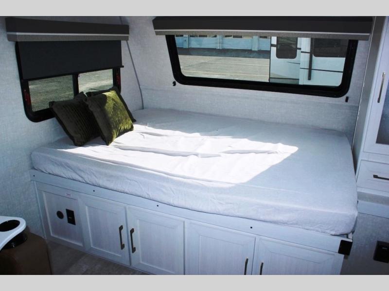 This easy to tow trailer is perfect for weekend trips to the lake! Once you're set up at camp, put out the patio awning, make lunch on the outside kitchen, and grab your camp chairs from the slam latch cargo doors with pass-thru lighting. A jackknife sofa inside will provide a place to relax in the evenings, and a full bath means you won't have to use the camp's facilities. There is also a bar top with two seats and a flip-up window where you can enjoy your morning coffee at! The rear corner kitchen includes microwave and cooktop plus a pantry and refrigerator for food storage. When it's time to call it a night, the front queen bed is sure to bring comfort! When the optional Beast Mode Package on this model is chosen, you'll enjoy a 400-watt solar package, a fresh water filter, a Maxxair roof vent cover, plus a Beast Mode independent suspension for better handling.