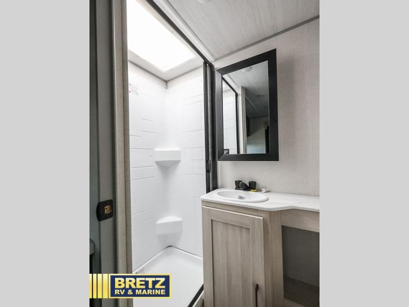 This easy to tow trailer is perfect for weekend trips to the lake! Once you're set up at camp, put out the patio awning, make lunch on the outside kitchen, and grab your camp chairs from the slam latch cargo doors with pass-thru lighting. A jackknife sofa inside will provide a place to relax in the evenings, and a full bath means you won't have to use the camp's facilities. There is also a bar top with two seats and a flip-up window where you can enjoy your morning coffee at! The rear corner kitchen includes microwave and cooktop plus a pantry and refrigerator for food storage. When it's time to call it a night, the front queen bed is sure to bring comfort! When the optional Beast Mode Package on this model is chosen, you'll enjoy a 400-watt solar package, a fresh water filter, a Maxxair roof vent cover, plus a Beast Mode independent suspension for better handling.
