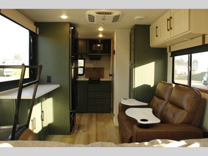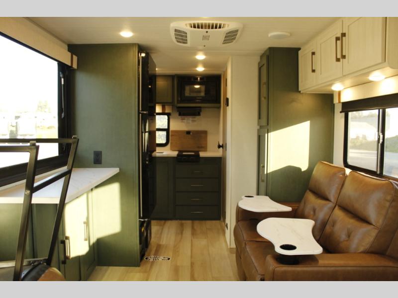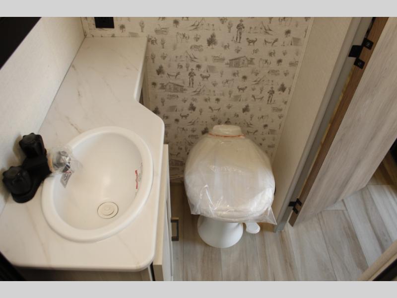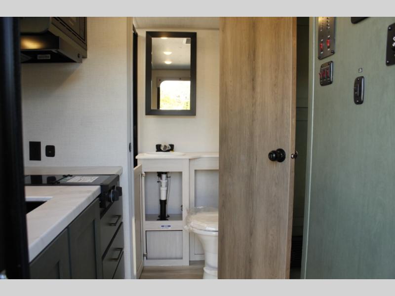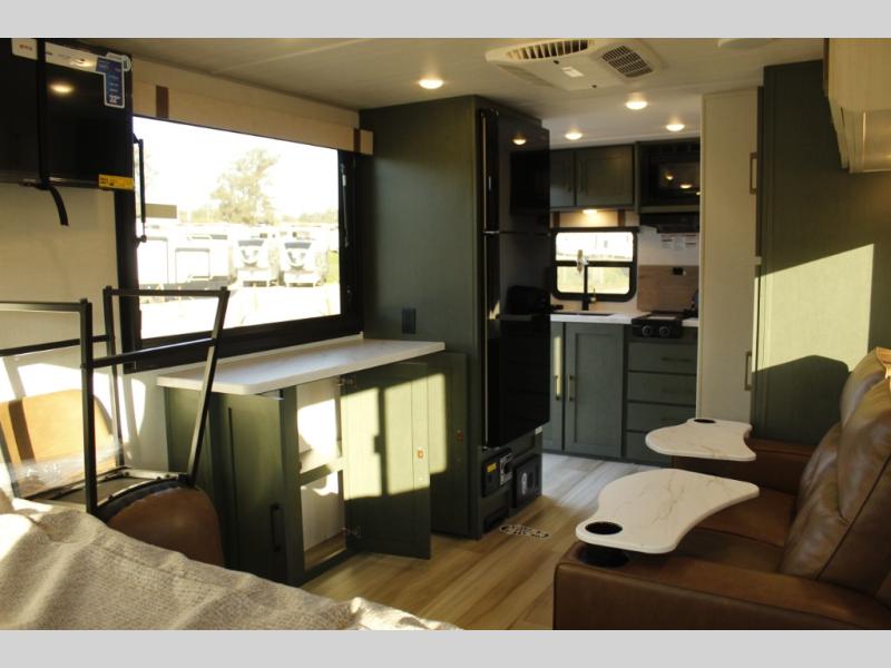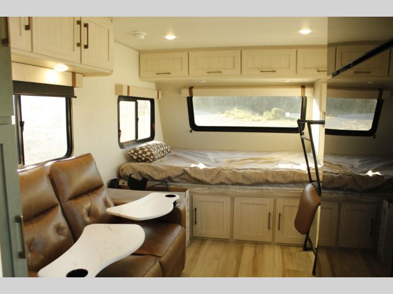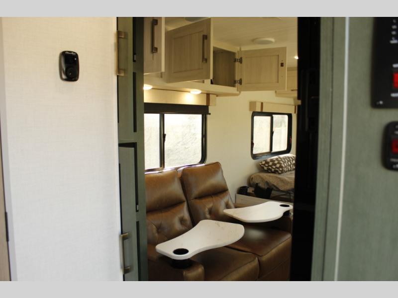 This easy to tow trailer is perfect for weekend trips to the lake! Once you're set up at camp, put out the patio awning, make lunch on the outside kitchen, and grab your camp chairs from the slam latch cargo doors with pass-thru lighting. A jackknife sofa inside will provide a place to relax in the evenings, and a full bath means you won't have to use the camp's facilities. There is also a bar top with two seats and a flip-up window where you can enjoy your morning coffee at! The rear corner kitchen includes microwave and cooktop plus a pantry and refrigerator for food storage. When it's time to call it a night, the front queen bed is sure to bring comfort! When the optional Beast Mode Package on this model is chosen, you'll enjoy a 400-watt solar package, a fresh water filter, a Maxxair roof vent cover, plus a Beast Mode independent suspension for better handling.
