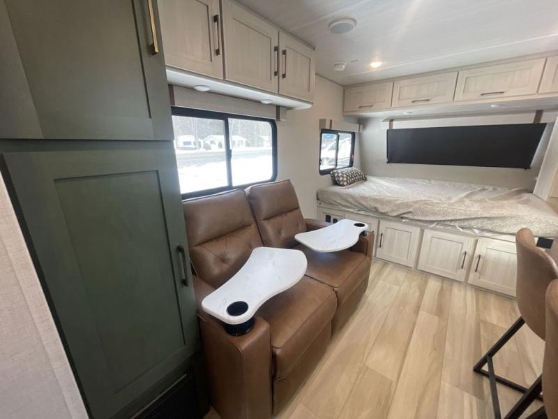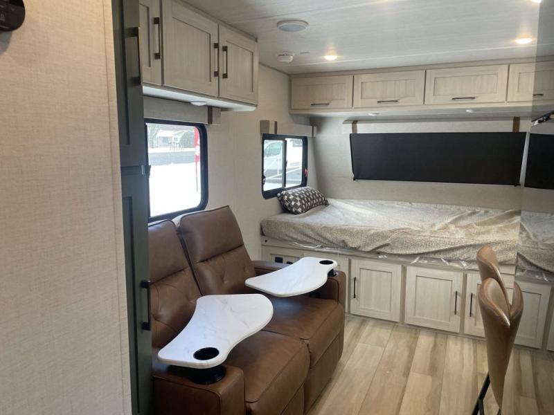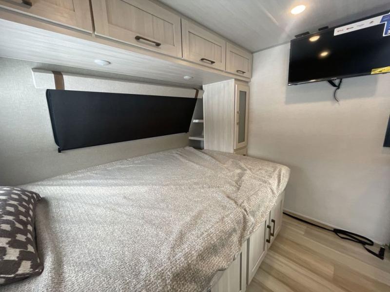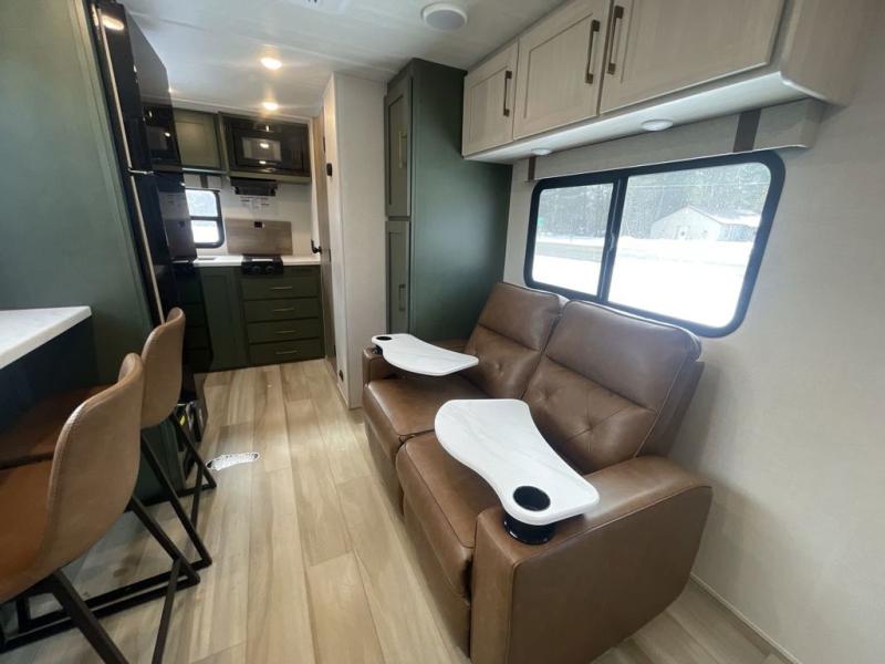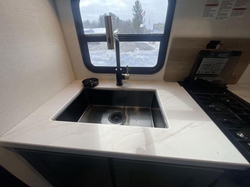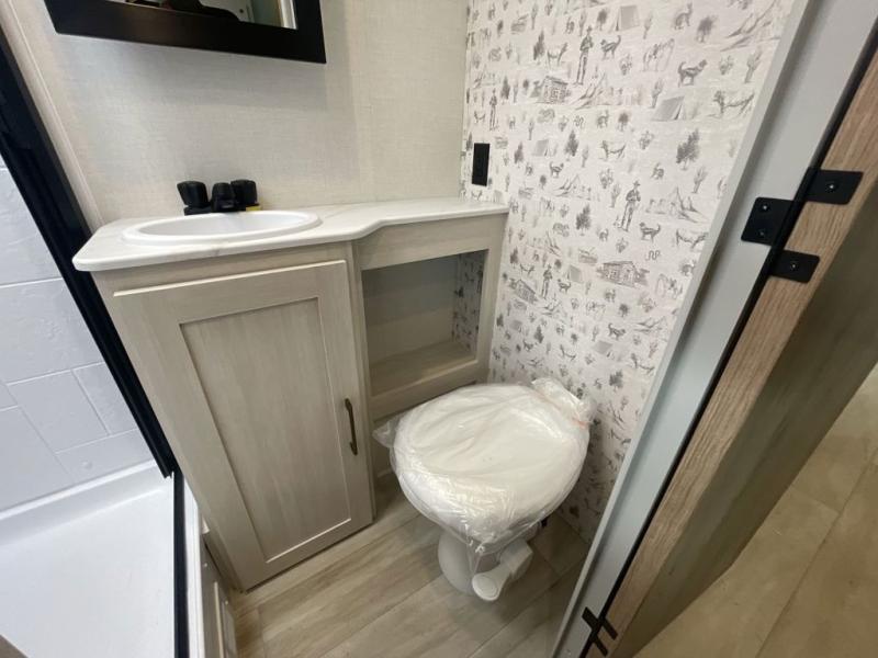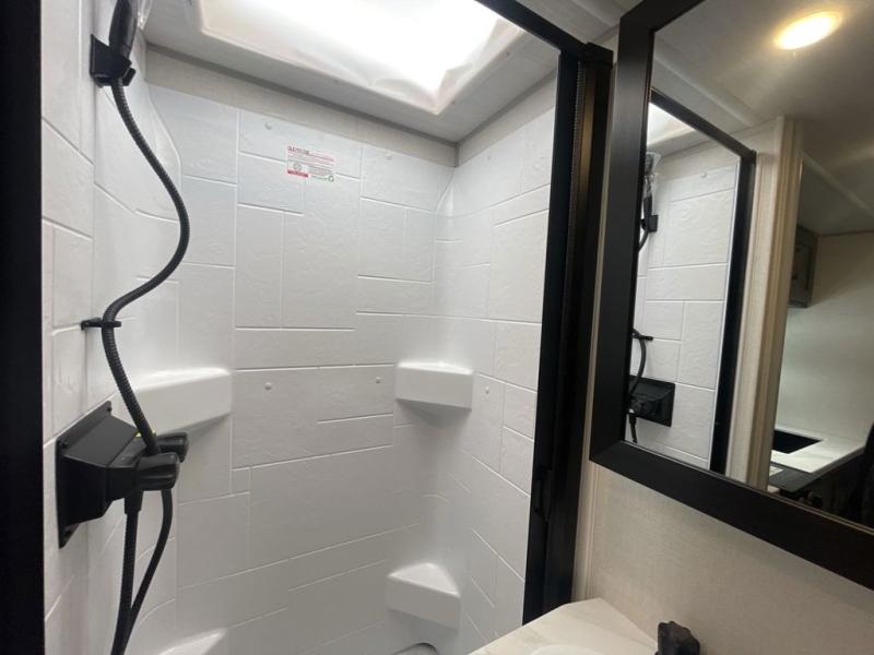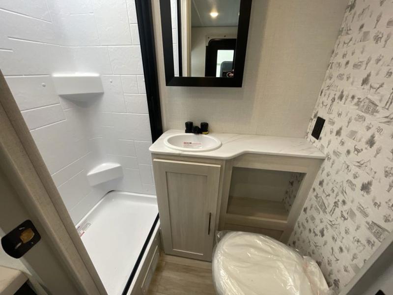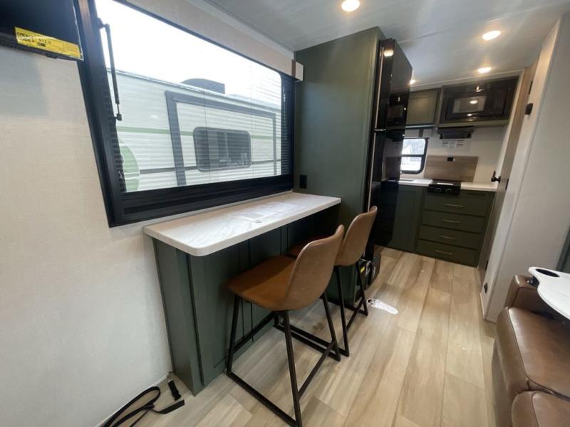 This easy to tow trailer is perfect for weekend trips to the lake! Once you're set up at camp, put out the patio awning, make lunch on the outside kitchen, and grab your camp chairs from the slam latch cargo doors with pass-thru lighting. A jackknife sofa inside will provide a place to relax in the evenings, and a full bath means you won't have to use the camp's facilities. There is also a bar top with two seats and a flip-up window where you can enjoy your morning coffee at! The rear corner kitchen includes microwave and cooktop plus a pantry and refrigerator for food storage. When it's time to call it a night, the front queen bed is sure to bring comfort! When the optional Beast Mode Package on this model is chosen, you'll enjoy a 400-watt solar package, a fresh water filter, a Maxxair roof vent cover, plus a Beast Mode independent suspension for better handling.