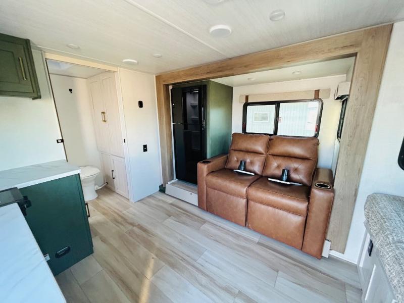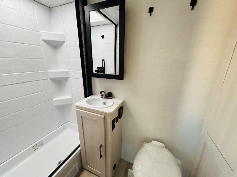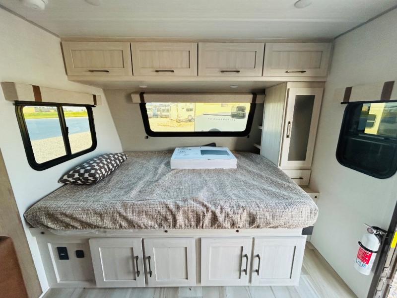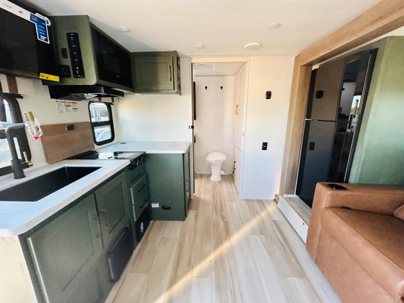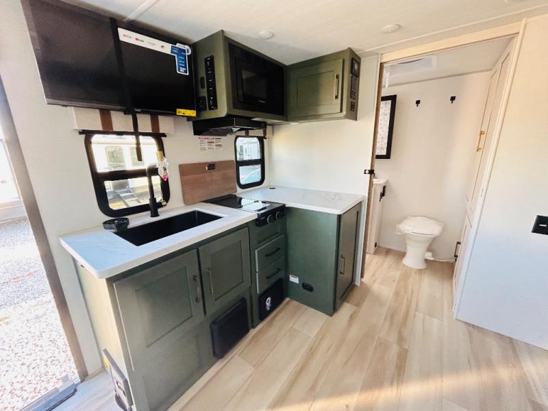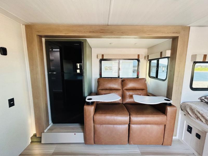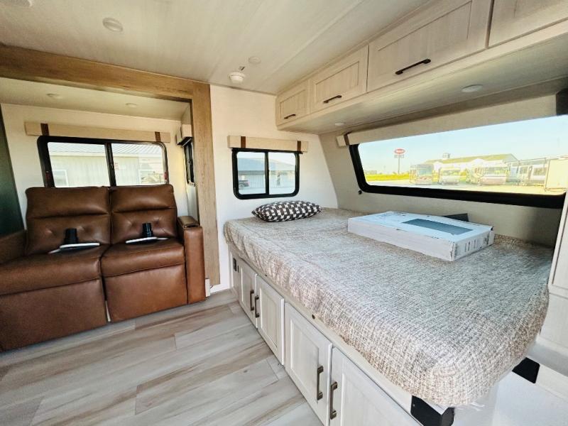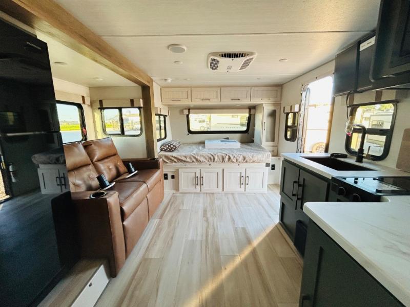 This spacious trailer is perfect for weekend trips to the lake! Once you're set up at camp, put out the patio awning, make lunch on the outside kitchen, and grab your camp chairs from the slam latch cargo doors with pass-thru lighting. A jackknife sofa slide inside will provide more space and a place to relax in the evenings, and a full bath means you won't have to use the camp's facilities. The kitchen includes a cooktop and microwave, plus a refrigerator and overhead cabinets for food storage. When it's time to call it a night, the front queen bed is sure to bring comfort!