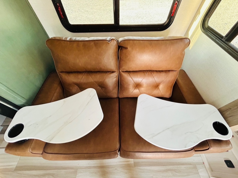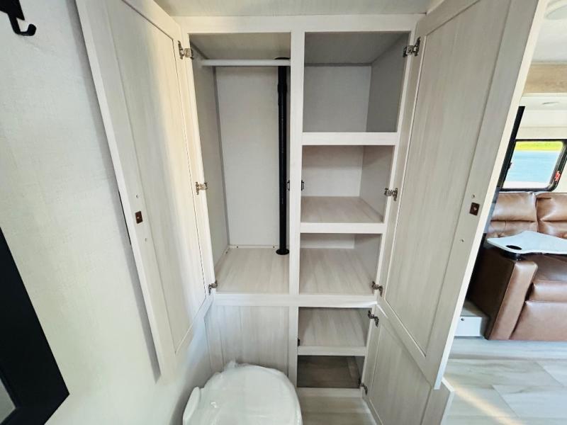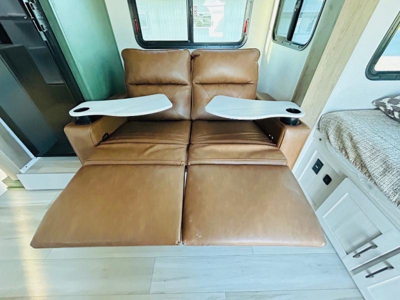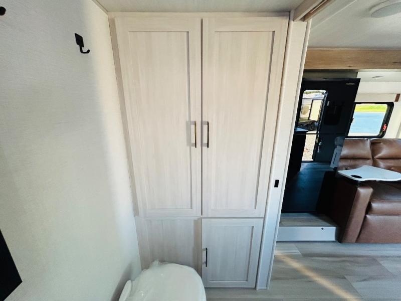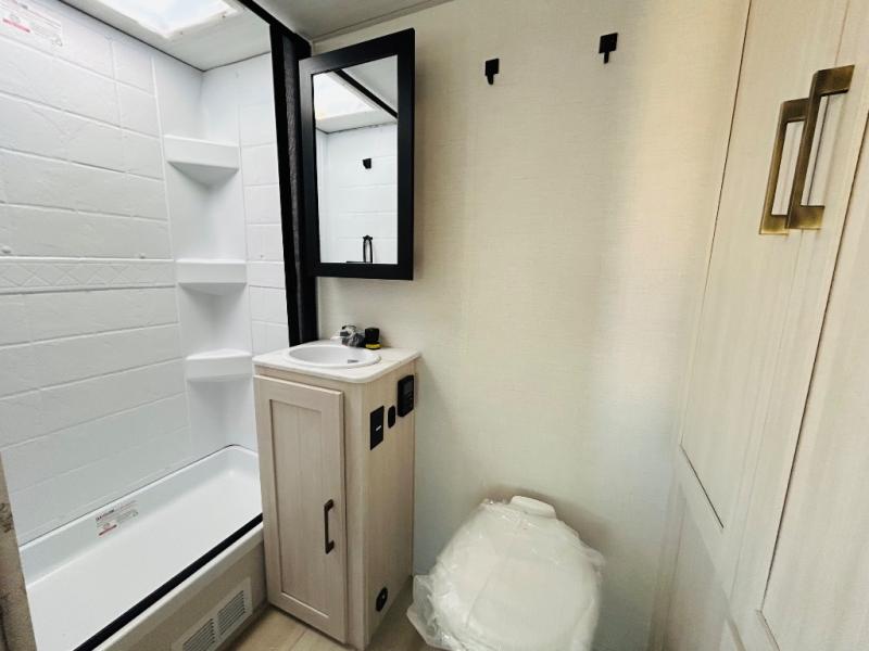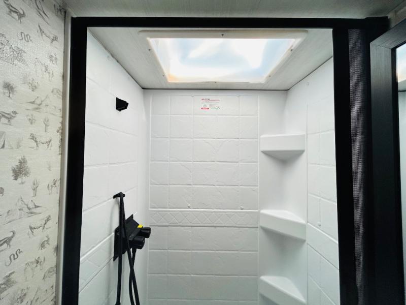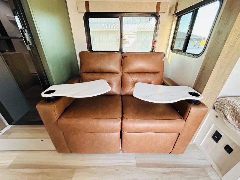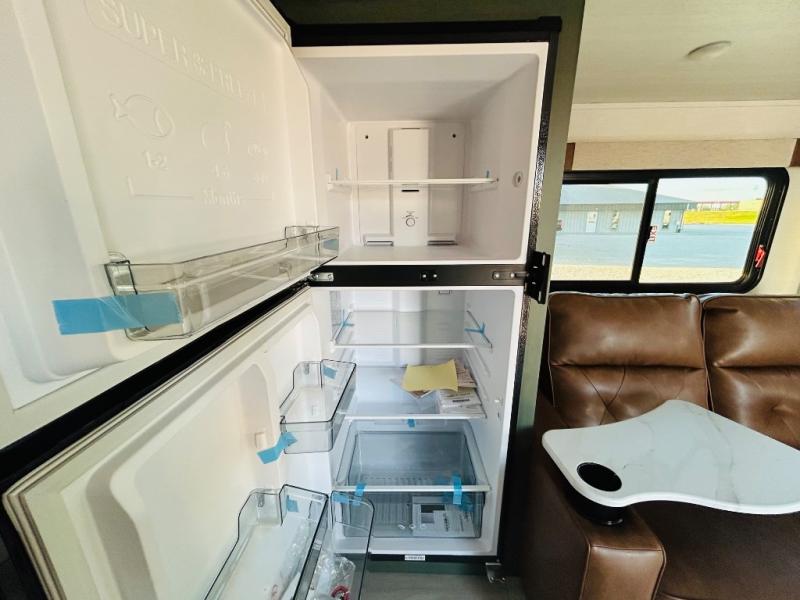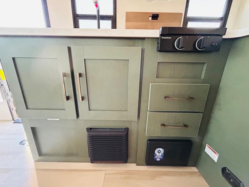 This spacious trailer is perfect for weekend trips to the lake! Once you're set up at camp, put out the patio awning, make lunch on the outside kitchen, and grab your camp chairs from the slam latch cargo doors with pass-thru lighting. A jackknife sofa slide inside will provide more space and a place to relax in the evenings, and a full bath means you won't have to use the camp's facilities. The kitchen includes a cooktop and microwave, plus a refrigerator and overhead cabinets for food storage. When it's time to call it a night, the front queen bed is sure to bring comfort!