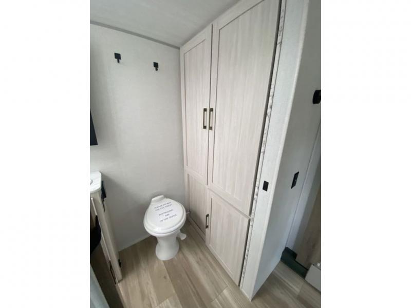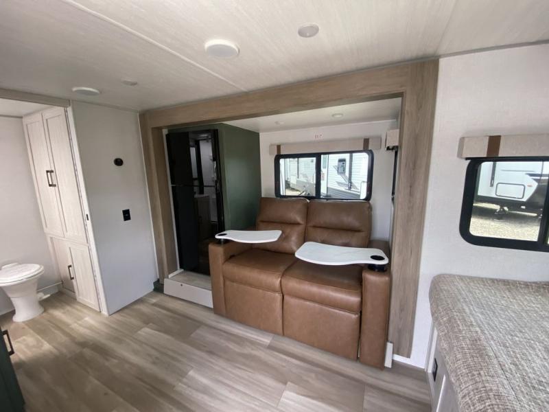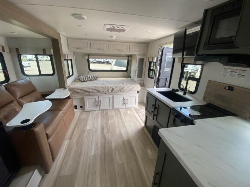 This spacious trailer is perfect for weekend trips to the lake! Once you're set up at camp, put out the patio awning, make lunch on the outside kitchen, and grab your camp chairs from the slam latch cargo doors with pass-thru lighting. A jackknife sofa slide inside will provide more space and a place to relax in the evenings, and a full bath means you won't have to use the camp's facilities. The kitchen includes a cooktop and microwave, plus a refrigerator and overhead cabinets for food storage. When it's time to call it a night, the front queen bed is sure to bring comfort!
