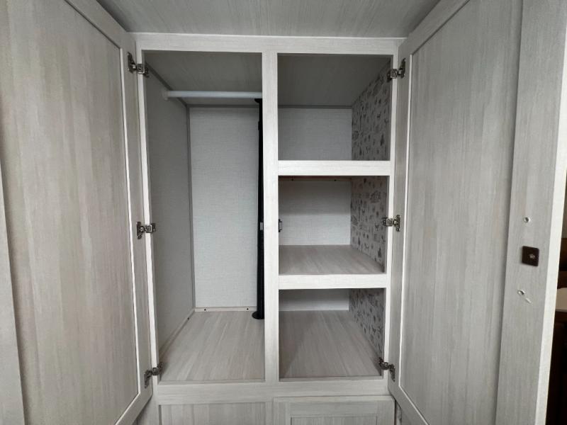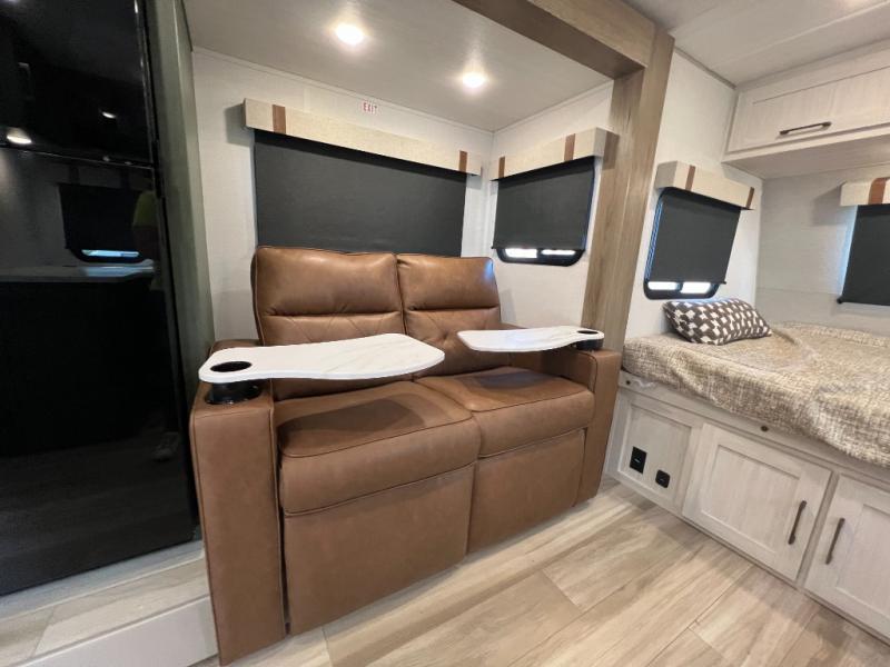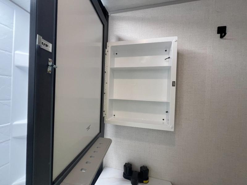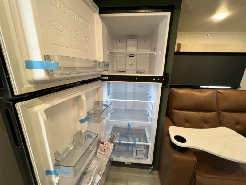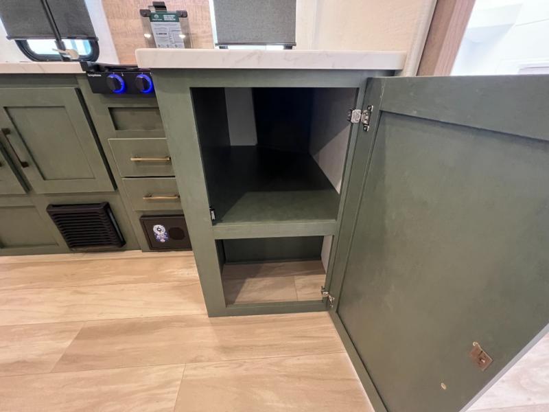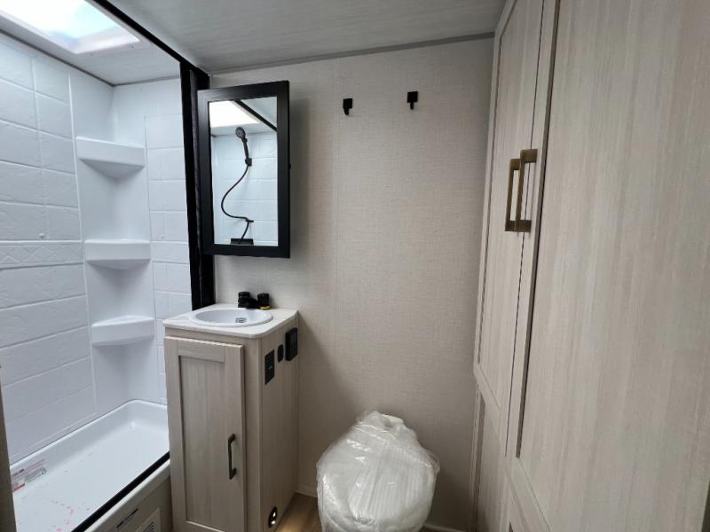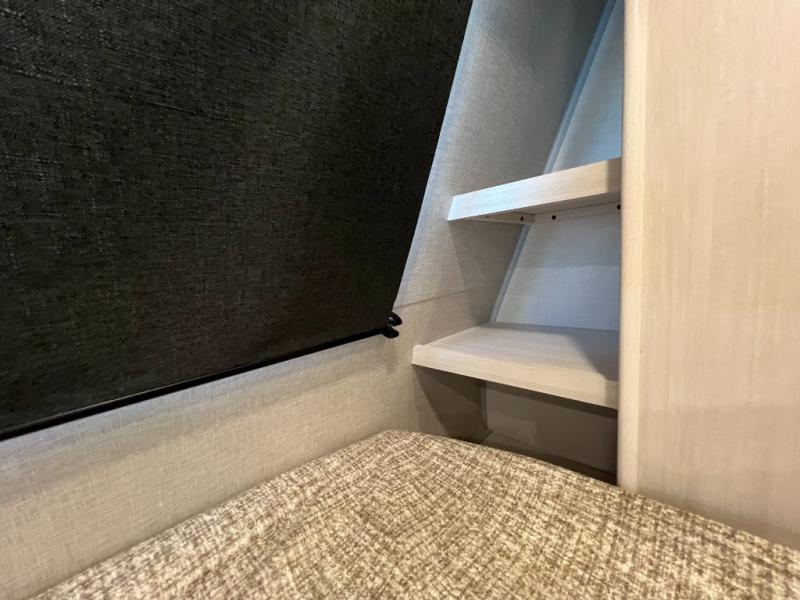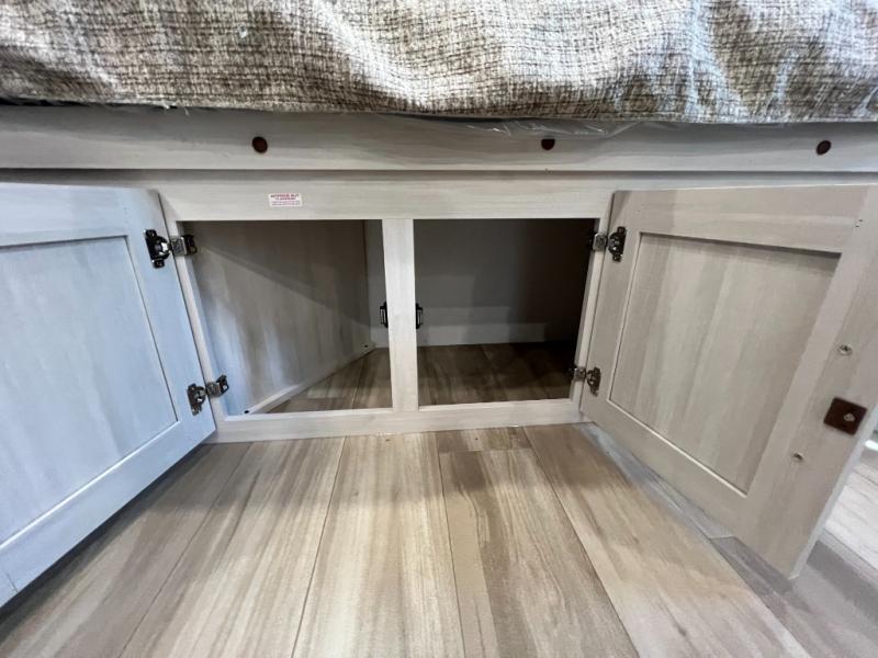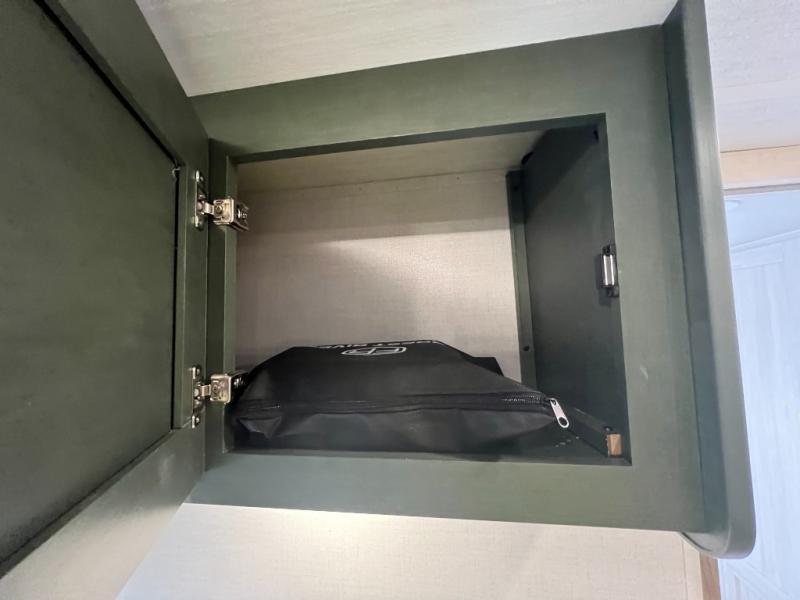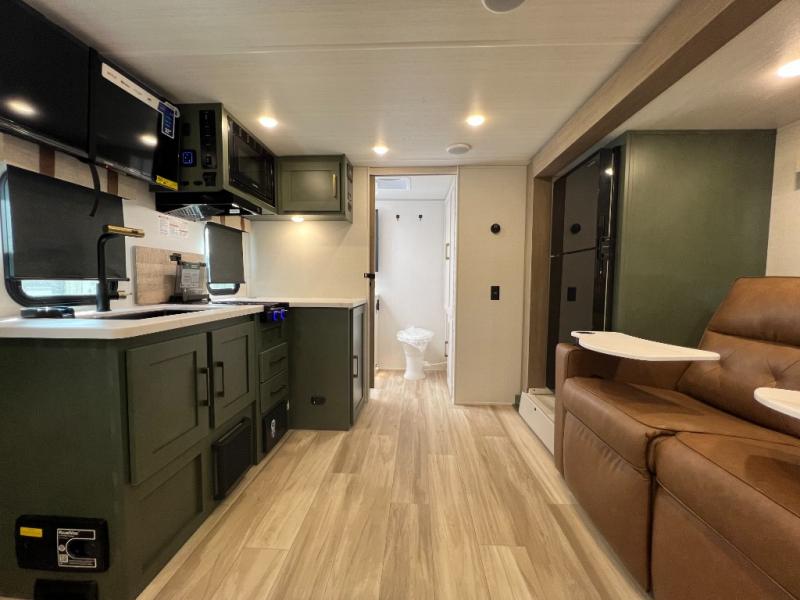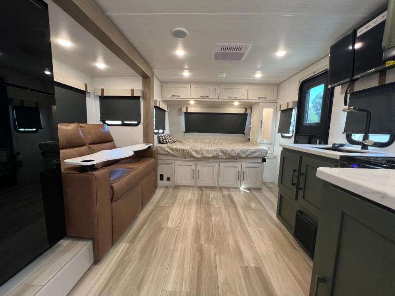 This spacious trailer is perfect for weekend trips to the lake! Once you're set up at camp, put out the patio awning, make lunch on the outside kitchen, and grab your camp chairs from the slam latch cargo doors with pass-thru lighting. A jackknife sofa slide inside will provide more space and a place to relax in the evenings, and a full bath means you won't have to use the camp's facilities. The kitchen includes a cooktop and microwave, plus a refrigerator and overhead cabinets for food storage. When it's time to call it a night, the front queen bed is sure to bring comfort!