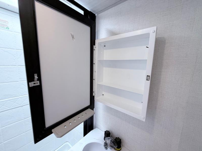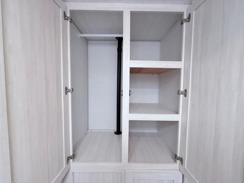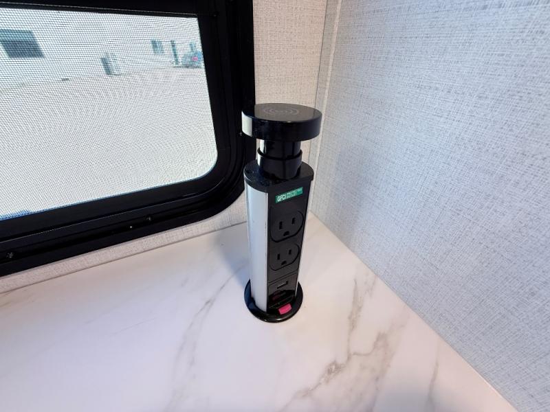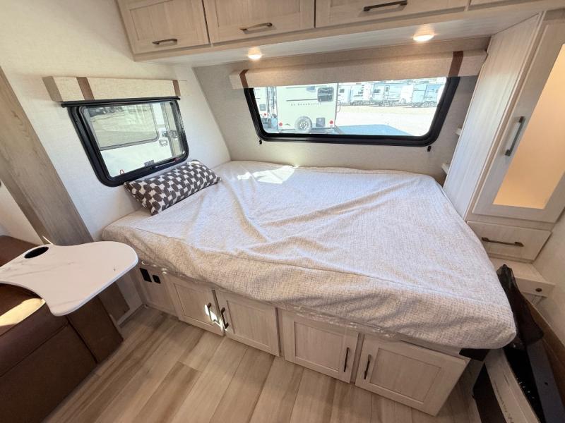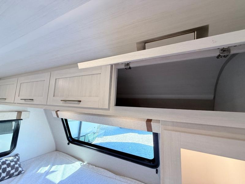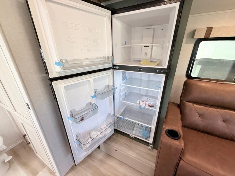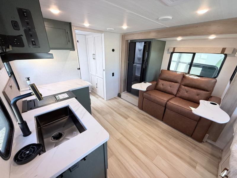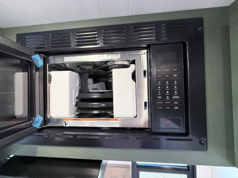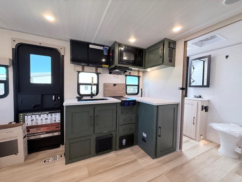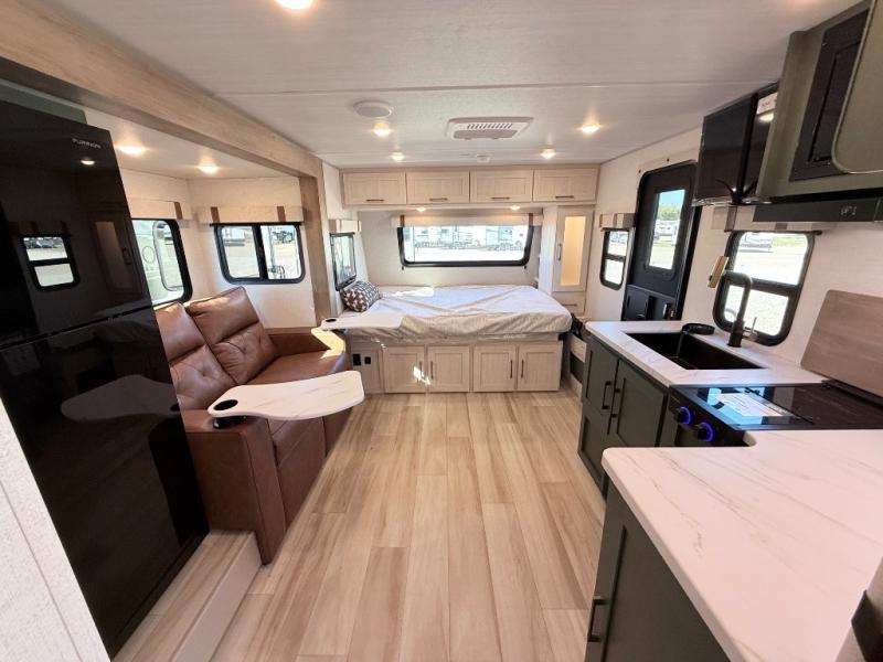 This spacious trailer is perfect for weekend trips to the lake! Once you're set up at camp, put out the patio awning, make lunch on the outside kitchen, and grab your camp chairs from the slam latch cargo doors with pass-thru lighting. A jackknife sofa slide inside will provide more space and a place to relax in the evenings, and a full bath means you won't have to use the camp's facilities. The kitchen includes a cooktop and microwave, plus a refrigerator and overhead cabinets for food storage. When it's time to call it a night, the front queen bed is sure to bring comfort!