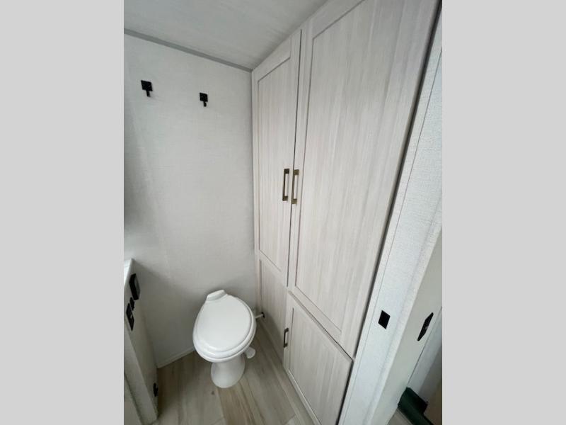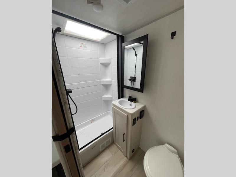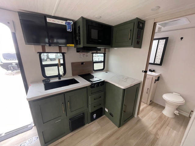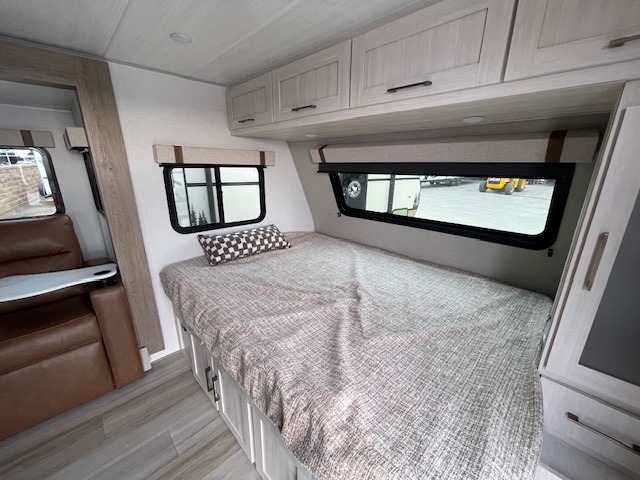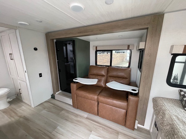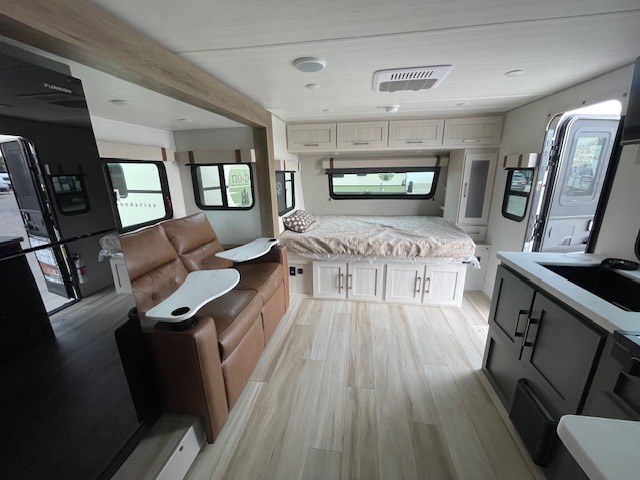 This spacious trailer is perfect for weekend trips to the lake! Once you're set up at camp, put out the patio awning, make lunch on the outside kitchen, and grab your camp chairs from the slam latch cargo doors with pass-thru lighting. A jackknife sofa slide inside will provide more space and a place to relax in the evenings, and a full bath means you won't have to use the camp's facilities. The kitchen includes a cooktop and microwave, plus a refrigerator and overhead cabinets for food storage. When it's time to call it a night, the front queen bed is sure to bring comfort!