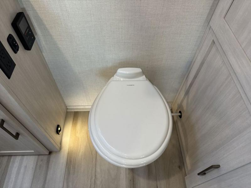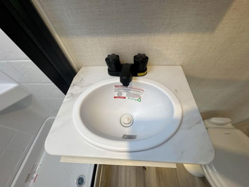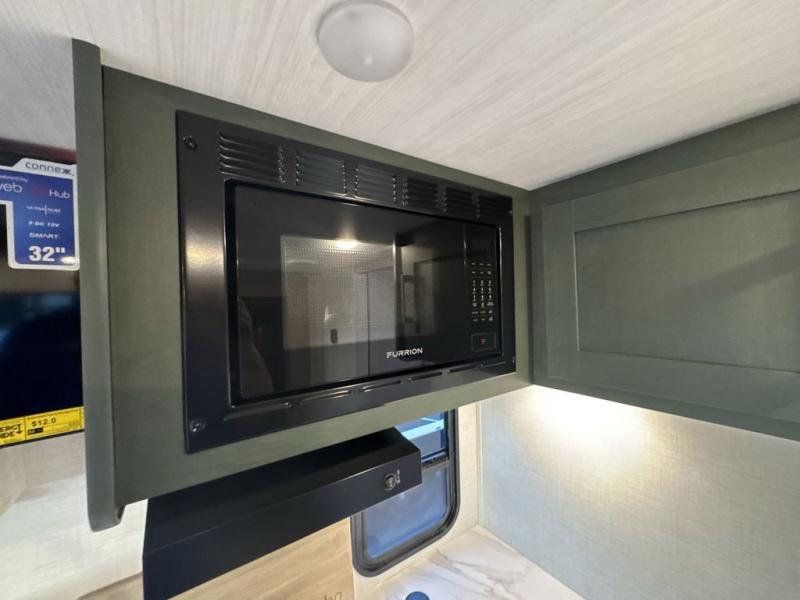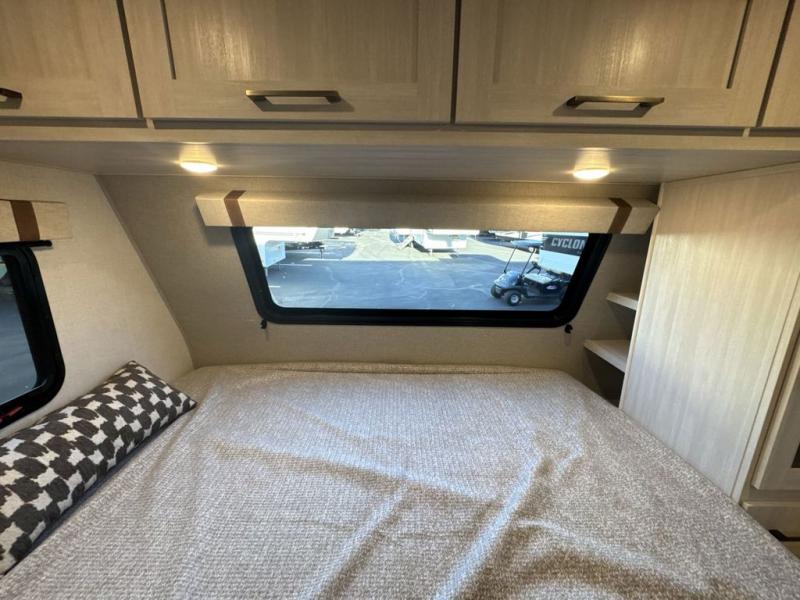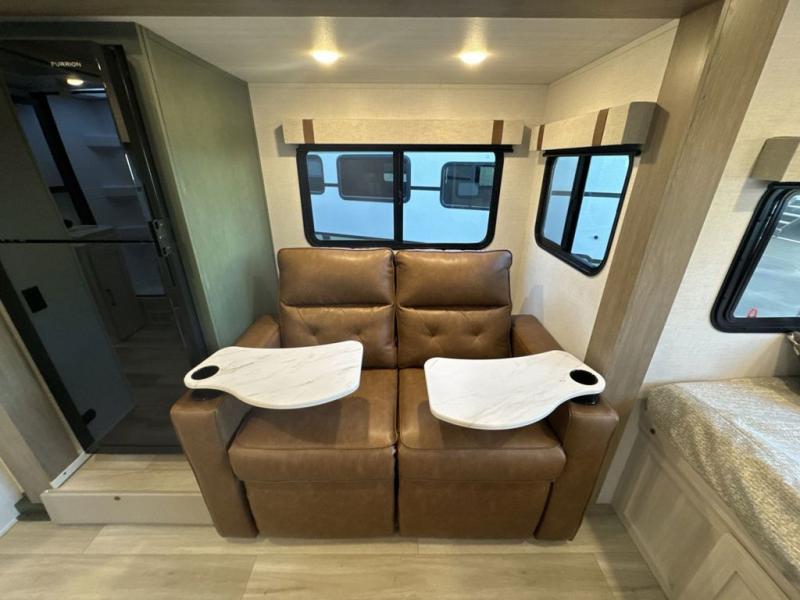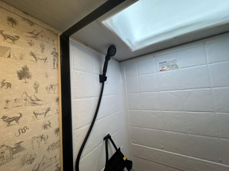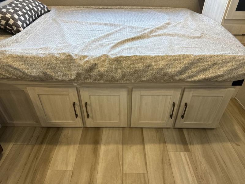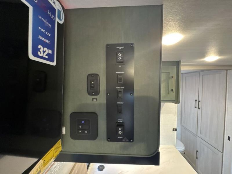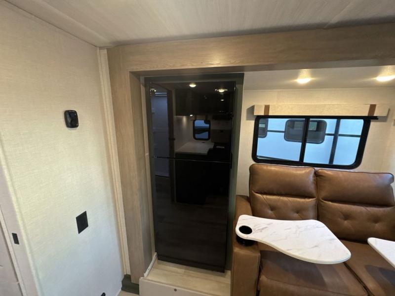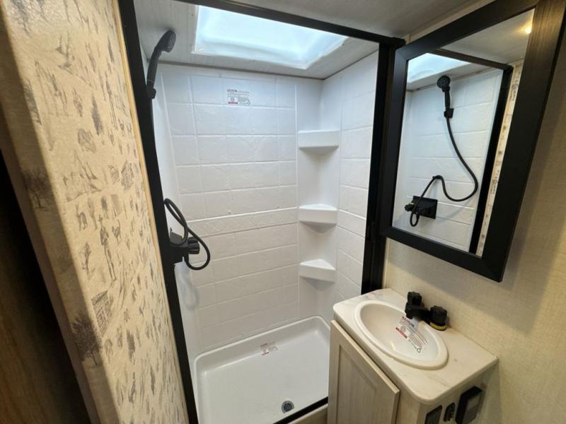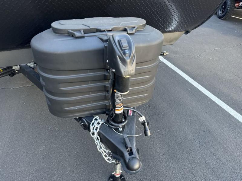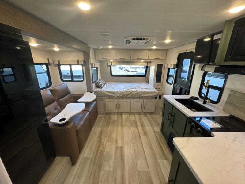 This spacious trailer is perfect for weekend trips to the lake! Once you're set up at camp, put out the patio awning, make lunch on the outside kitchen, and grab your camp chairs from the slam latch cargo doors with pass-thru lighting. A jackknife sofa slide inside will provide more space and a place to relax in the evenings, and a full bath means you won't have to use the camp's facilities. The kitchen includes a cooktop and microwave, plus a refrigerator and overhead cabinets for food storage. When it's time to call it a night, the front queen bed is sure to bring comfort!