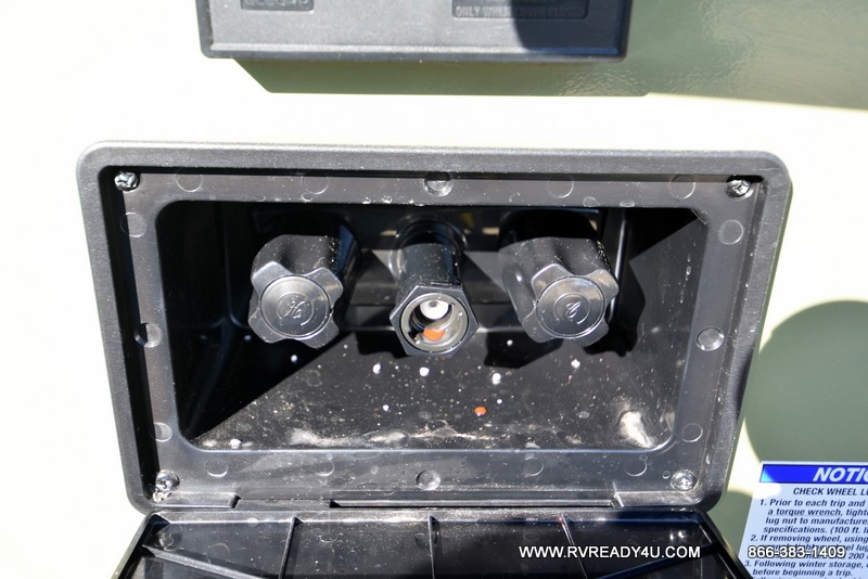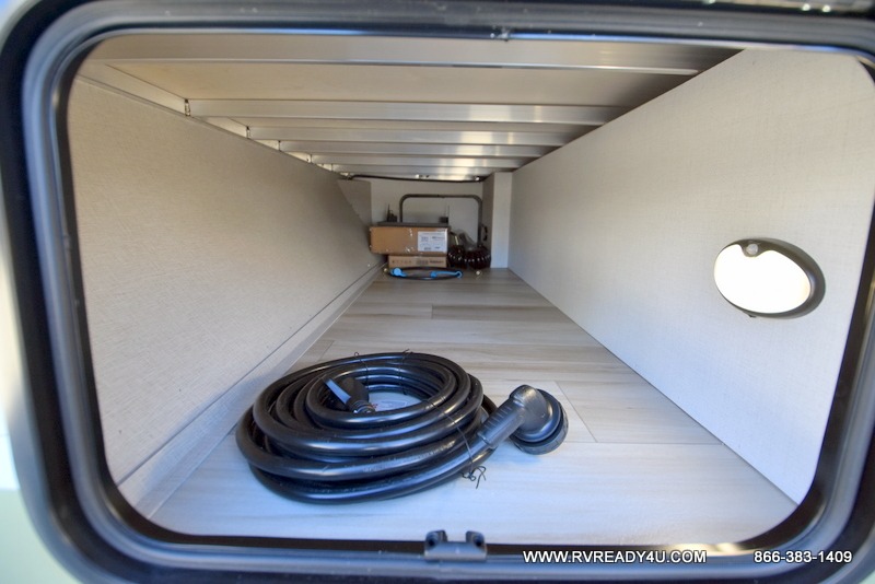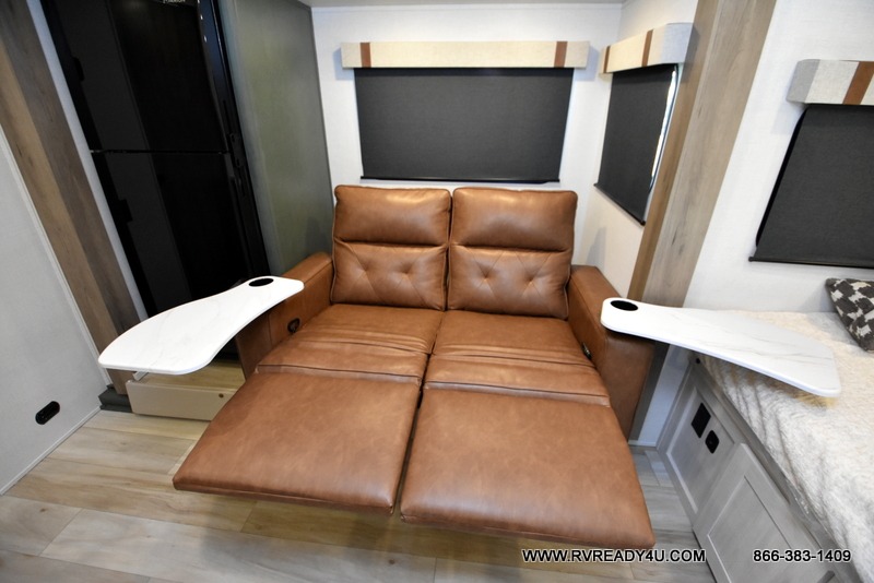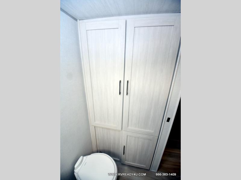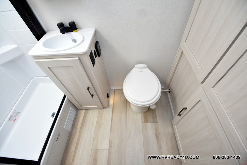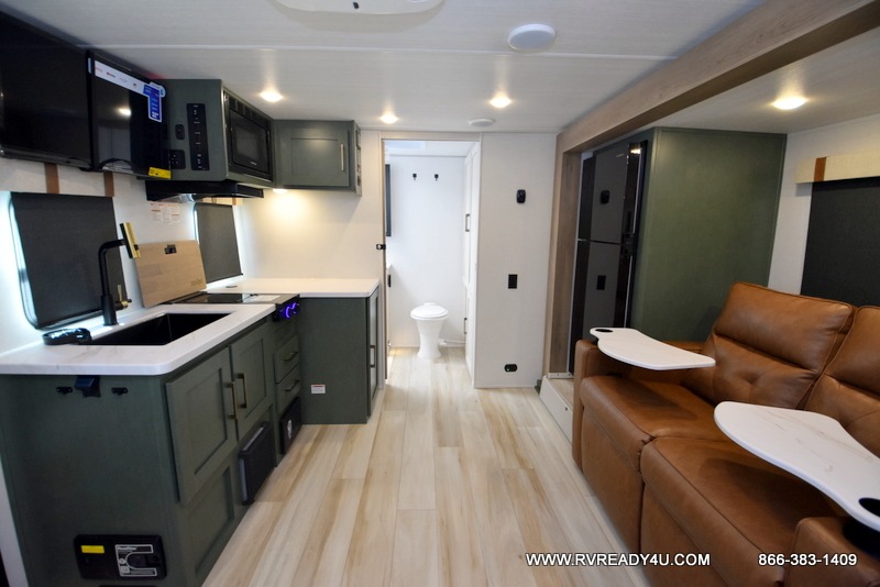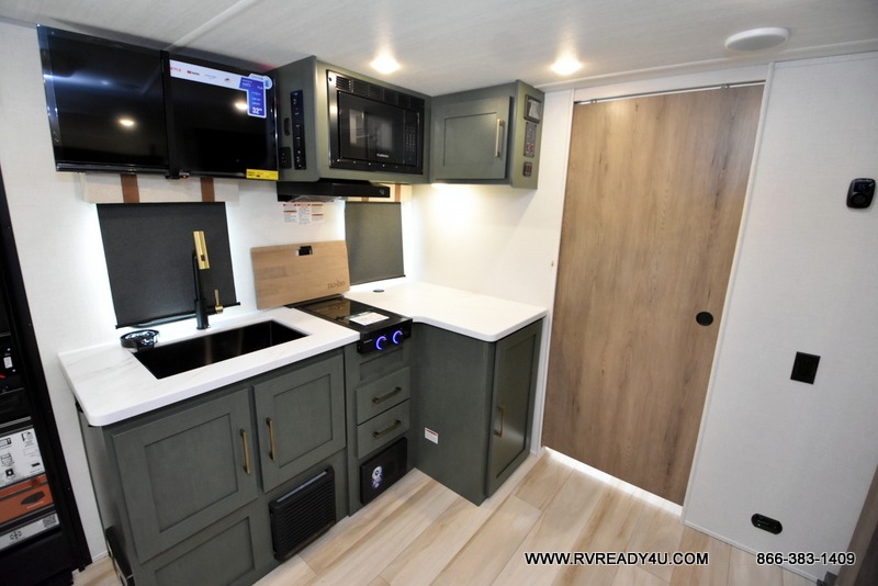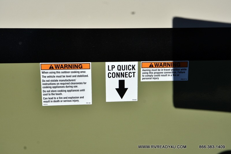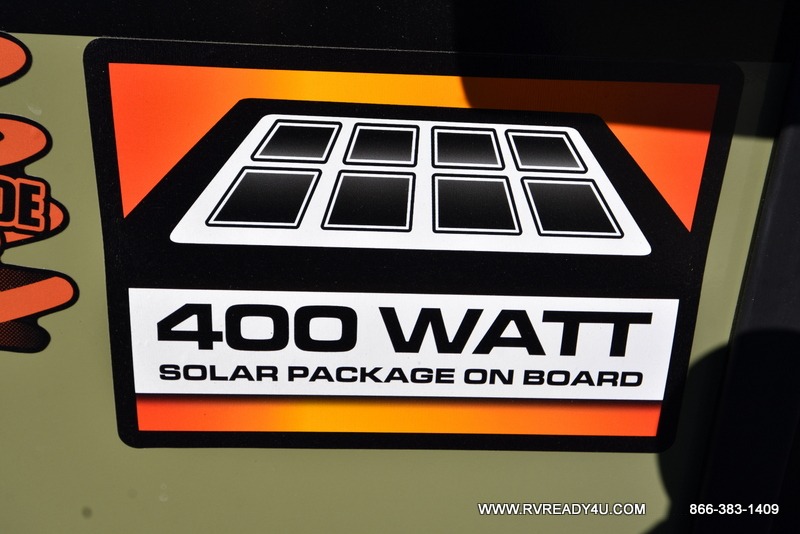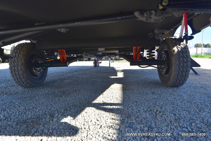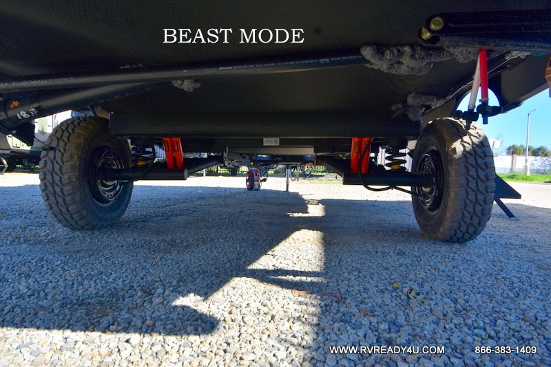This spacious trailer is perfect for weekend trips to the lake! Once you're set up at camp, put out the patio awning, make lunch on the outside kitchen, and grab your camp chairs from the slam latch cargo doors with pass-thru lighting. A jackknife sofa slide inside will provide more space and a place to relax in the evenings, and a full bath means you won't have to use the camp's facilities. The kitchen includes a cooktop and microwave, plus a refrigerator and overhead cabinets for food storage. When it's time to call it a night, the front queen bed is sure to bring comfort! When the optional Beast Mode Package is chosen with this model, you'll find a Beast Mode independent suspension, an additional 200-watt solar panel, a fresh water filter and more!
