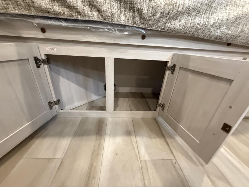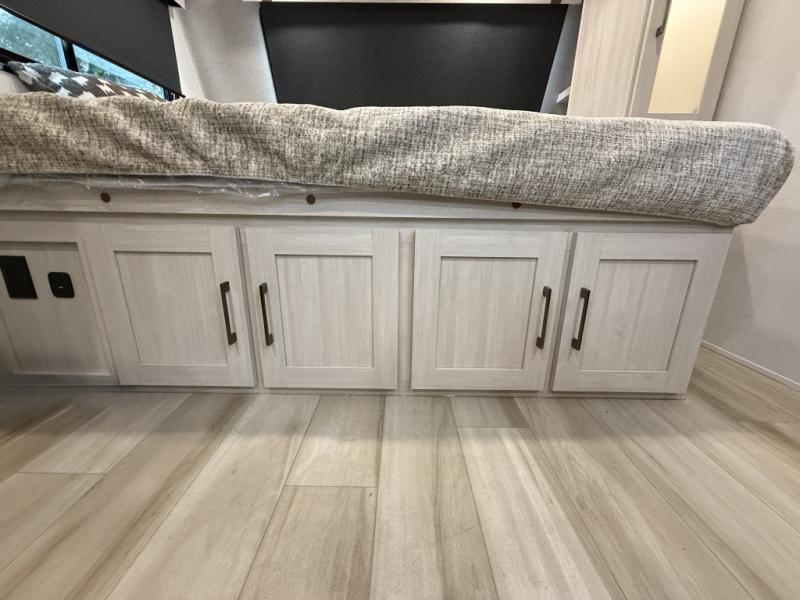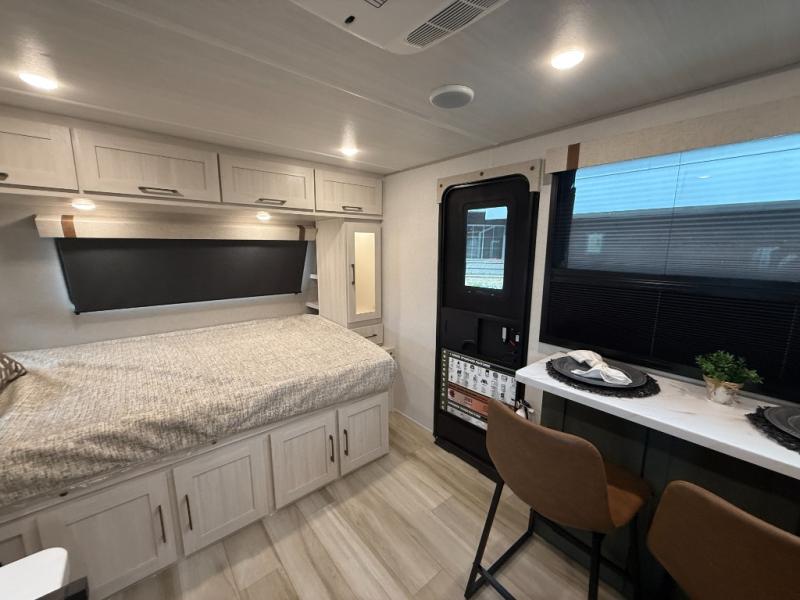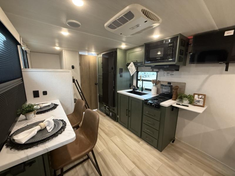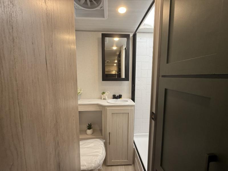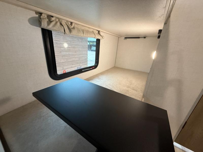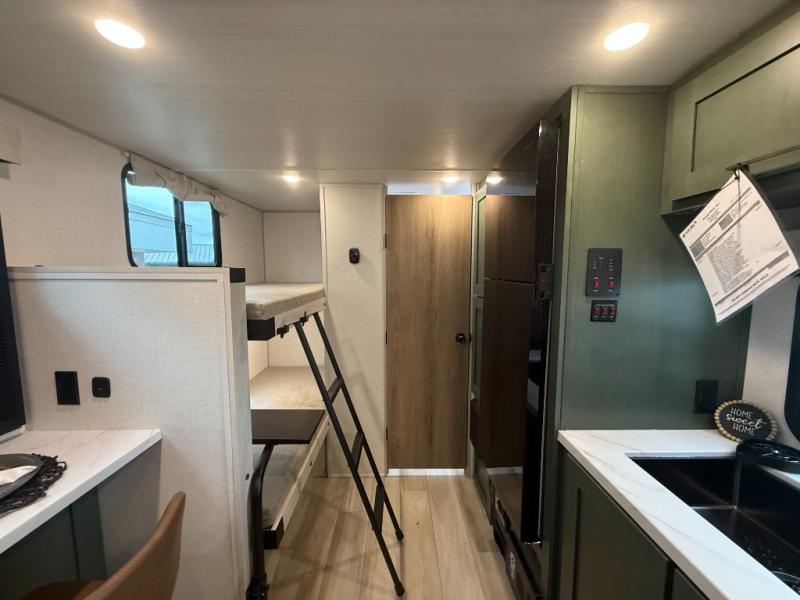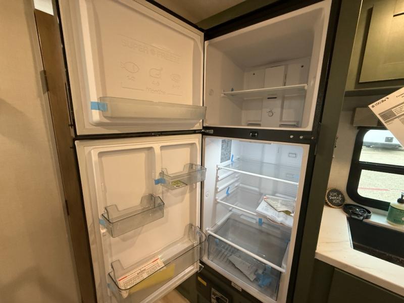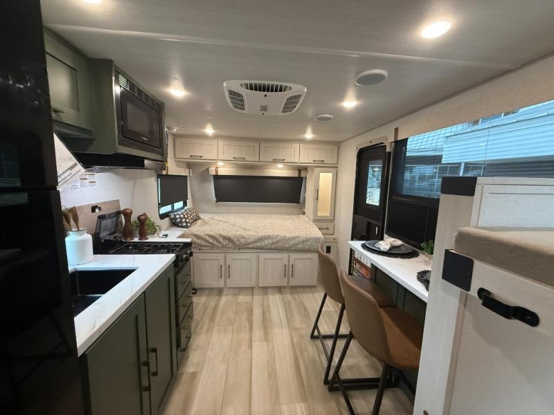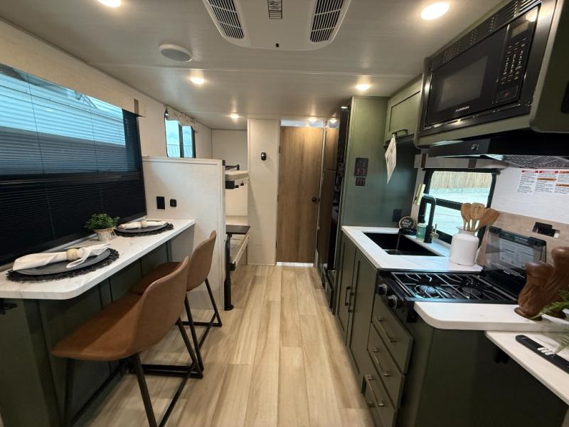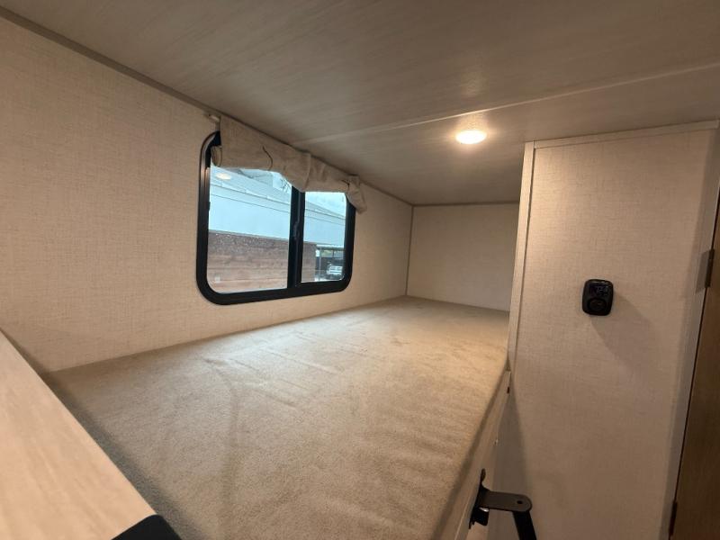 There is much to love about this travel trailer! Starting with the front queen bed to lay your head on at night and the set of 30" x 74" bunk beds for two sleepy travelers. Prepare your best home cooked meals in the fully equipped kitchen then enjoy them at the two chairs with table by the flip-up window. You could even prepare your meals in the great outdoors with the outside kitchen. The full bathroom has everything you need to freshen up after a fun day at the beach. Store all of your outdoor gear in the pass-through storage area with slam latch cargo doors with pass-through lighting too. When the optional Beast Mode Package on this model is chosen, you'll enjoy a 400-watt solar package, a fresh water filter, a Maxxair roof vent cover, plus a Beast Mode independent suspension for better handling.