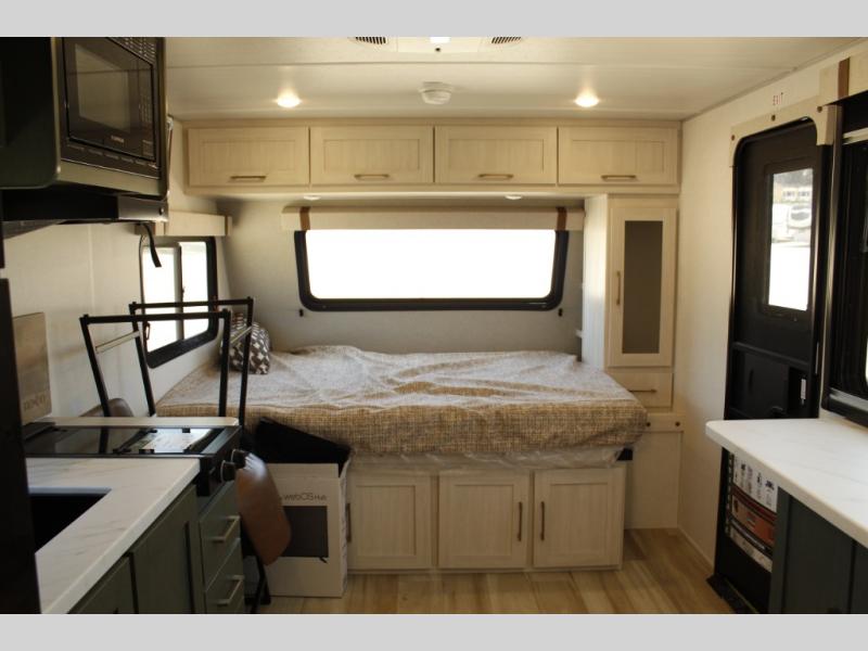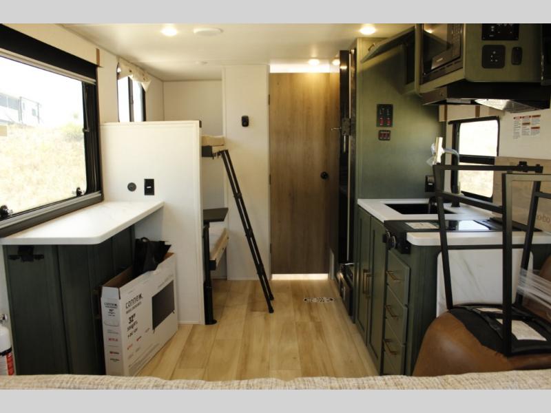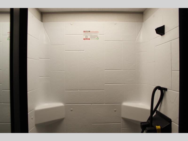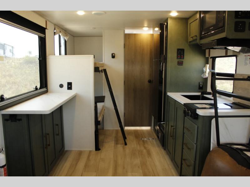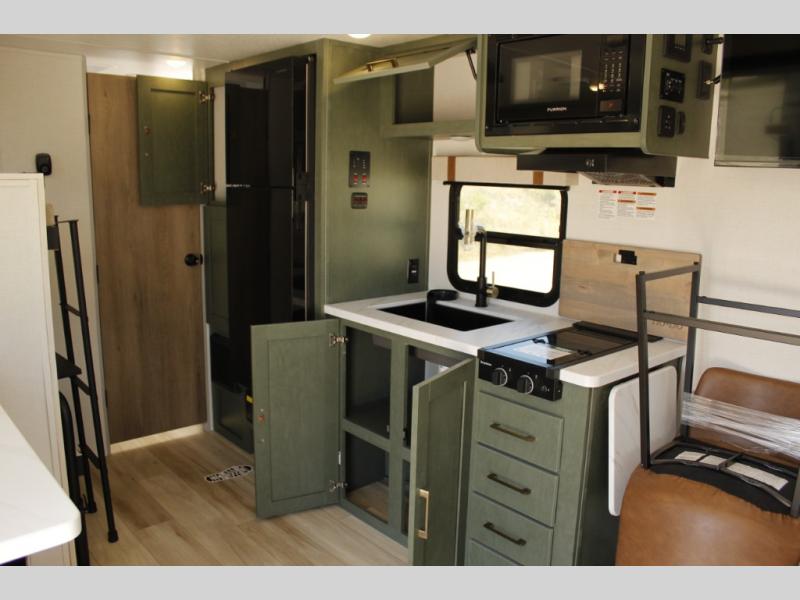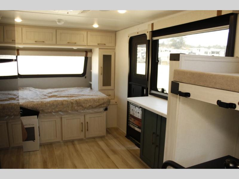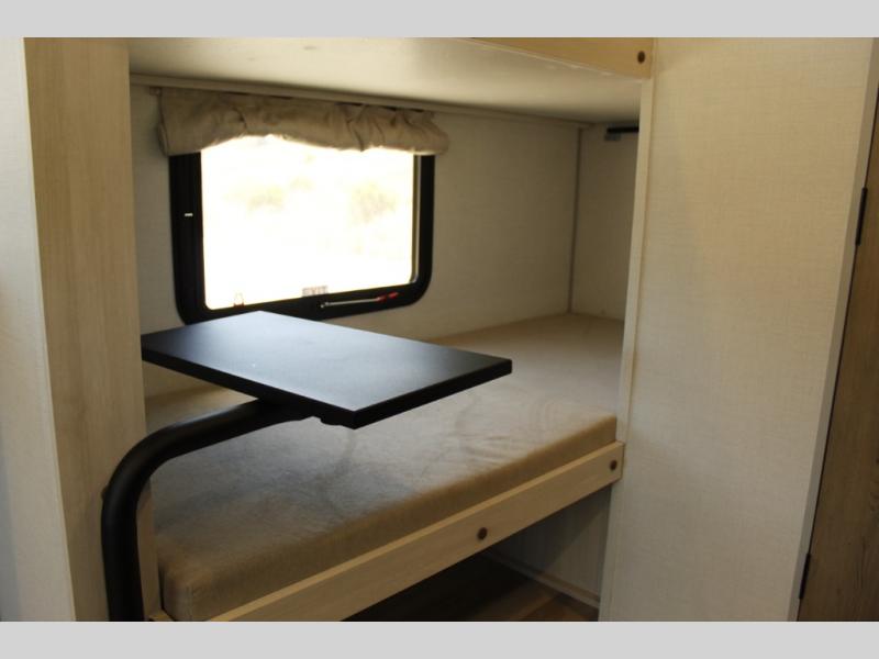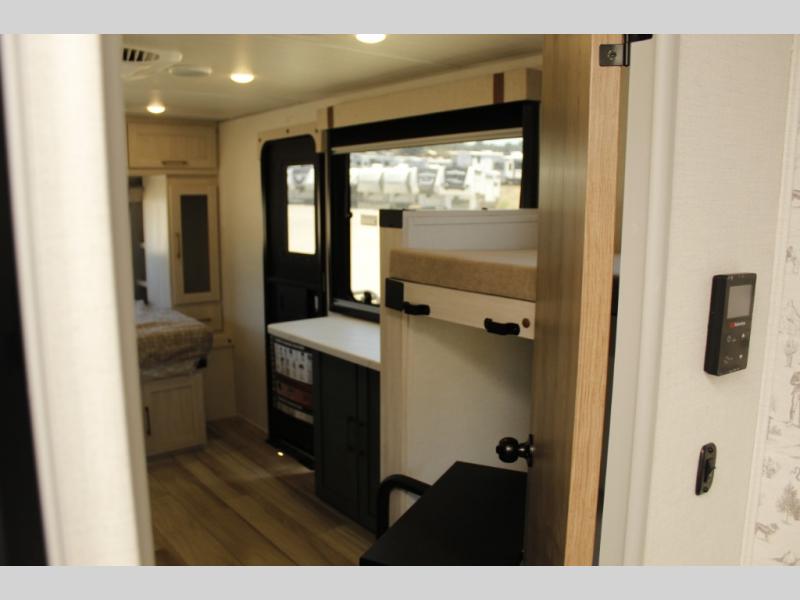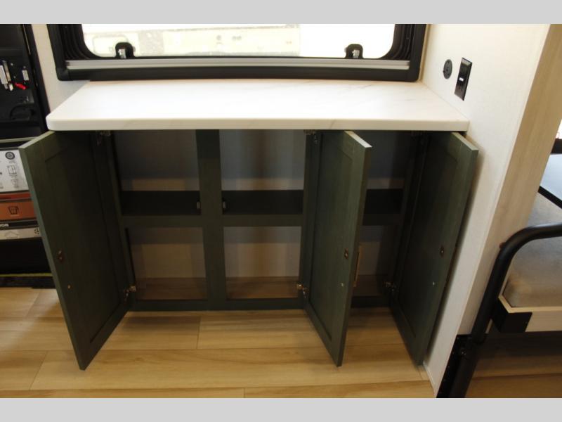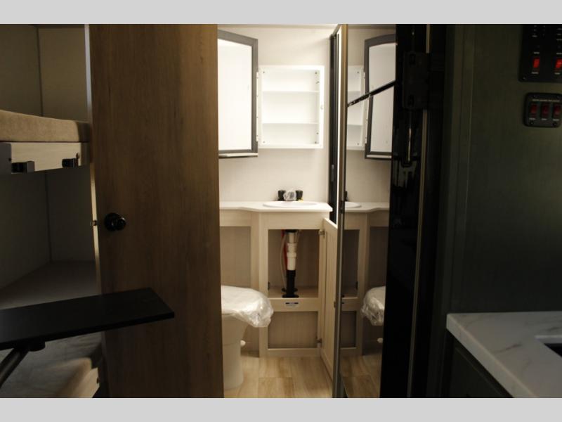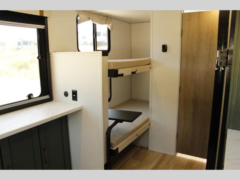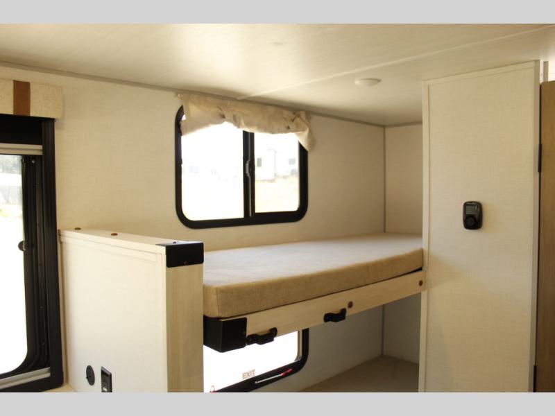 There is much to love about this travel trailer! Starting with the front queen bed to lay your head on at night and the set of 30" x 74" bunk beds for two sleepy travelers. Prepare your best home cooked meals in the fully equipped kitchen then enjoy them at the two chairs with table by the flip-up window. You could even prepare your meals in the great outdoors with the outside kitchen. The full bathroom has everything you need to freshen up after a fun day at the beach. Store all of your outdoor gear in the pass-through storage area with slam latch cargo doors with pass-through lighting too. When the optional Beast Mode Package on this model is chosen, you'll enjoy a 400-watt solar package, a fresh water filter, a Maxxair roof vent cover, plus a Beast Mode independent suspension for better handling.