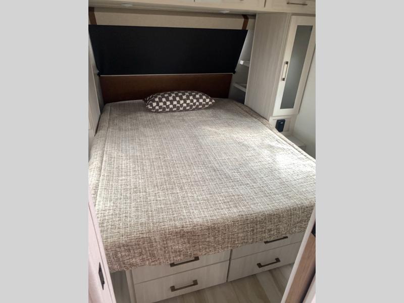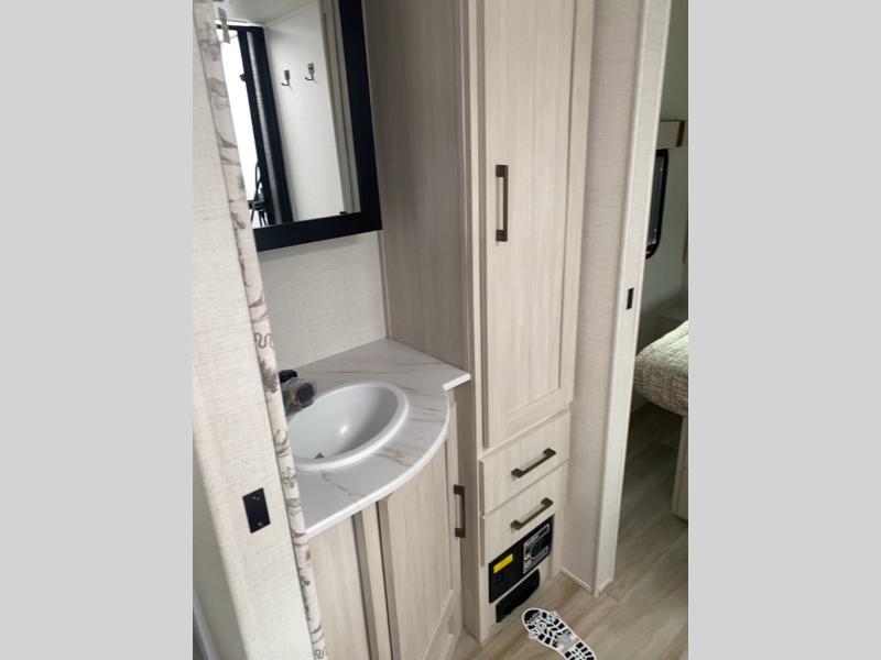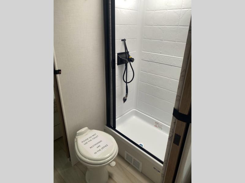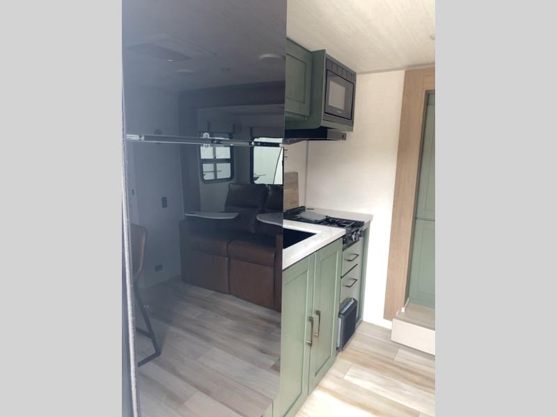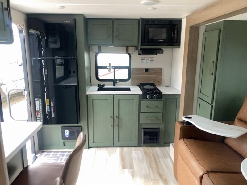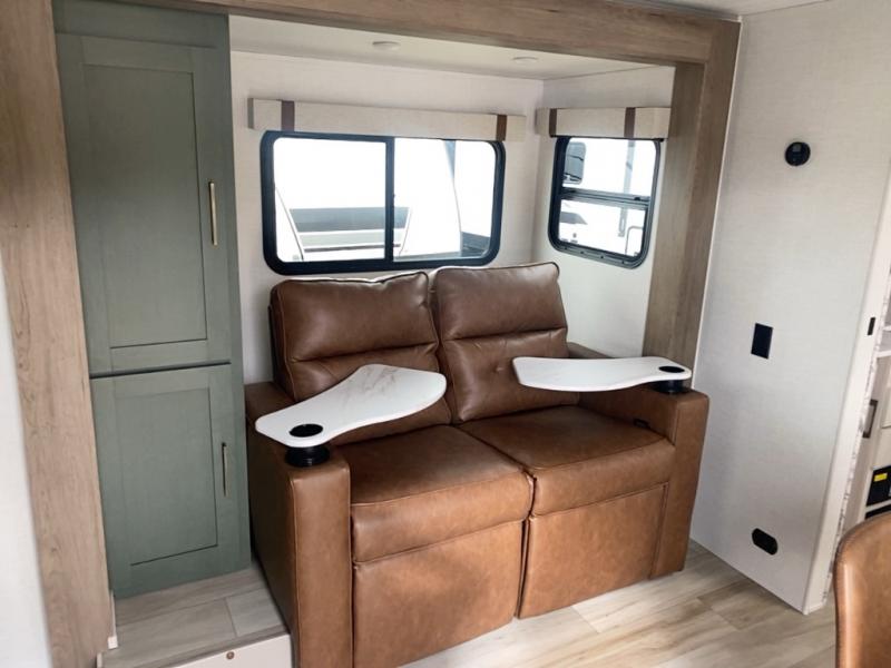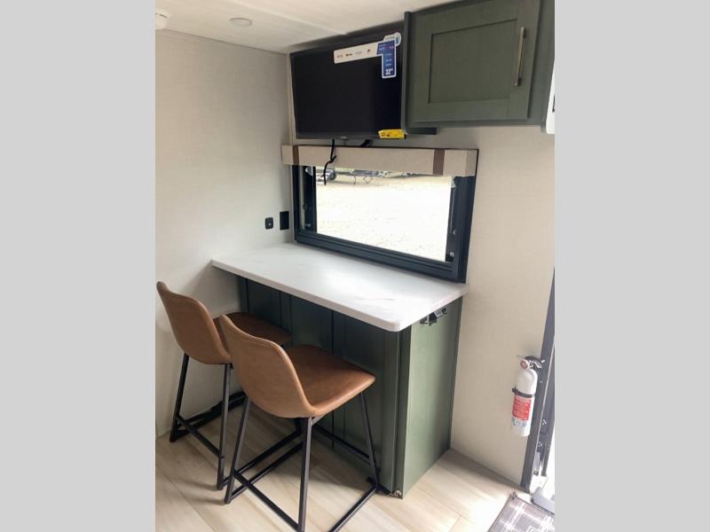 You'll love camping in this couple's trailer! There is a queen bed in the front bedroom, along with dual bedside wardrobes and overhead storage for clothes, books and more. And don't overlook the spacious walk-thru bath! Once you've made breakfast in the rear kitchen or on the outside kitchen, you can dine at the bar top with chairs and a flip-up window. There is also a Trailgate Outdoor Bar if you decide to dine outdoors!