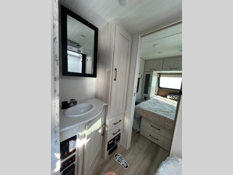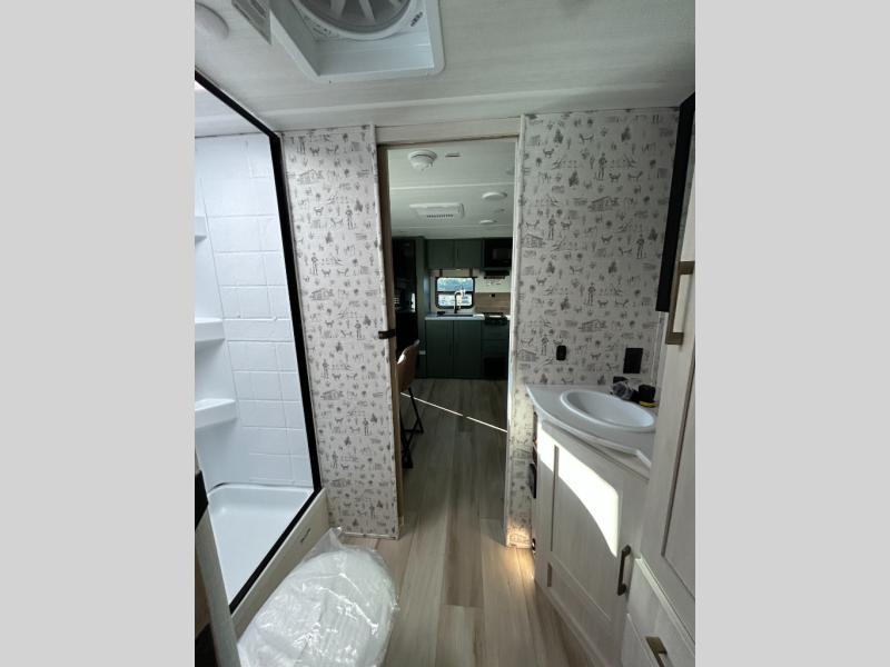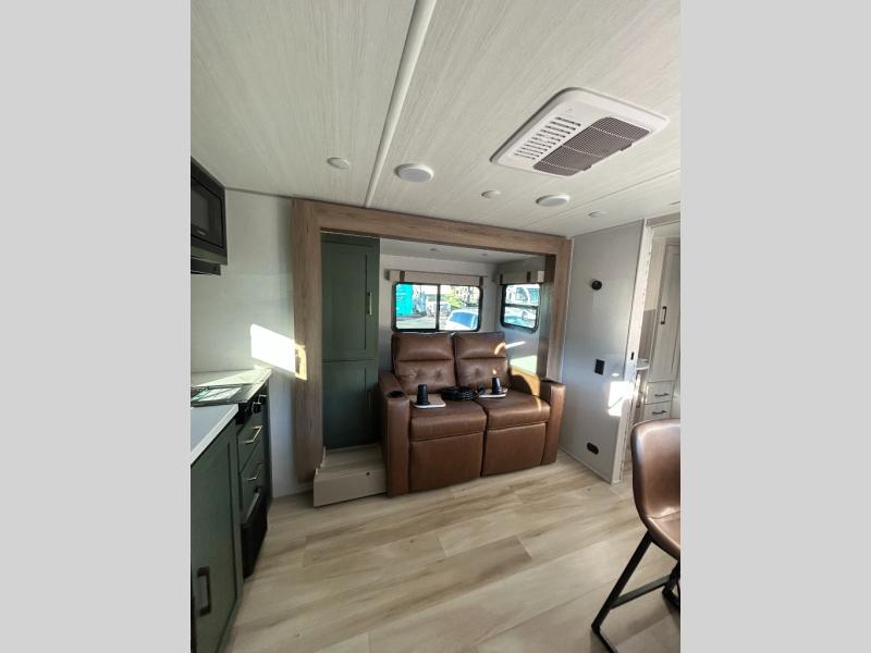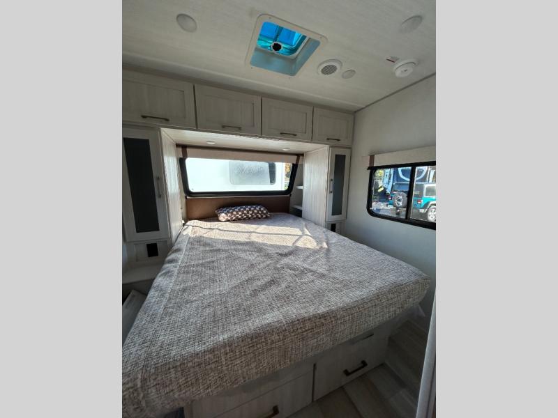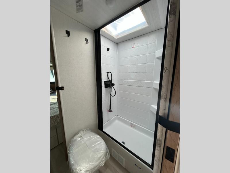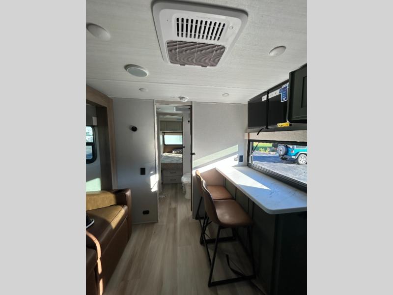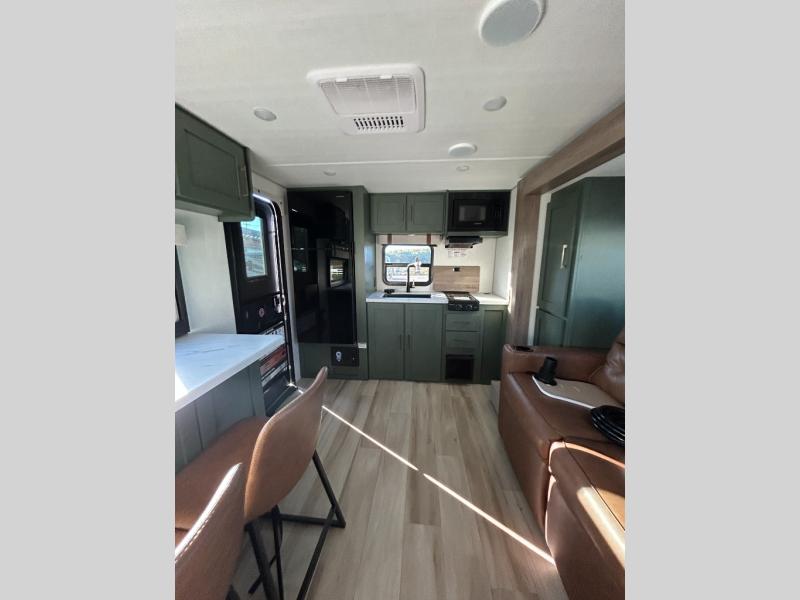 You'll love camping in this couple's trailer! There is a queen bed in the front bedroom, along with dual bedside wardrobes and overhead storage for clothes, books and more. And don't overlook the spacious walk-thru bath! Once you've made breakfast in the rear kitchen or on the outside kitchen, you can dine at the bar top with chairs and a flip-up window. There is also a Trailgate Outdoor Bar if you decide to dine outdoors!