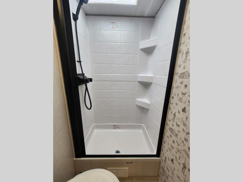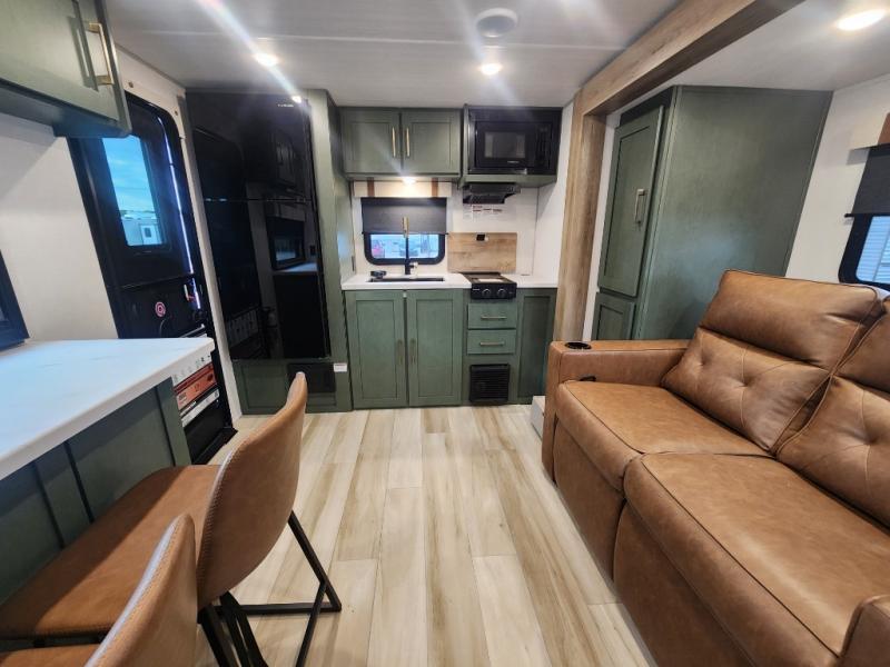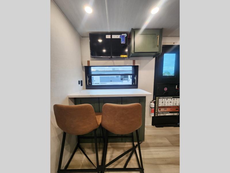 You'll love camping in this couple's trailer! There is a queen bed in the front bedroom, along with dual bedside wardrobes and overhead storage for clothes, books and more. And don't overlook the spacious walk-thru bath! Once you've made breakfast in the rear kitchen or on the outside kitchen, you can dine at the bar top with chairs and a flip-up window. There is also a Trailgate Outdoor Bar if you decide to dine outdoors!