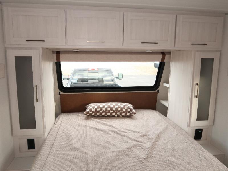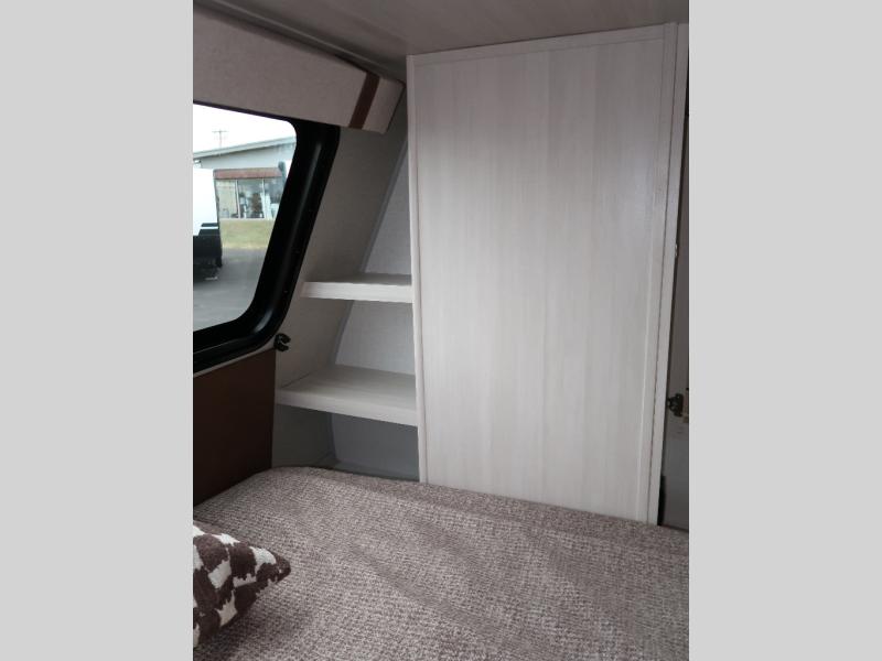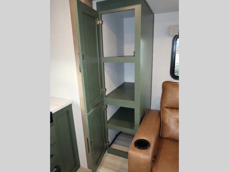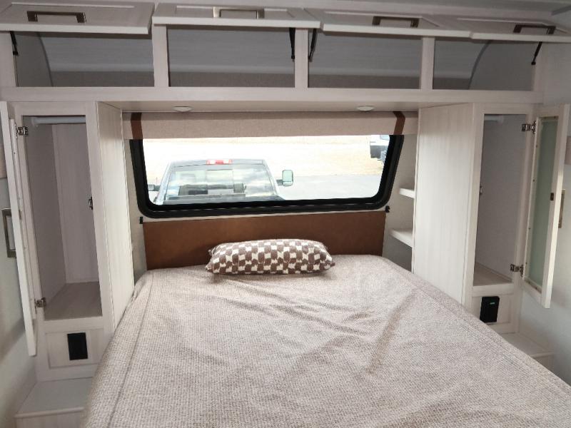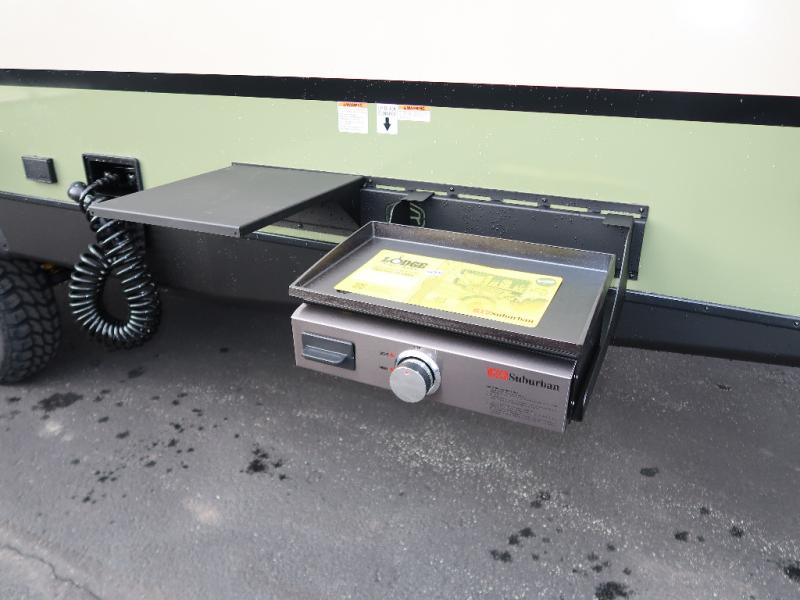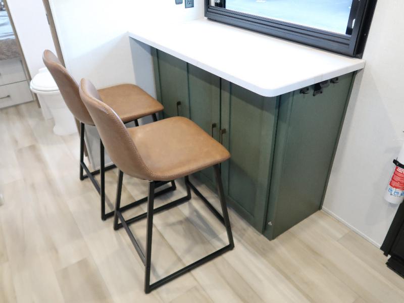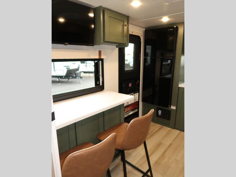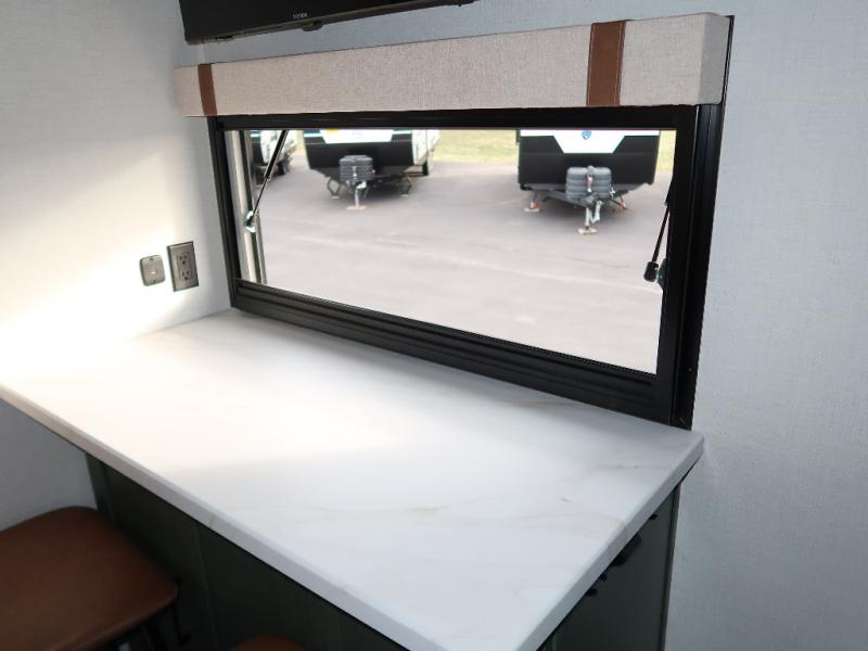 You'll love camping in this couple's trailer! There is a queen bed in the front bedroom, along with dual bedside wardrobes and overhead storage for clothes, books and more. And don't overlook the spacious walk-thru bath! Once you've made breakfast in the rear kitchen or on the outside kitchen, you can dine at the bar top with chairs and a flip-up window. There is also a Trailgate Outdoor Bar if you decide to dine outdoors!