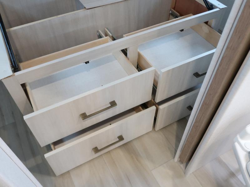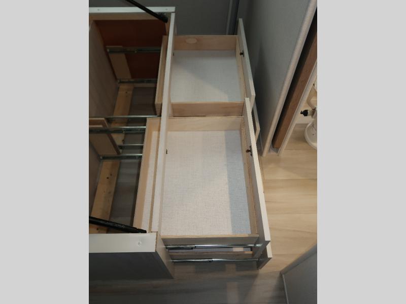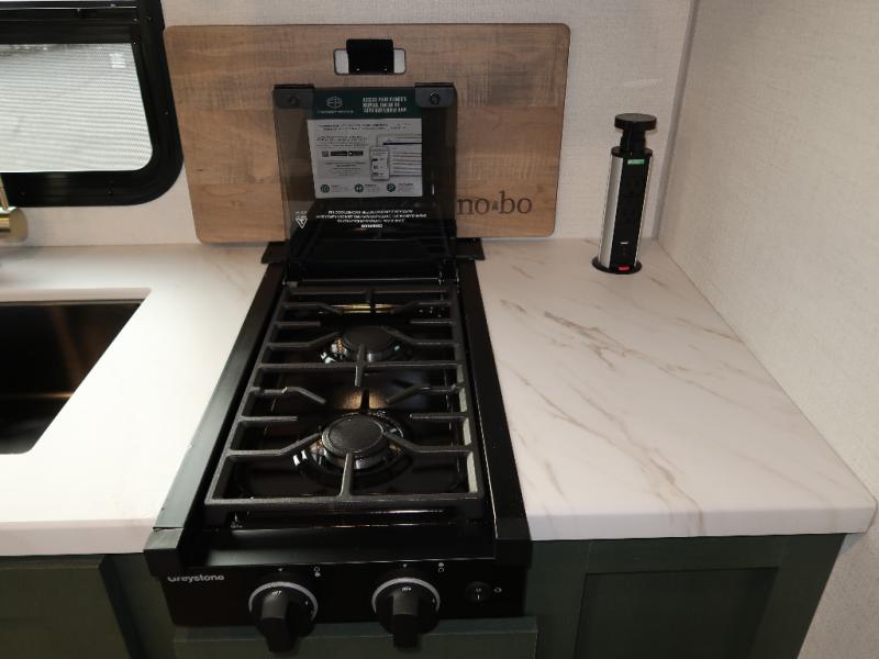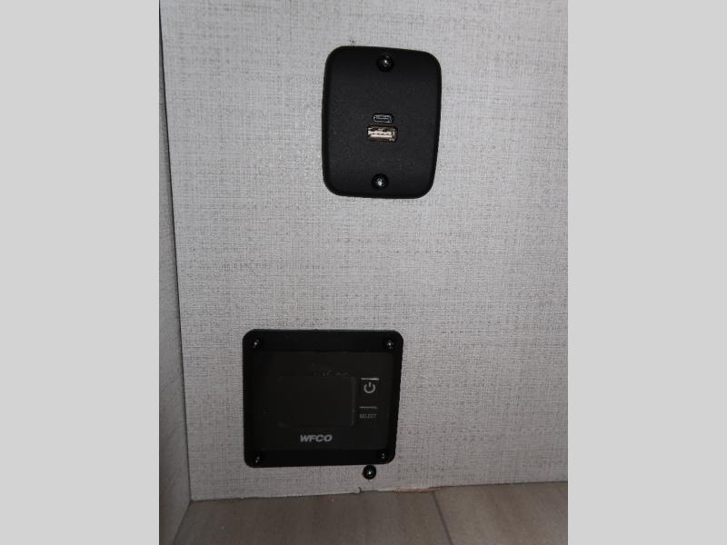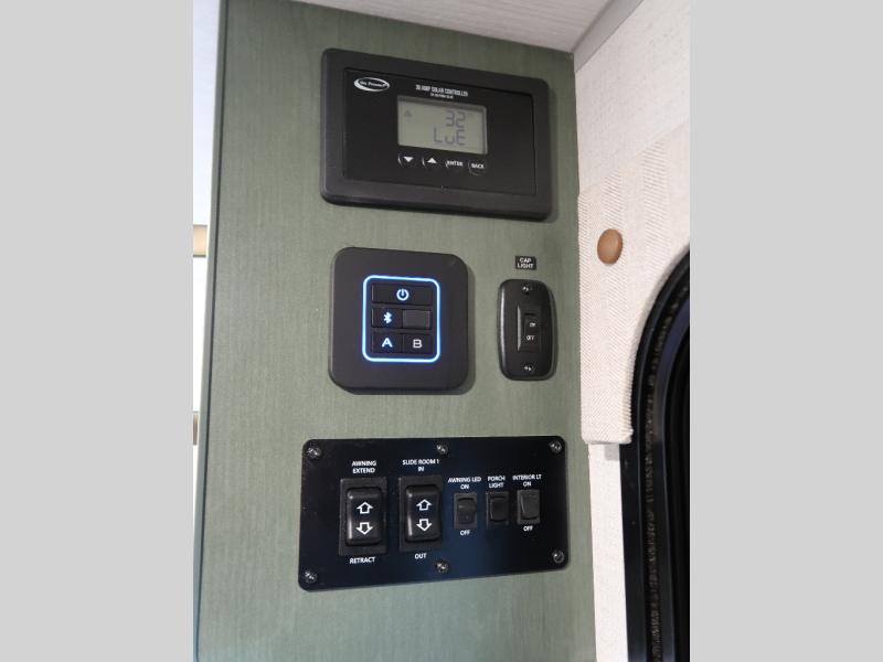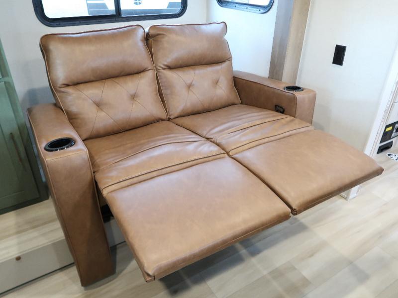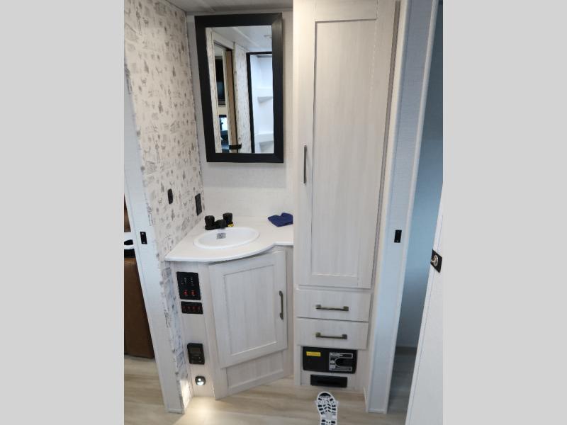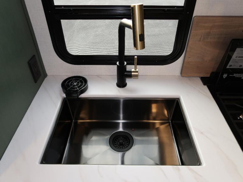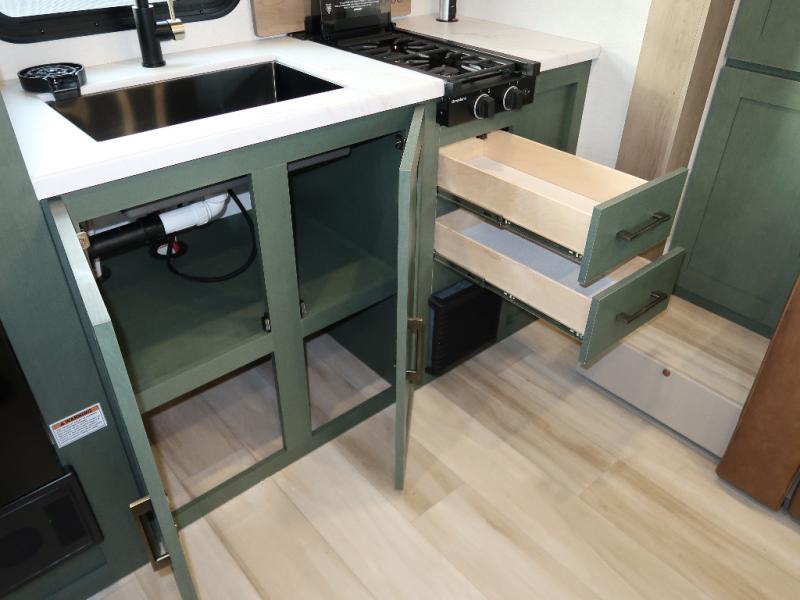 You'll love camping in this couple's trailer! There is a queen bed in the front bedroom, along with dual bedside wardrobes and overhead storage for clothes, books and more. And don't overlook the spacious walk-thru bath! Once you've made breakfast in the rear kitchen or on the outside kitchen, you can dine at the bar top with chairs and a flip-up window. There is also a Trailgate Outdoor Bar if you decide to dine outdoors!