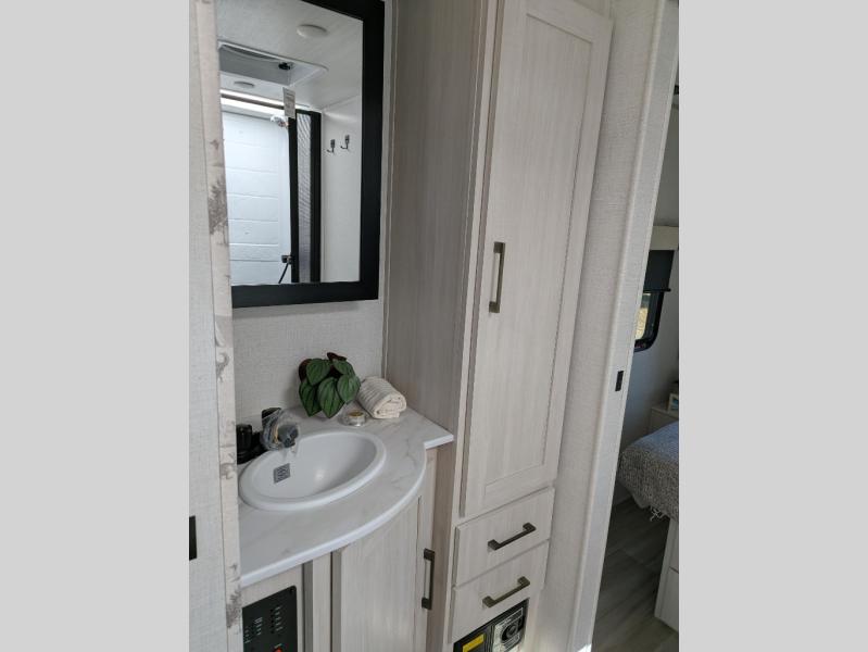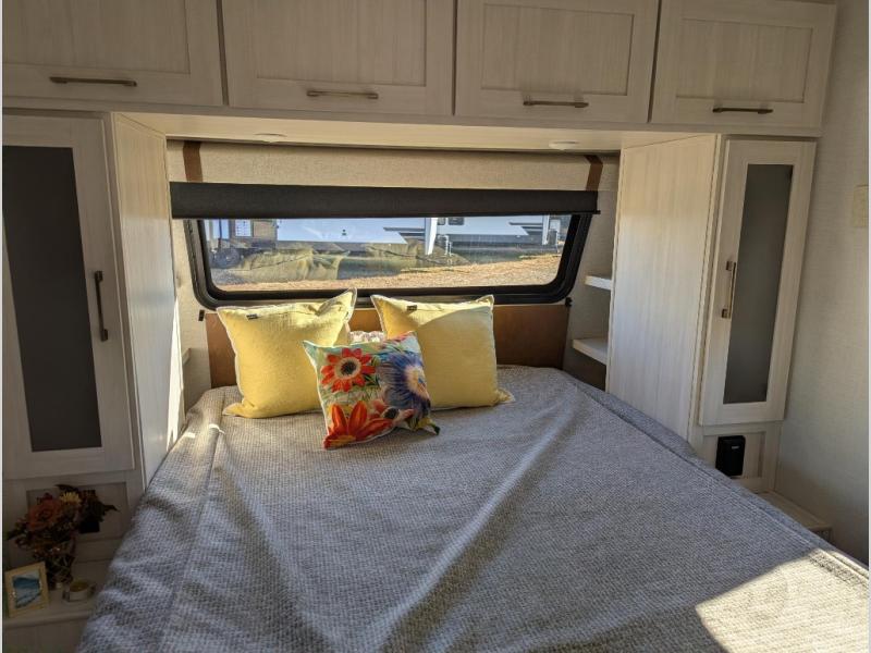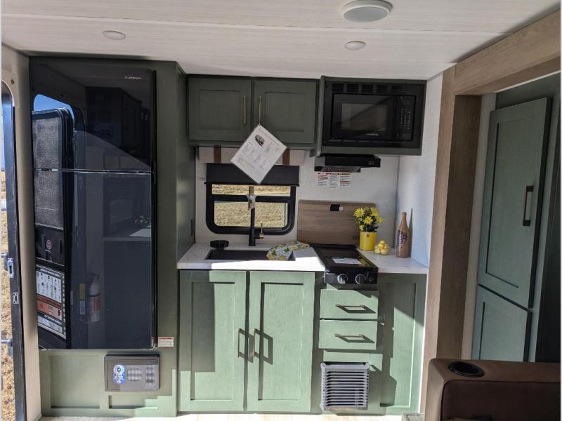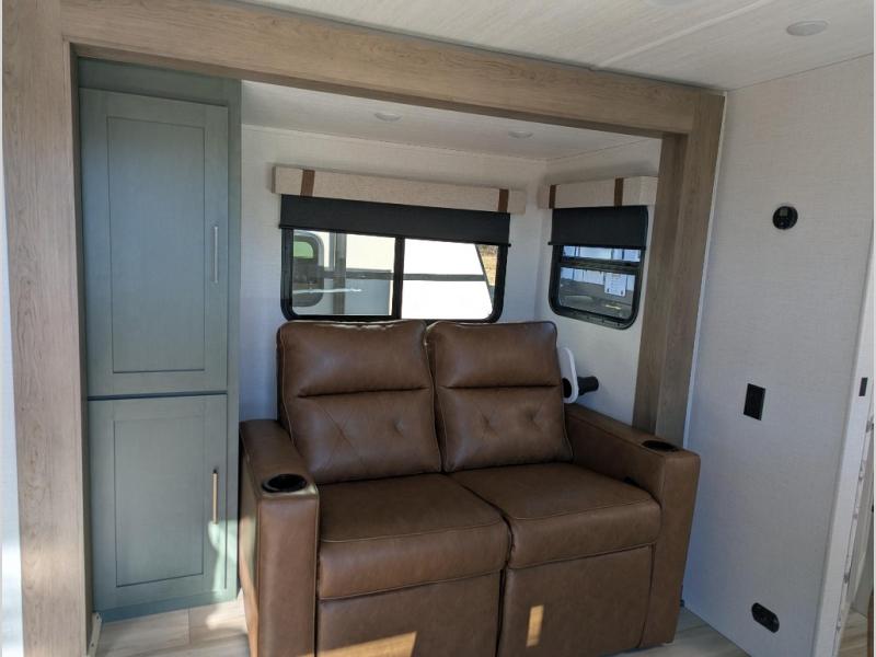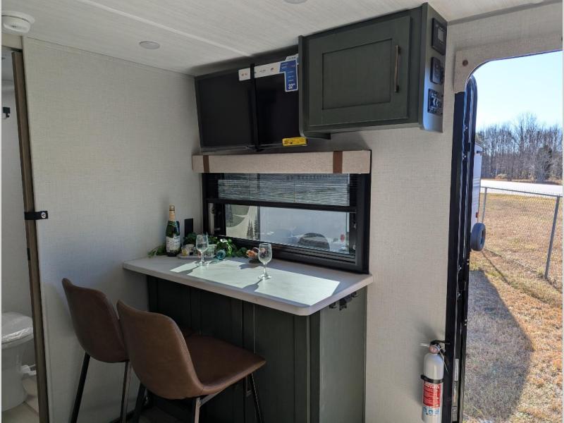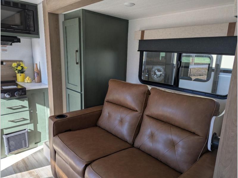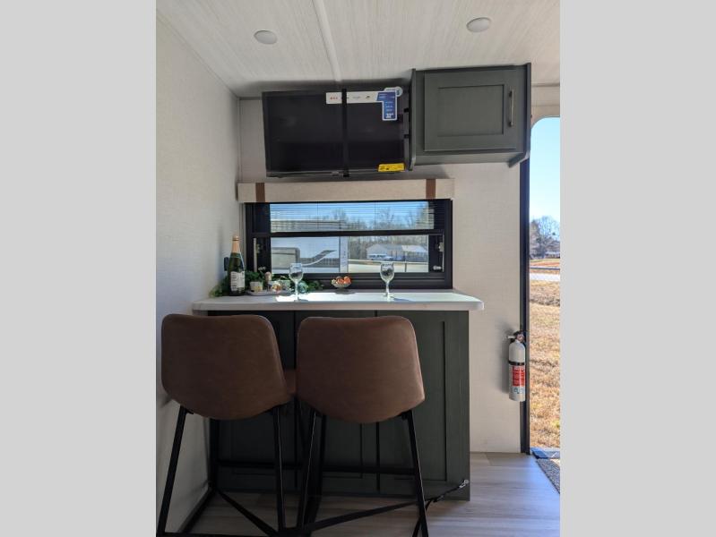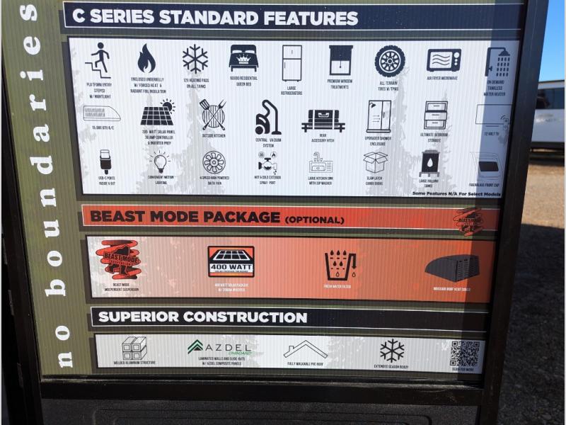 Take this No Boundaries travel trailer out for a no-stress weekend! The rear kitchen comes with a pantry, microwave and air fryer plus a sink to help you stay on top of the daily meals. Take breakfast in the bar 2 table while enjoying great ventilation provided by the flip-up window that over looks the Trailgate Cafe built-in prep top that's new for 2026 along with your outdoor kitchen! The walk-through bathroom has everything you need to freshen up, and it leads directly in to the private bedroom which has a queen bed, with dual bedside wardrobes to keep your things tidy and a large window to keep it bright. When the optional Beast Mode Package on this model is chosen, you'll enjoy a 400-watt solar package, a fresh water filter, a Maxxair roof vent cover, plus a Beast Mode independent suspension for better handling.