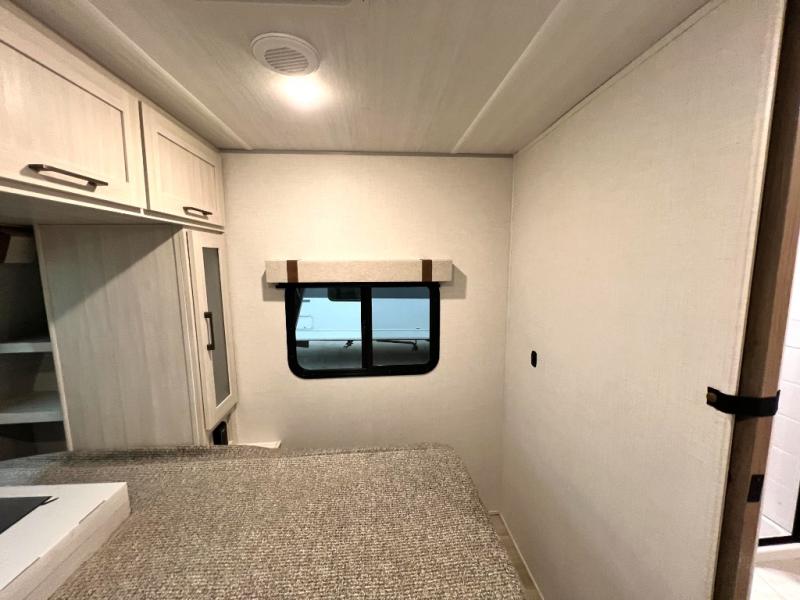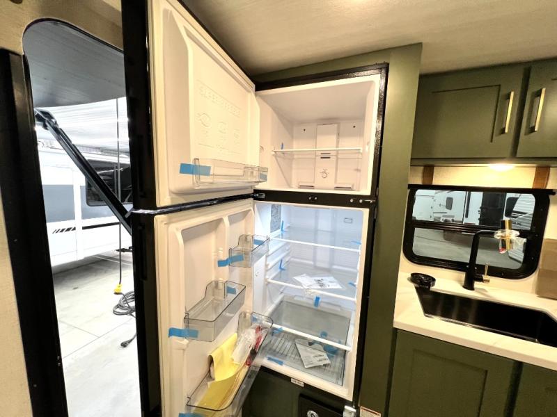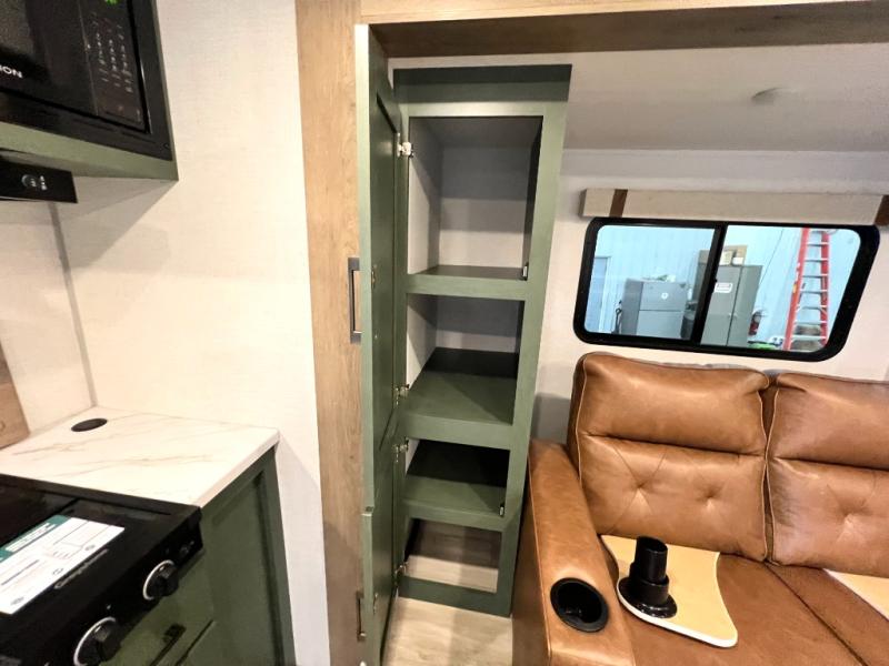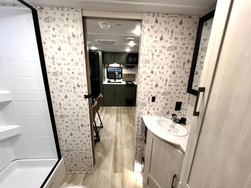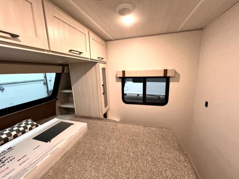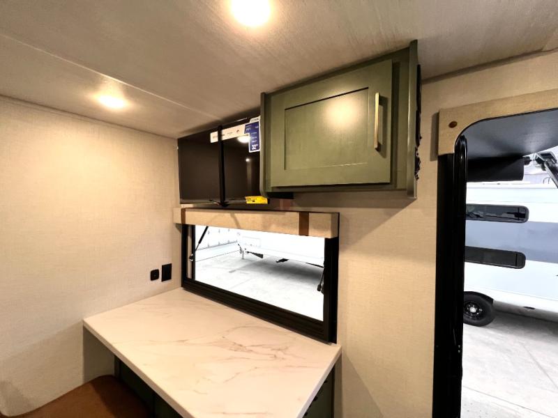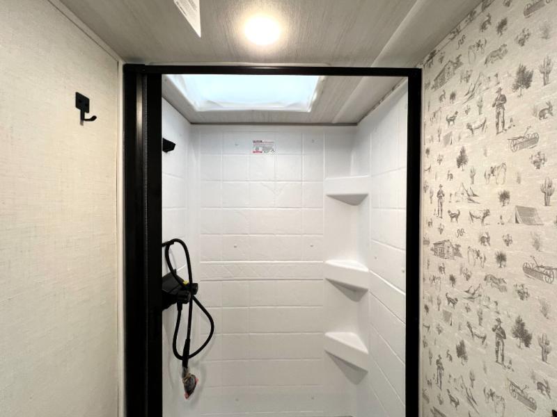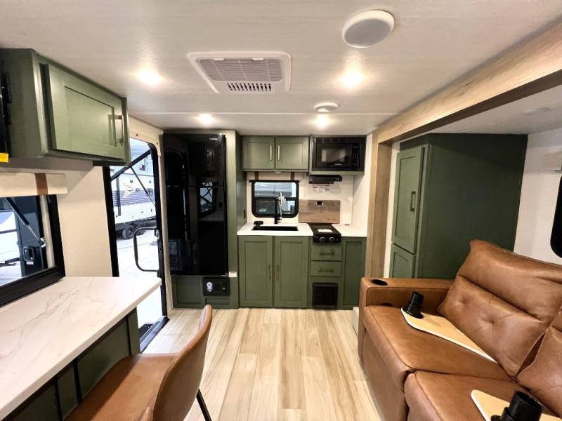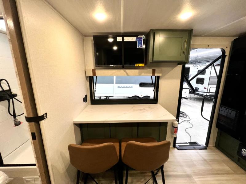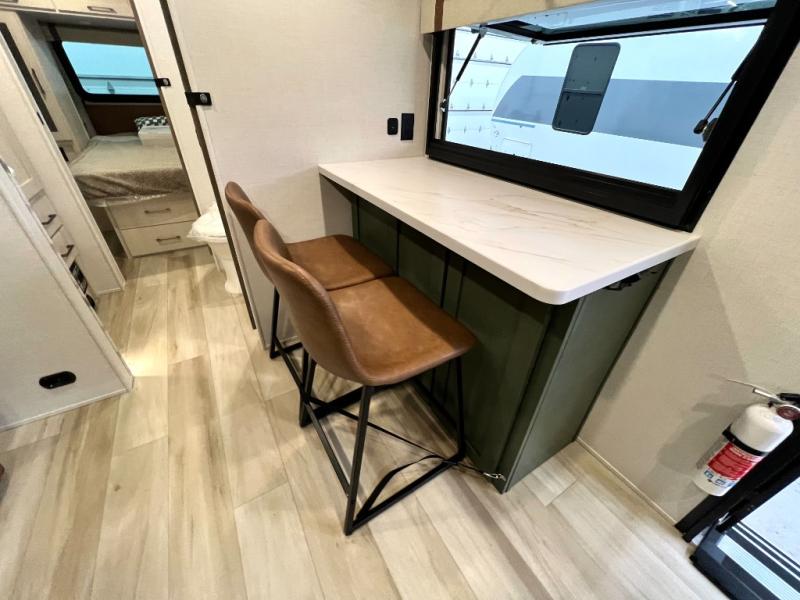 You'll love camping in this couple's trailer! There is a queen bed in the front bedroom, along with dual bedside wardrobes and overhead storage for clothes, books and more. And don't overlook the spacious walk-thru bath! Once you've made breakfast in the rear kitchen or on the outside kitchen, you can dine at the bar top with chairs and a flip-up window. There is also a Trailgate Outdoor Bar if you decide to dine outdoors!