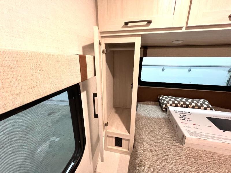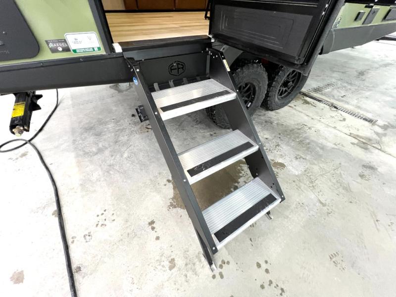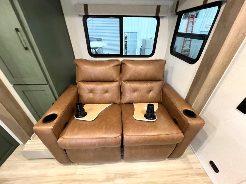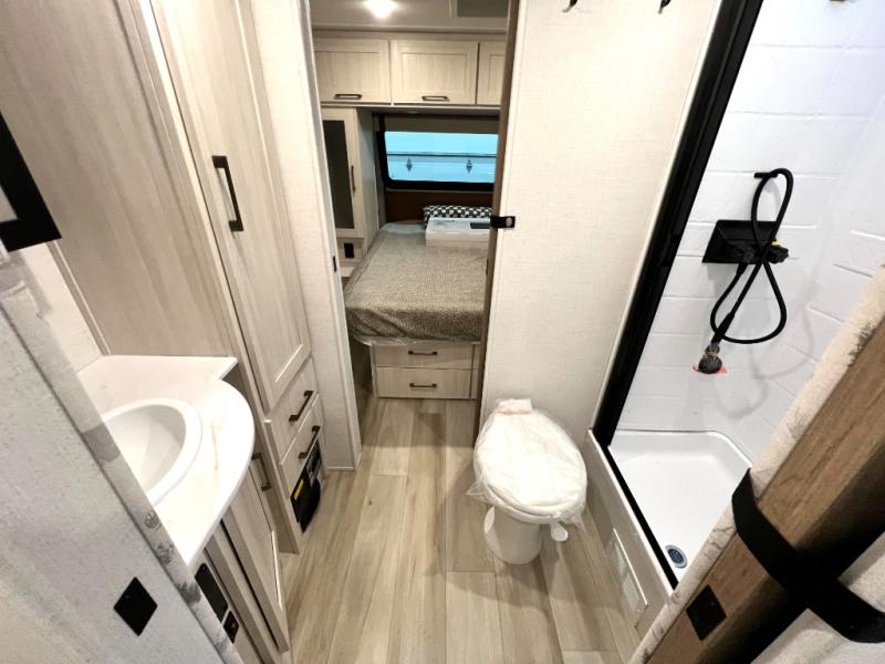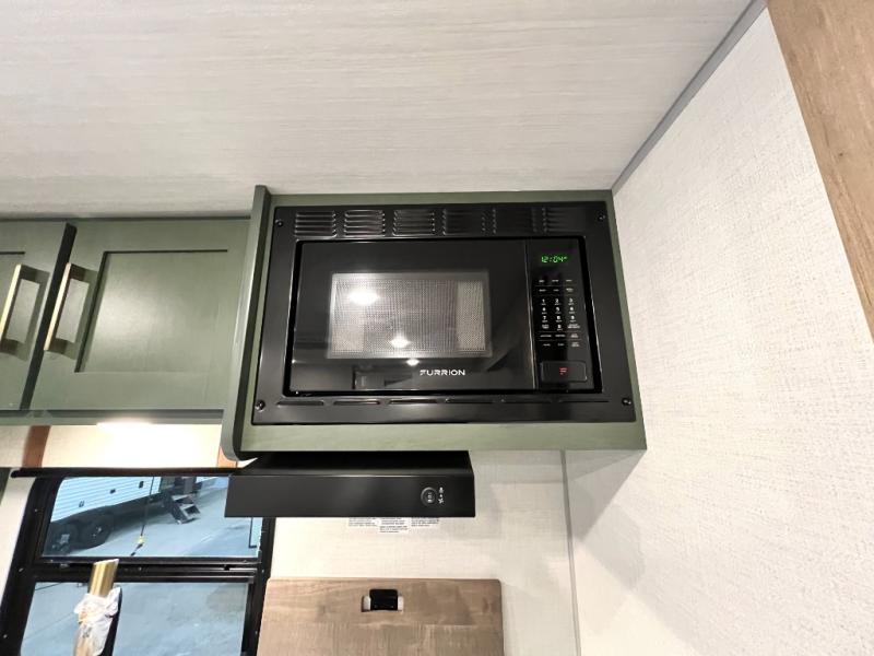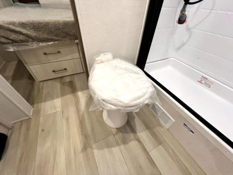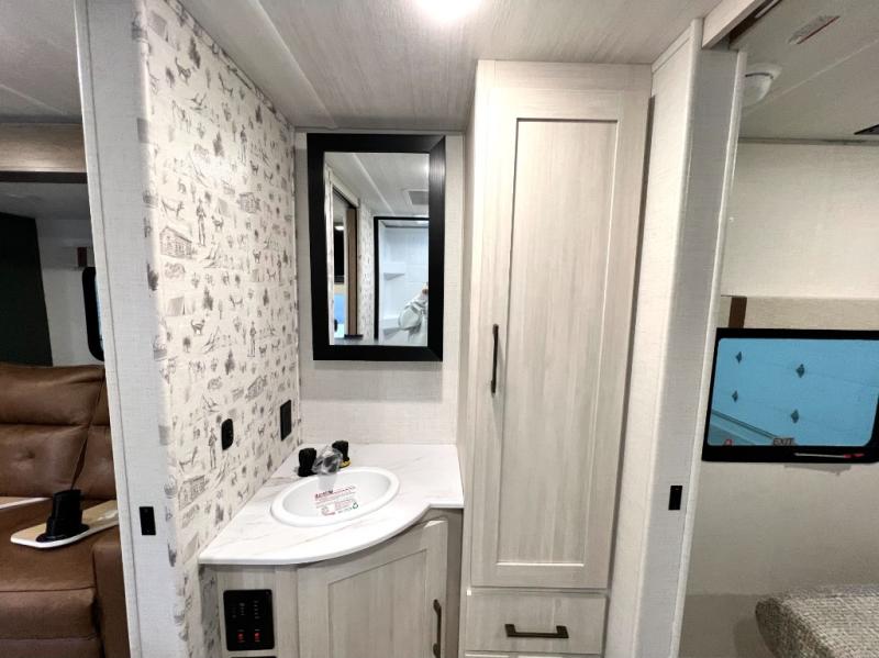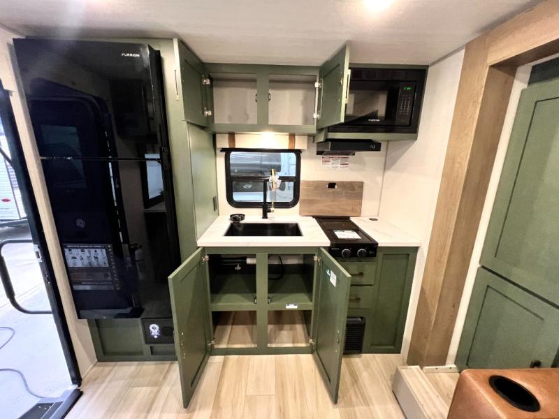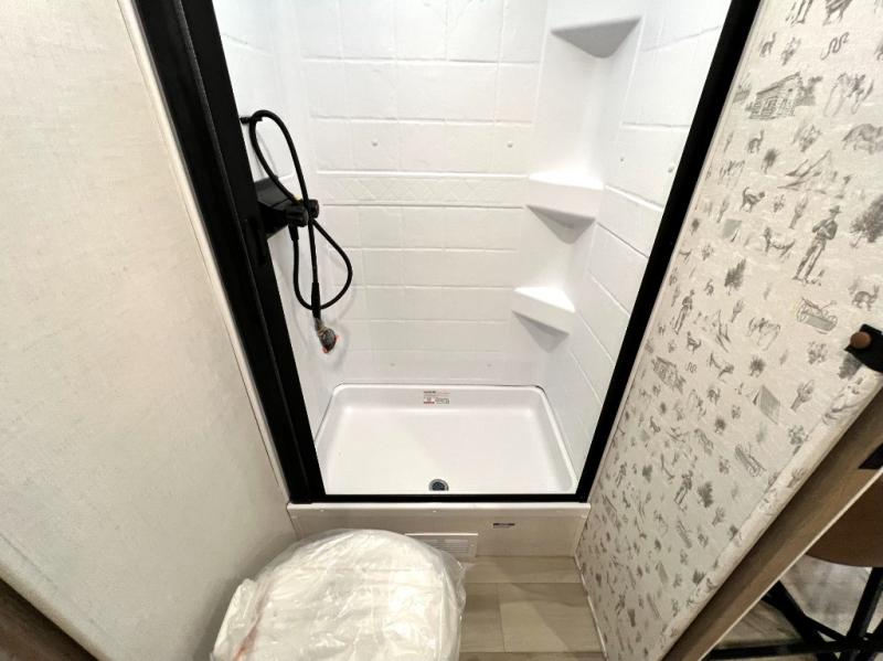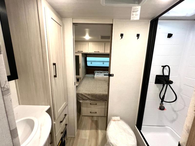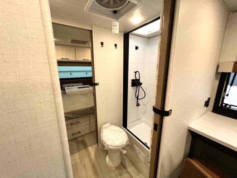 You'll love camping in this couple's trailer! There is a queen bed in the front bedroom, along with dual bedside wardrobes and overhead storage for clothes, books and more. And don't overlook the spacious walk-thru bath! Once you've made breakfast in the rear kitchen or on the outside kitchen, you can dine at the bar top with chairs and a flip-up window. There is also a Trailgate Outdoor Bar if you decide to dine outdoors!