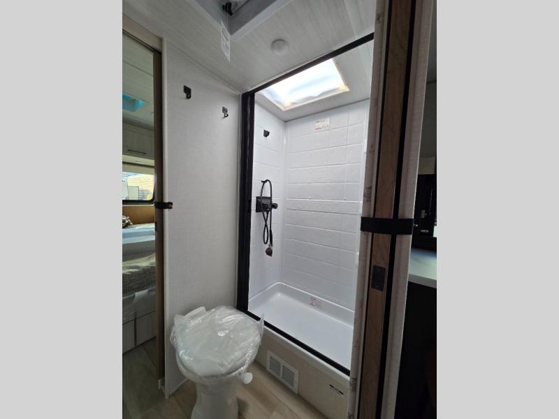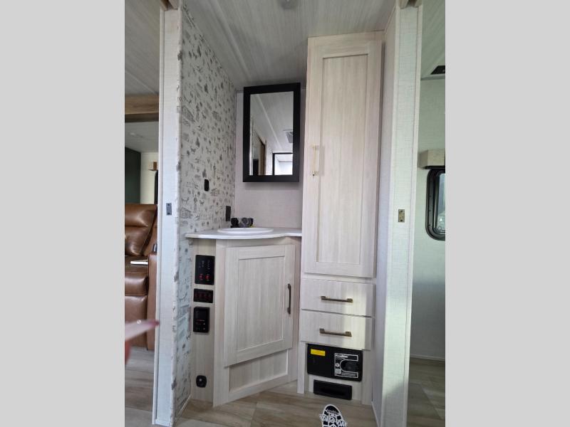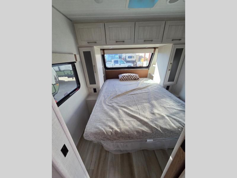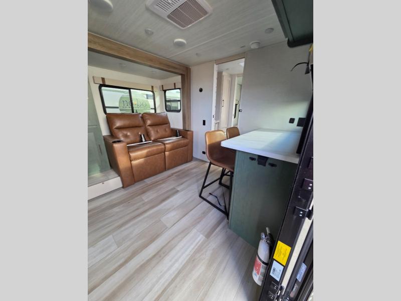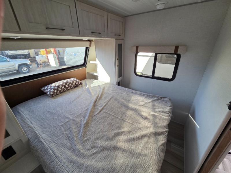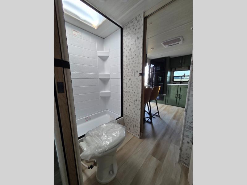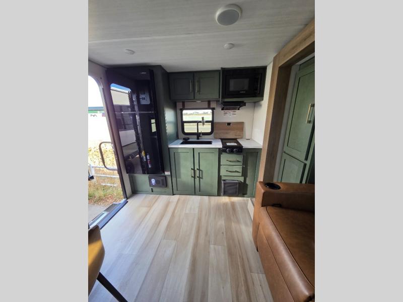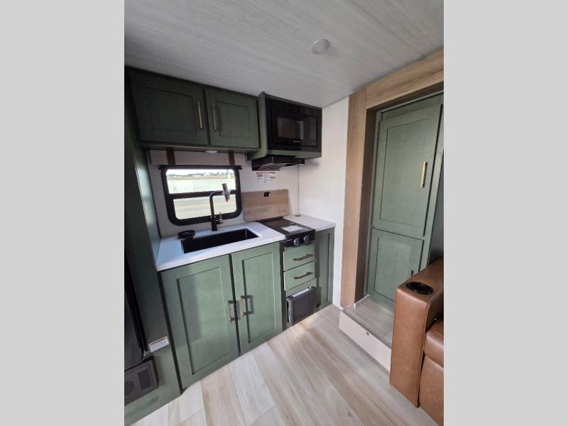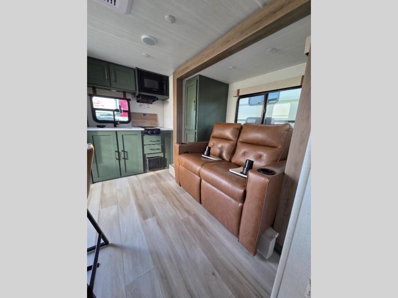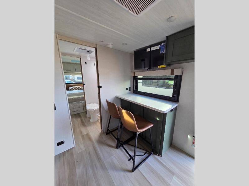 You'll love camping in this couple's trailer! There is a queen bed in the front bedroom, along with dual bedside wardrobes and overhead storage for clothes, books and more. And don't overlook the spacious walk-thru bath! Once you've made breakfast in the rear kitchen or on the outside kitchen, you can dine at the bar top with chairs and a flip-up window. There is also a Trailgate Outdoor Bar if you decide to dine outdoors!