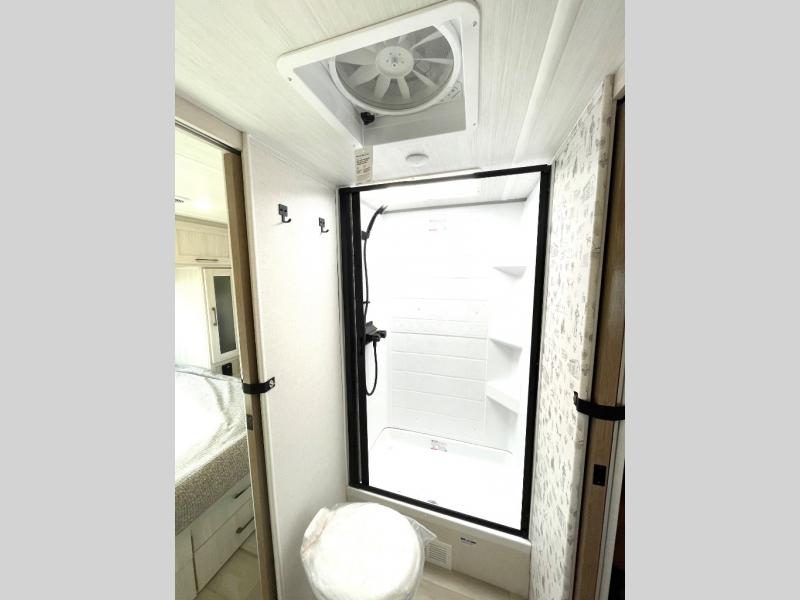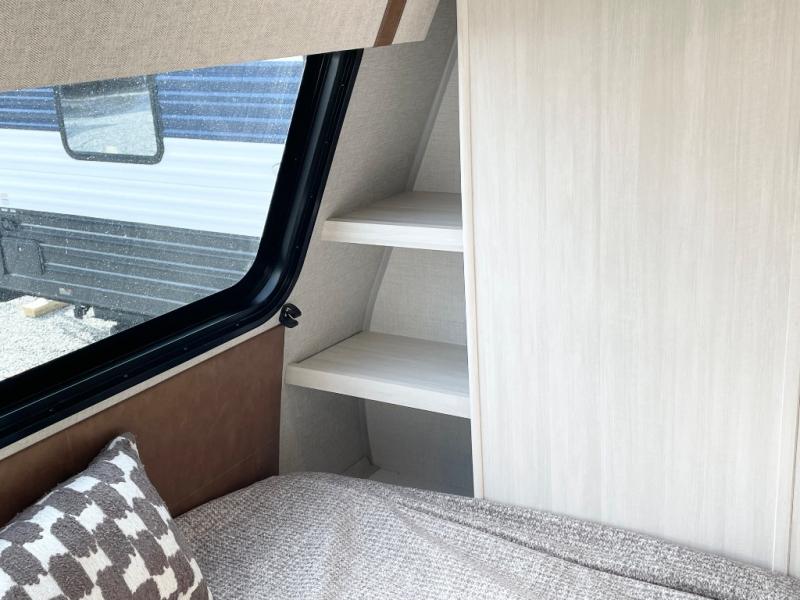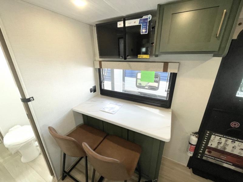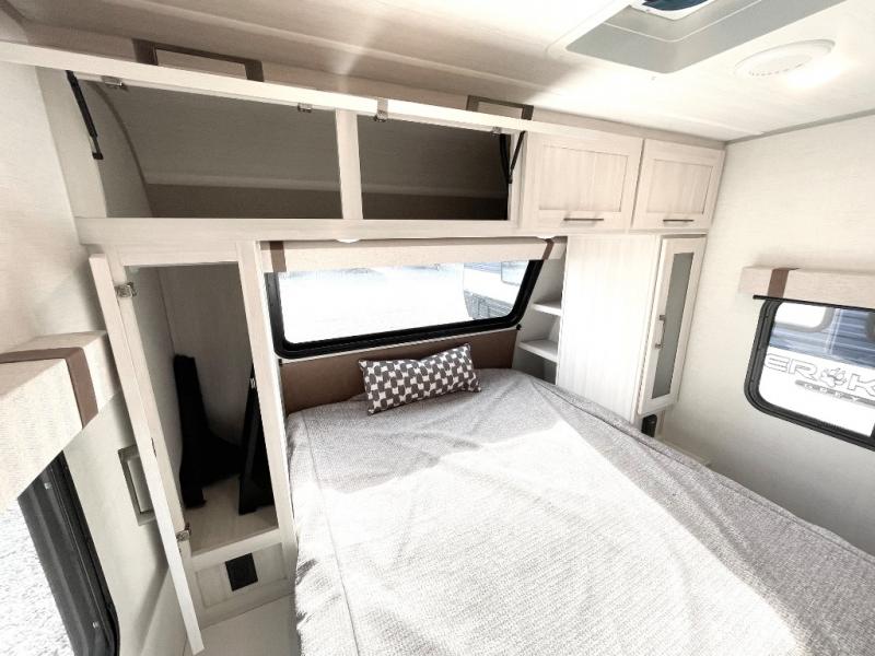 You'll love camping in this couple's trailer! There is a queen bed in the front bedroom, along with dual bedside wardrobes and overhead storage for clothes, books and more. And don't overlook the spacious walk-thru bath! Once you've made breakfast in the rear kitchen or on the outside kitchen, you can dine at the bar top with chairs and a flip-up window. There is also a Trailgate Outdoor Bar if you decide to dine outdoors!