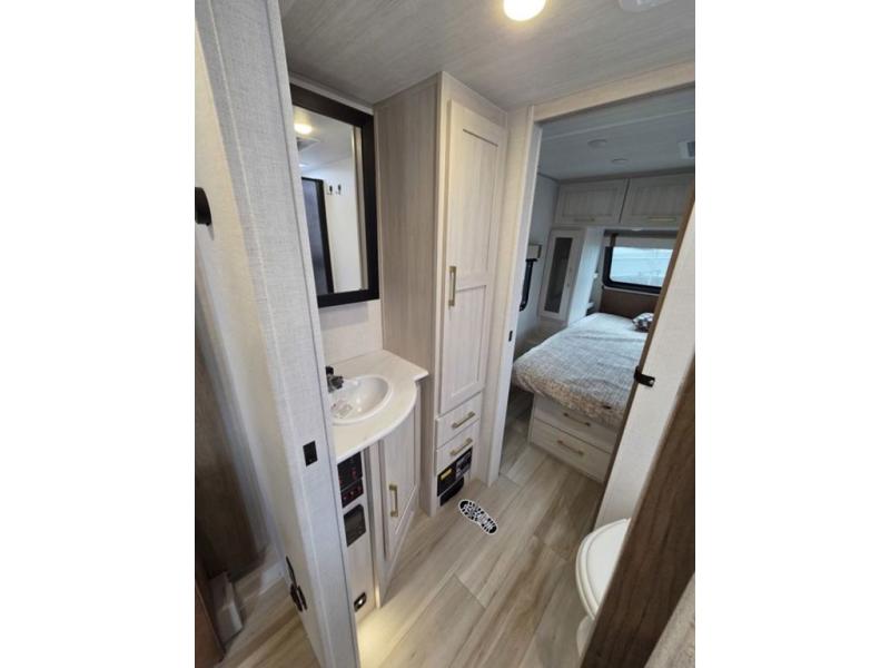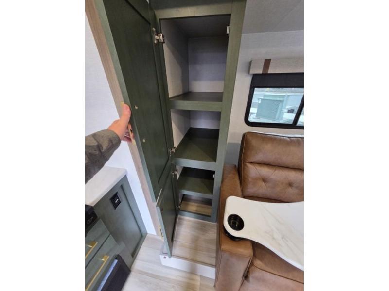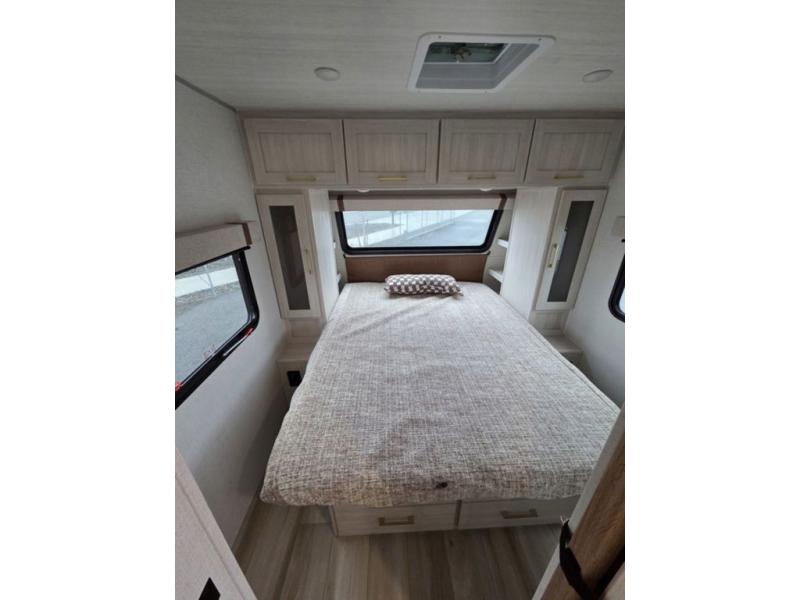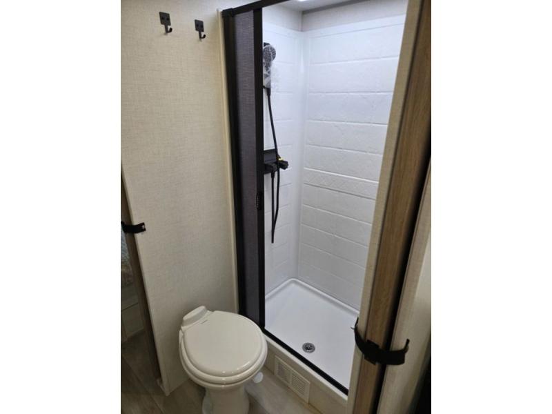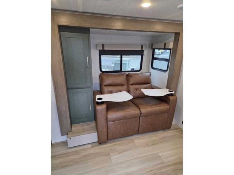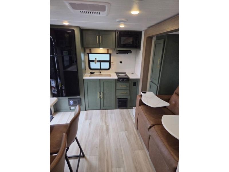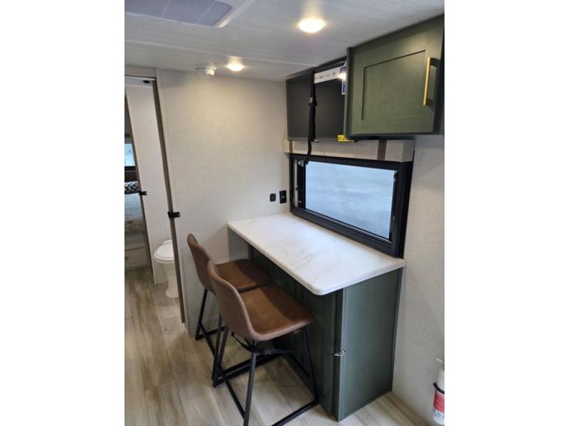 You'll love camping in this couple's trailer! There is a queen bed in the front bedroom, along with dual bedside wardrobes and overhead storage for clothes, books and more. And don't overlook the spacious walk-thru bath! Once you've made breakfast in the rear kitchen or on the outside kitchen, you can dine at the bar top with chairs and a flip-up window. There is also a Trailgate Outdoor Bar if you decide to dine outdoors!